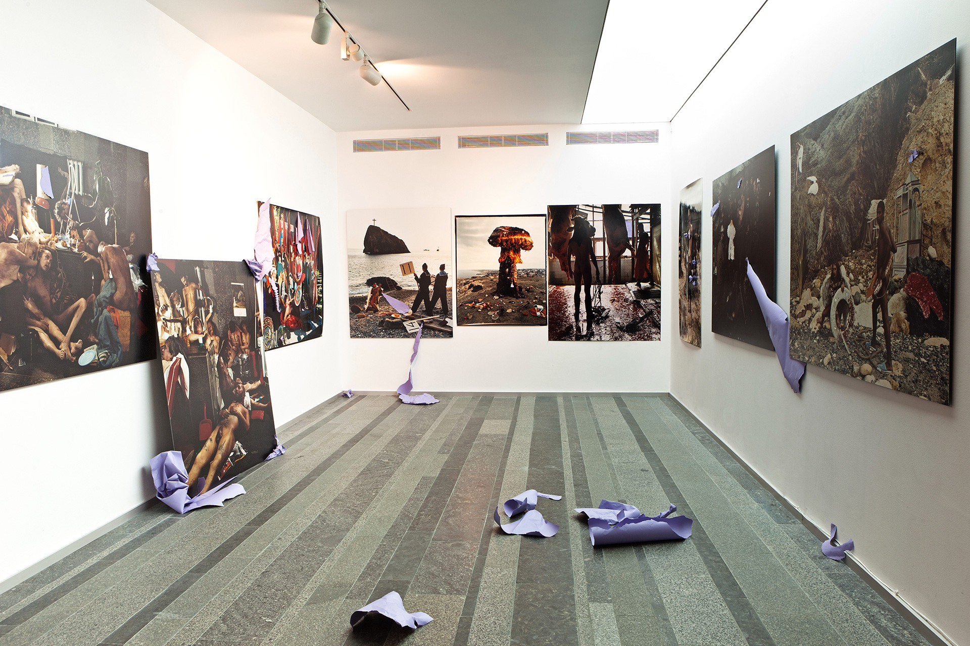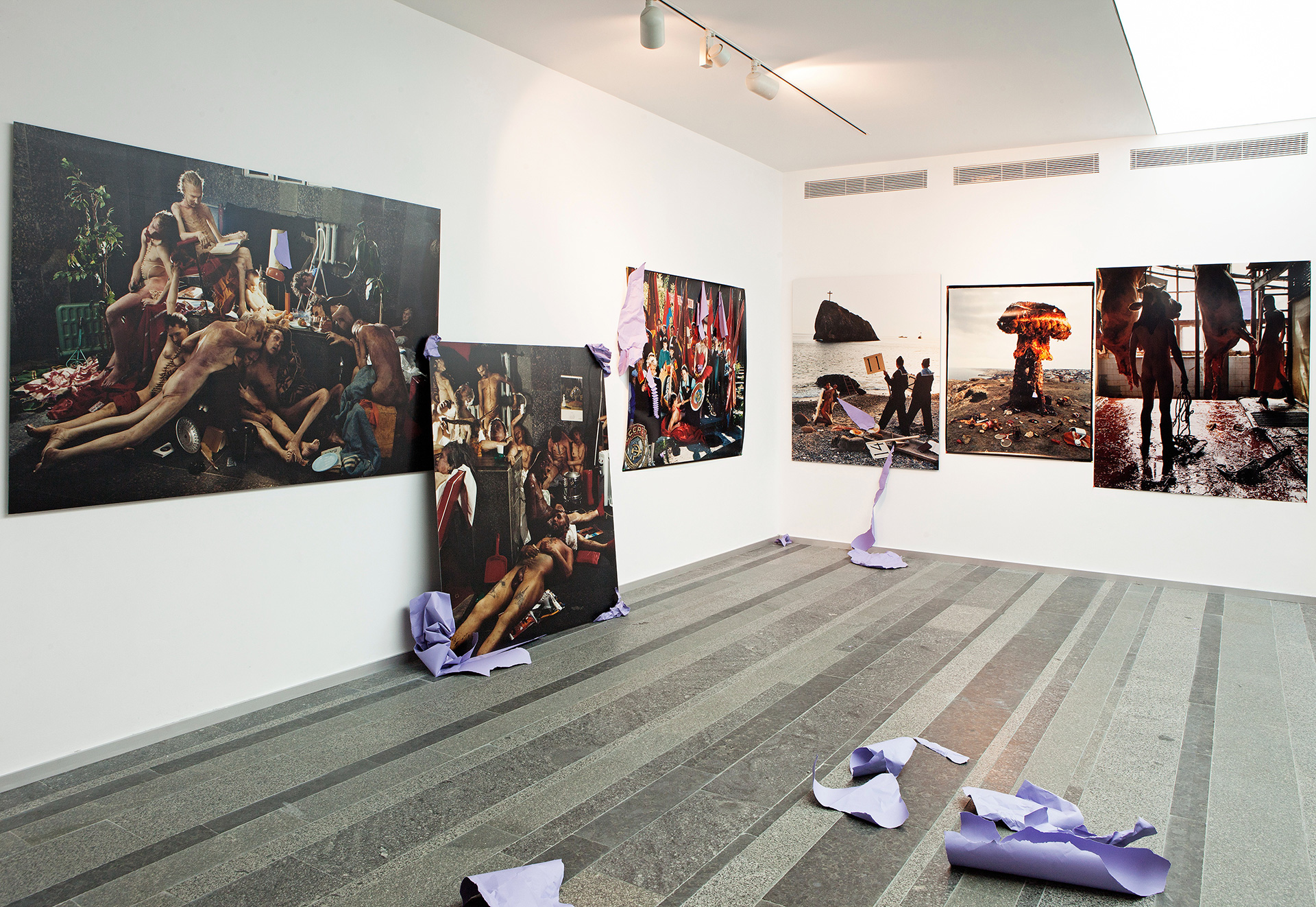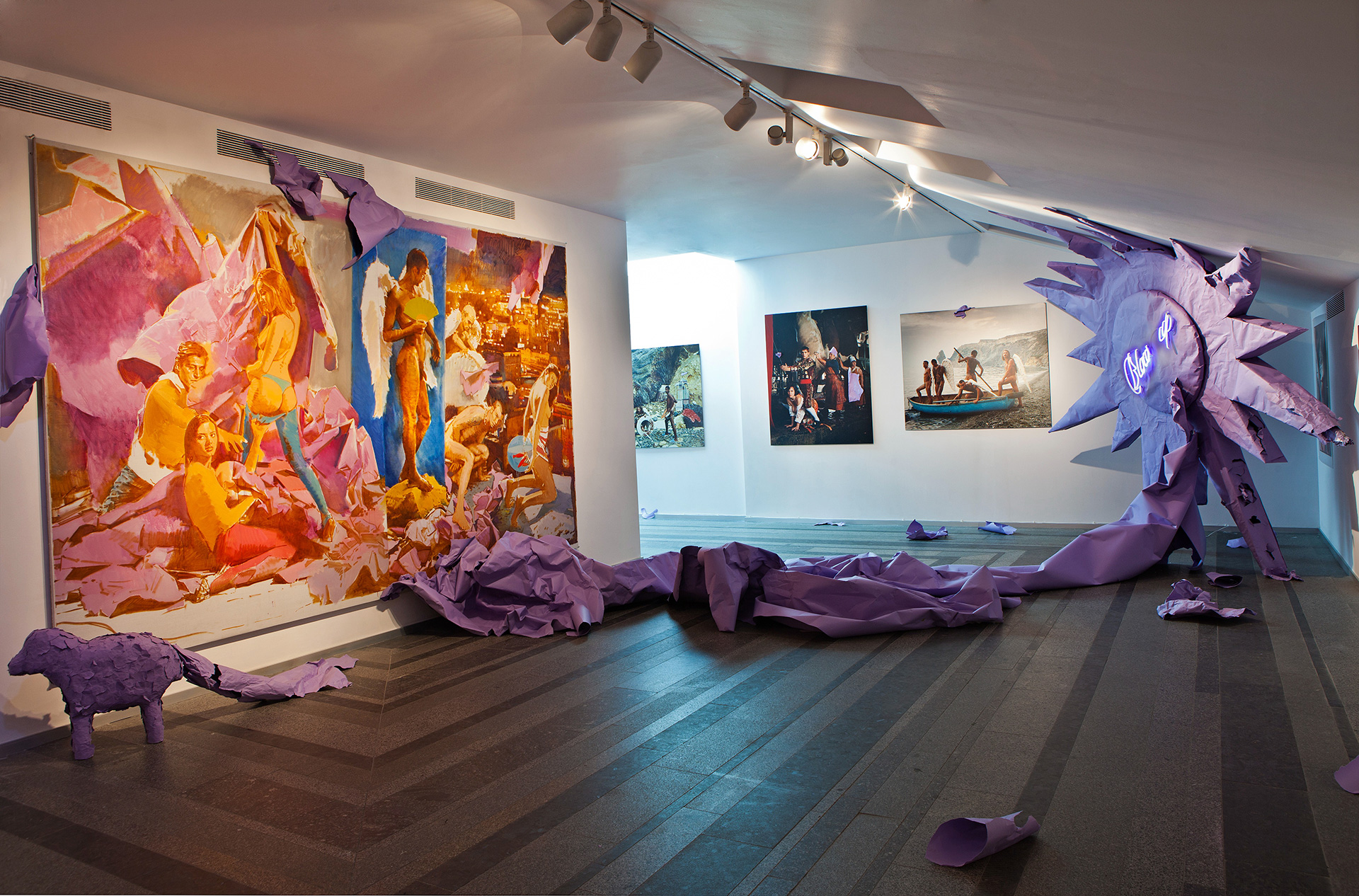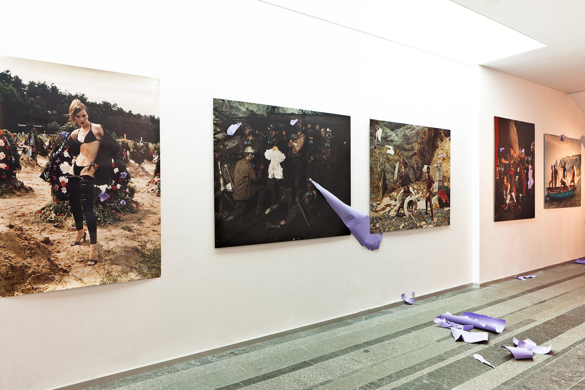 Two strange sculptural objects, a see star, supporting the roof from tumbling in and a lamb entailing a long iconographical history, are made from purple paper, reminding a short scene of the film “Blow Up”. The paper holds Savadov’s collage together both literally and symbolically, referring to a deep desire of freedom through sexuality and dissident behaviour.