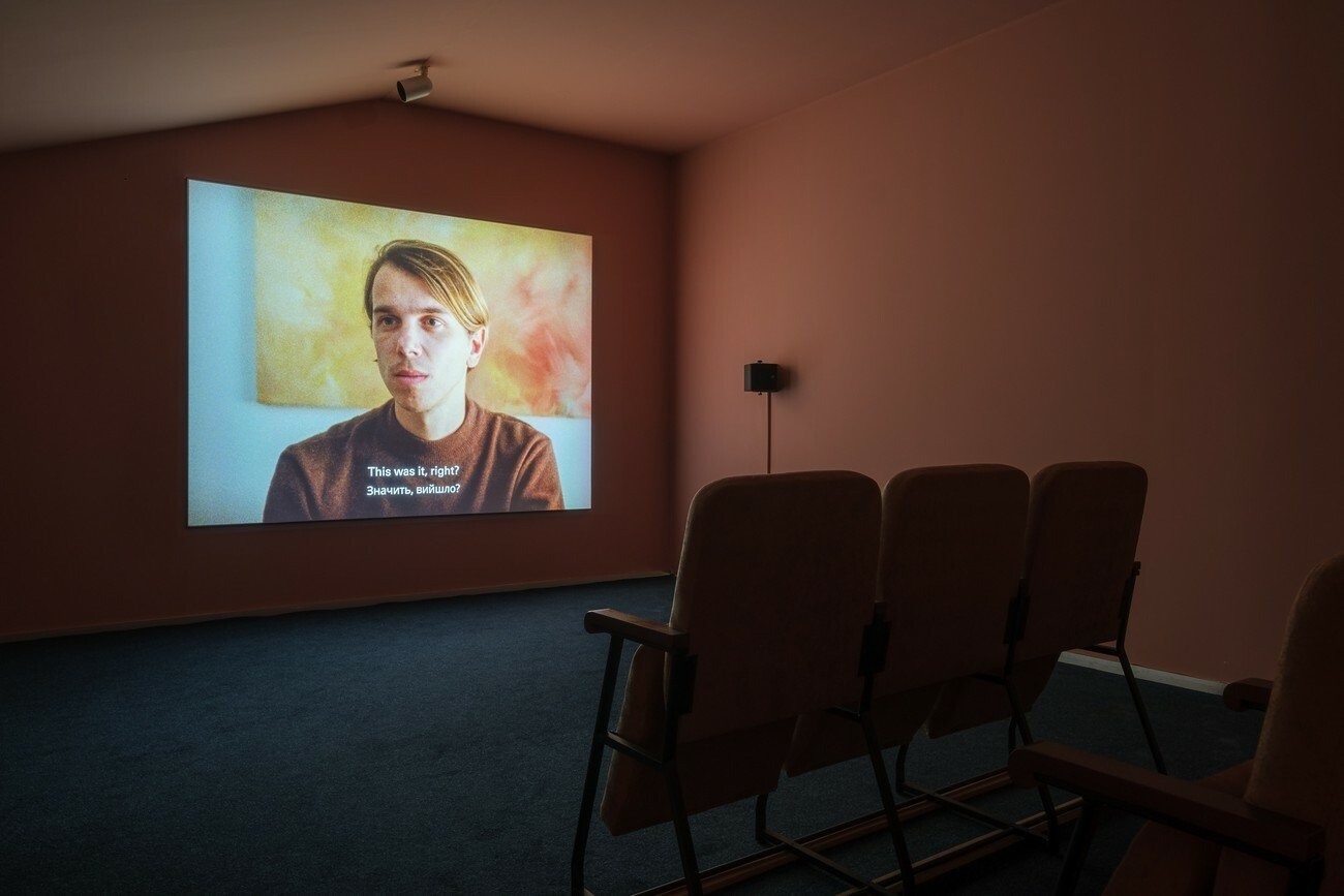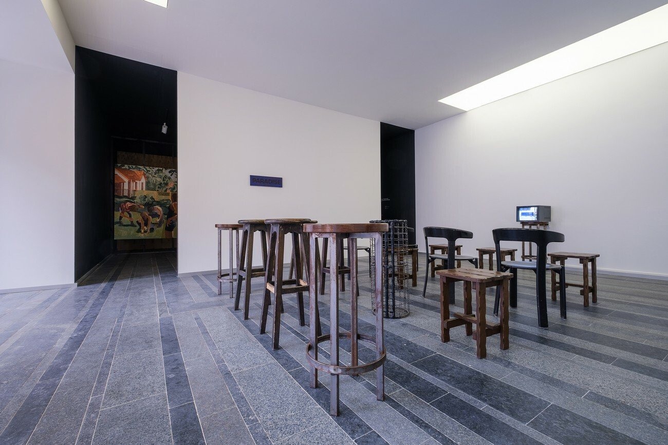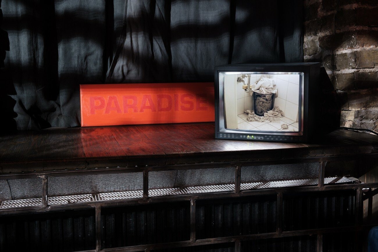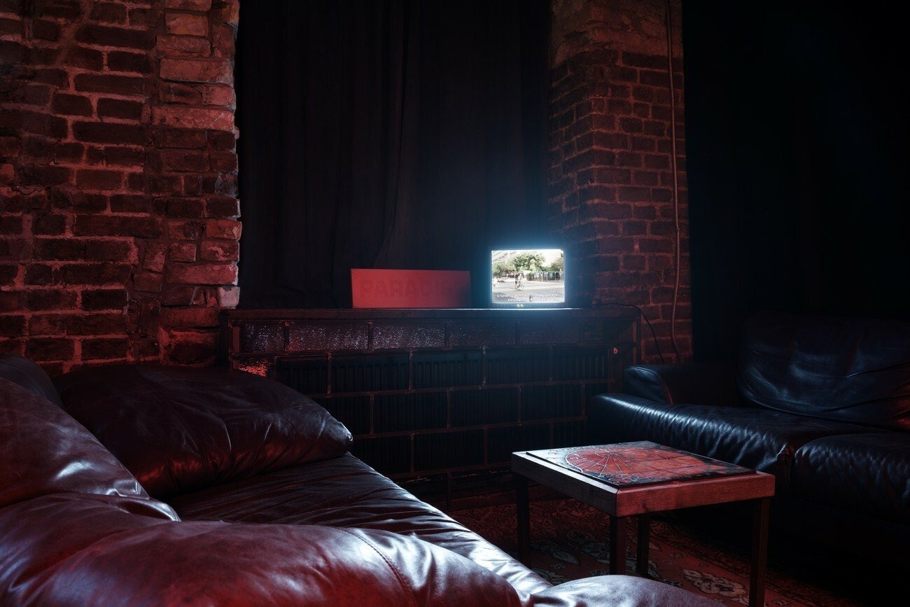 For the project, the artists collaborated with four Kyiv-based bars and clubs, which host monitors playing two episodes of Paradise on loop for the duration of the exhibition. As an act of sharing, pieces of furniture from these spaces have been swapped with furniture from TV, and are presented in PinchukArtCentre as seating for the screening of a trailer for Paradise.