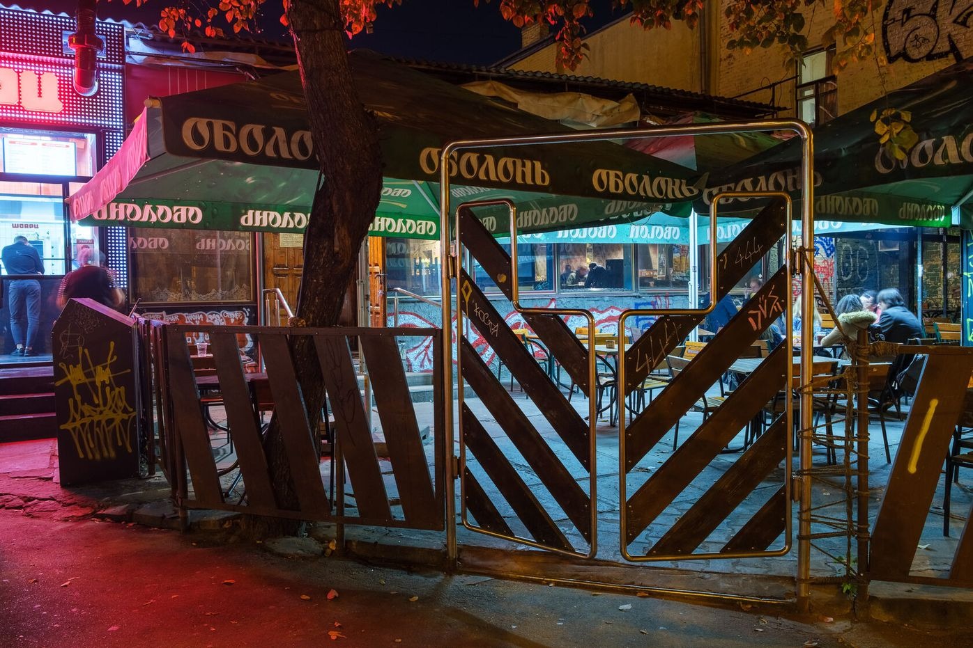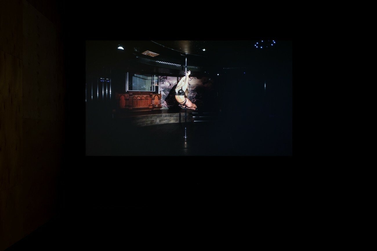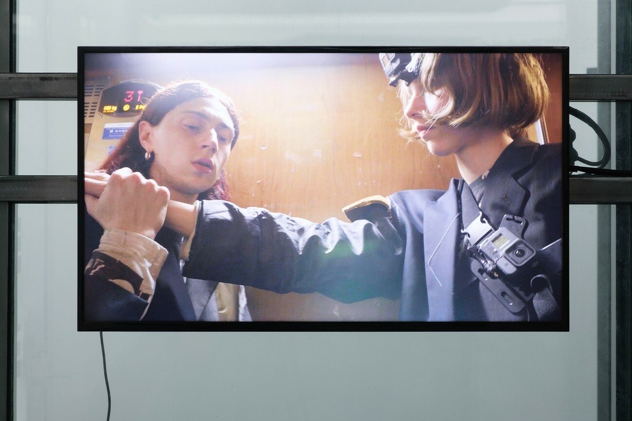 For the project, the artists collaborated with four Kyiv-based bars and clubs, which host monitors playing two episodes of Paradise on loop for the duration of the exhibition. As an act of sharing, pieces of furniture from these spaces have been swapped with furniture from TV, and are presented in PinchukArtCentre as seating for the screening of a trailer for Paradise.