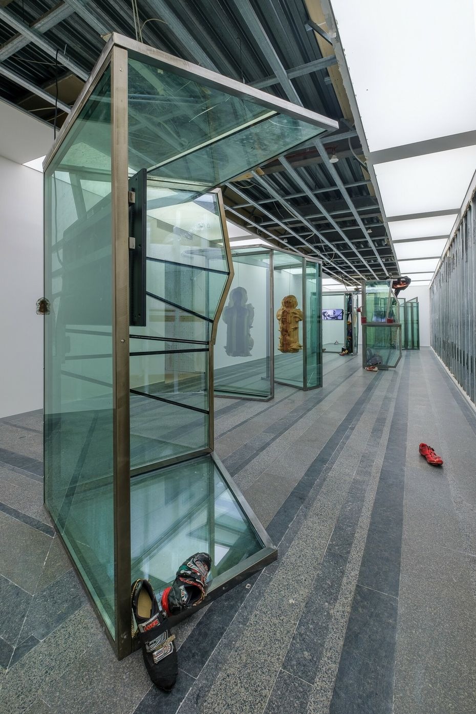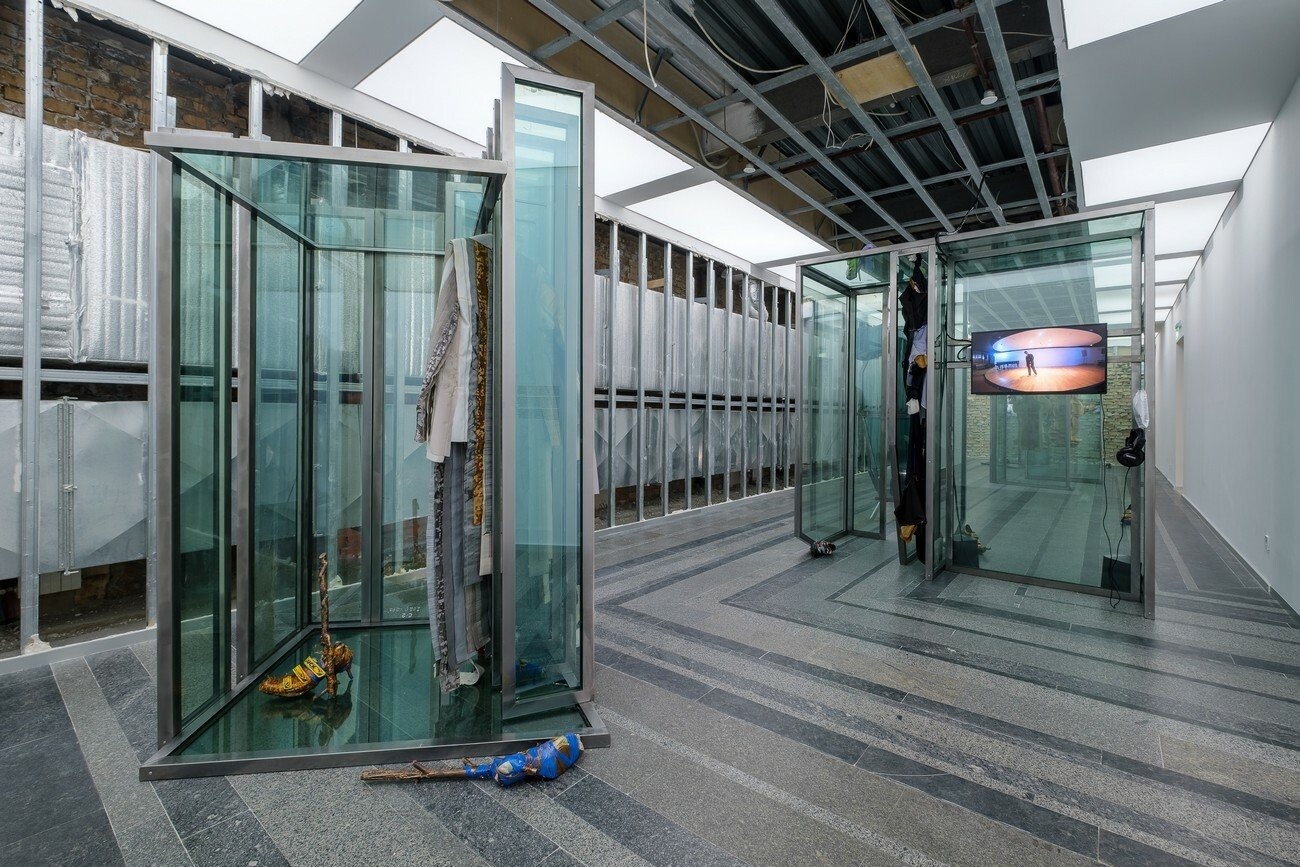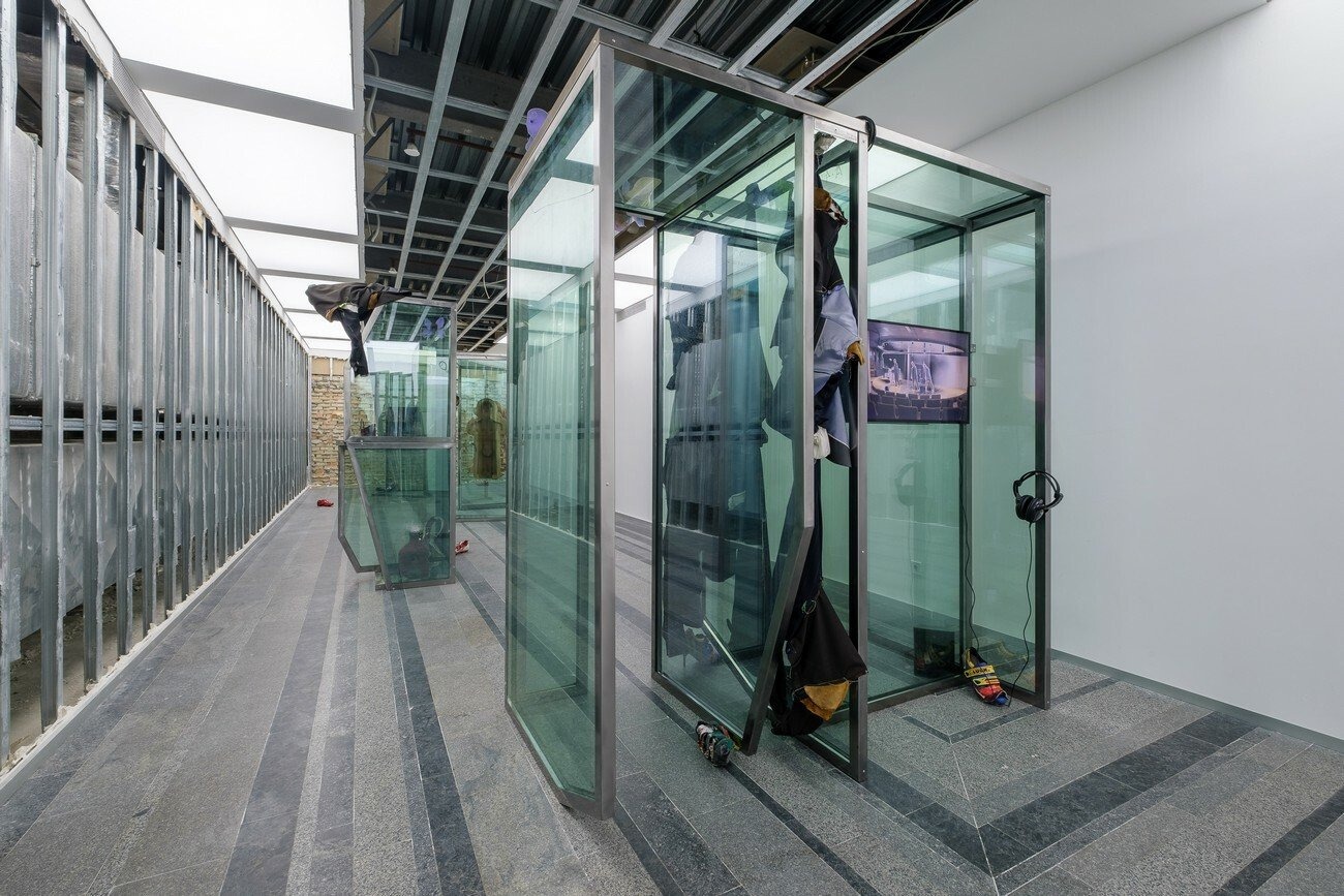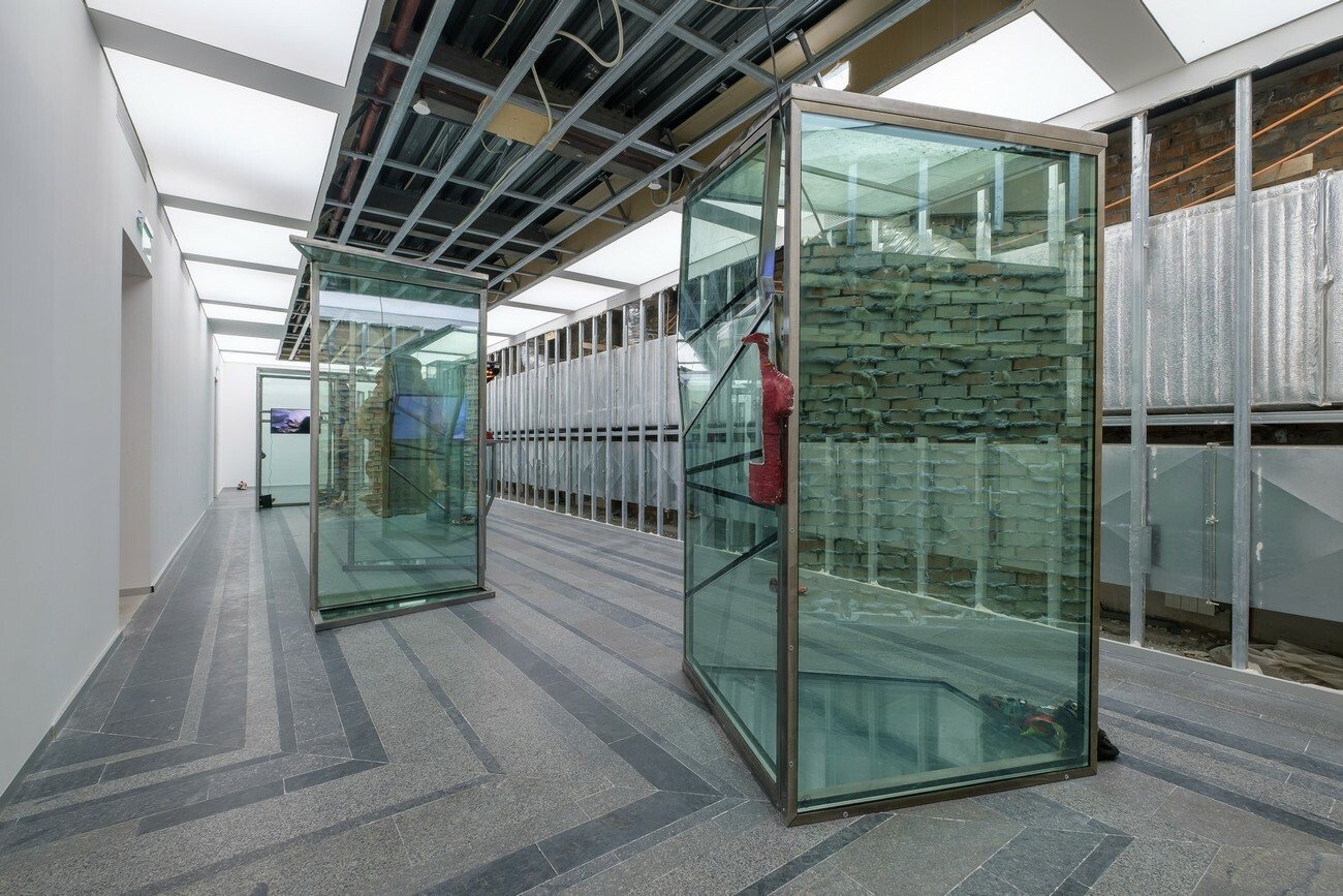 Agata Ingarden’s installation consists of architecture made out of windows, retrieved from an office building in Kyiv. Multiple types of objects appear in these forms such as wooden molds, bronze sculptures, textile suites of two designs, modified cycling shoes, and video screens. The room itself has been stripped from its white plasterboard and false ceiling, uncovering the ventilation system and the eclectic composition of the innards of the exhibition space. From in between the reflections of the kaleidoscopic, semi-transparent glass systems of elevators, corridors, and basements are revealed, constructing an emotional dimension that exists partly in reality and is partly accessible through video screens.