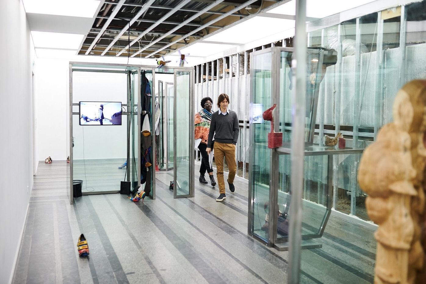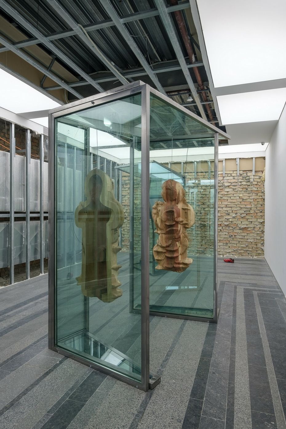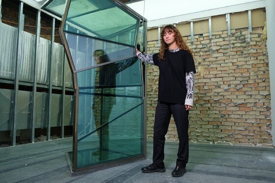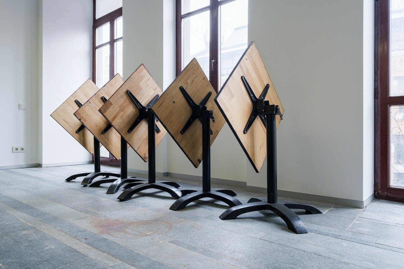 Agata Ingarden’s installation consists of architecture made out of windows, retrieved from an office building in Kyiv. Multiple types of objects appear in these forms such as wooden molds, bronze sculptures, textile suites of two designs, modified cycling shoes, and video screens. The room itself has been stripped from its white plasterboard and false ceiling, uncovering the ventilation system and the eclectic composition of the innards of the exhibition space. From in between the reflections of the kaleidoscopic, semi-transparent glass systems of elevators, corridors, and basements are revealed, constructing an emotional dimension that exists partly in reality and is partly accessible through video screens.