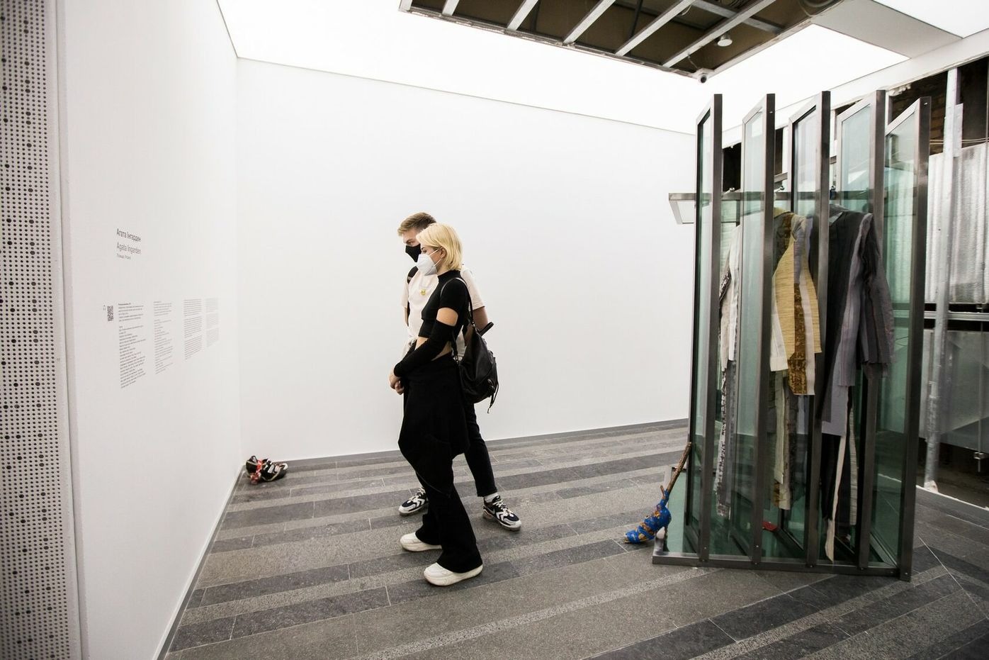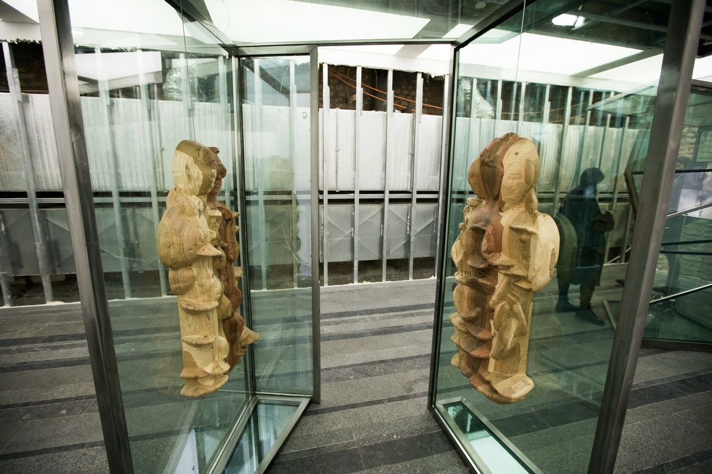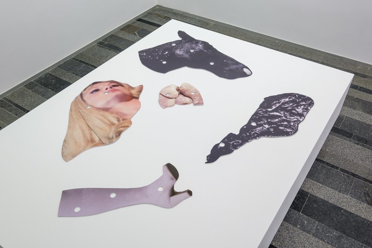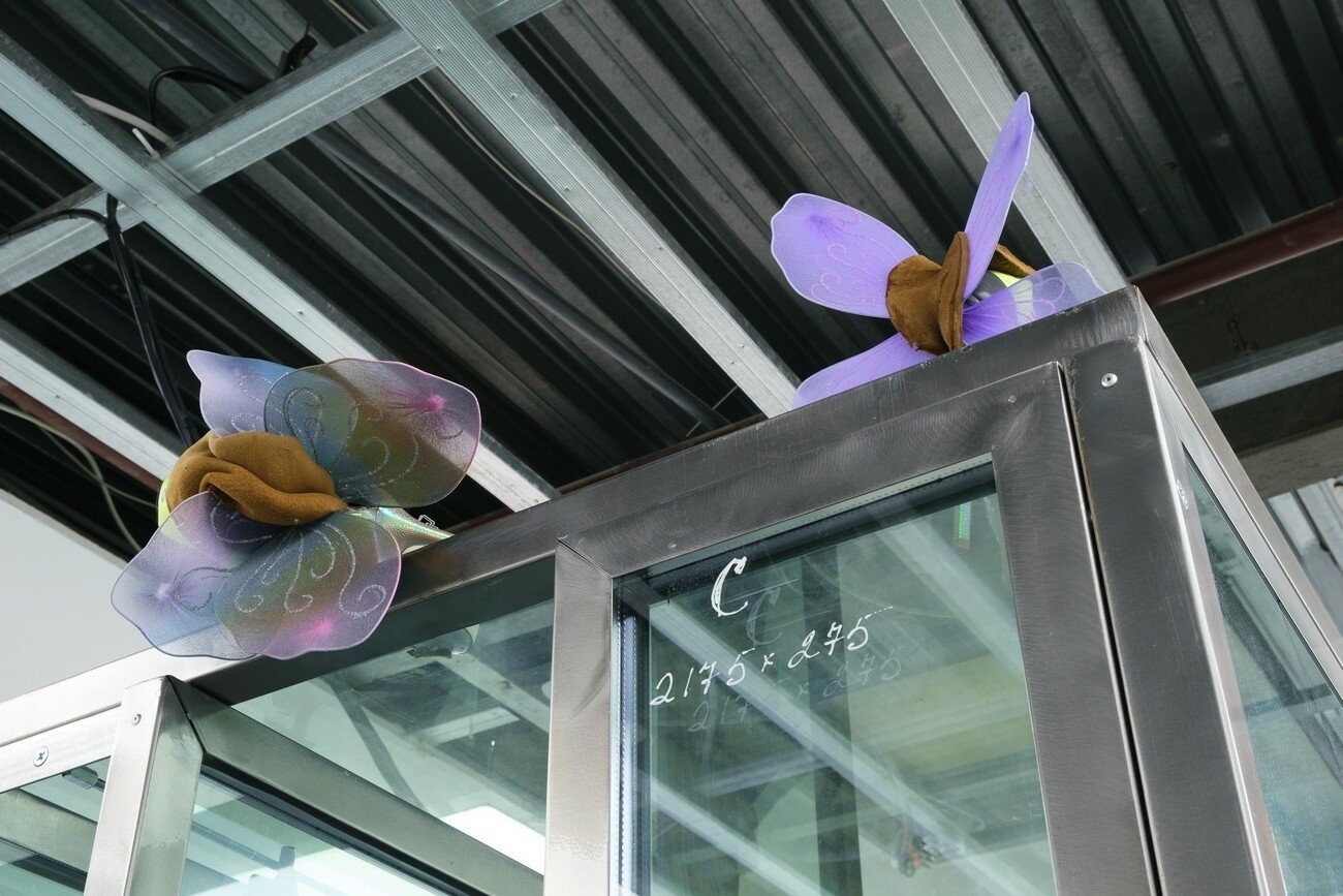 Agata Ingarden’s installation consists of architecture made out of windows, retrieved from an office building in Kyiv. Multiple types of objects appear in these forms such as wooden molds, bronze sculptures, textile suites of two designs, modified cycling shoes, and video screens. The room itself has been stripped from its white plasterboard and false ceiling, uncovering the ventilation system and the eclectic composition of the innards of the exhibition space. From in between the reflections of the kaleidoscopic, semi-transparent glass systems of elevators, corridors, and basements are revealed, constructing an emotional dimension that exists partly in reality and is partly accessible through video screens.