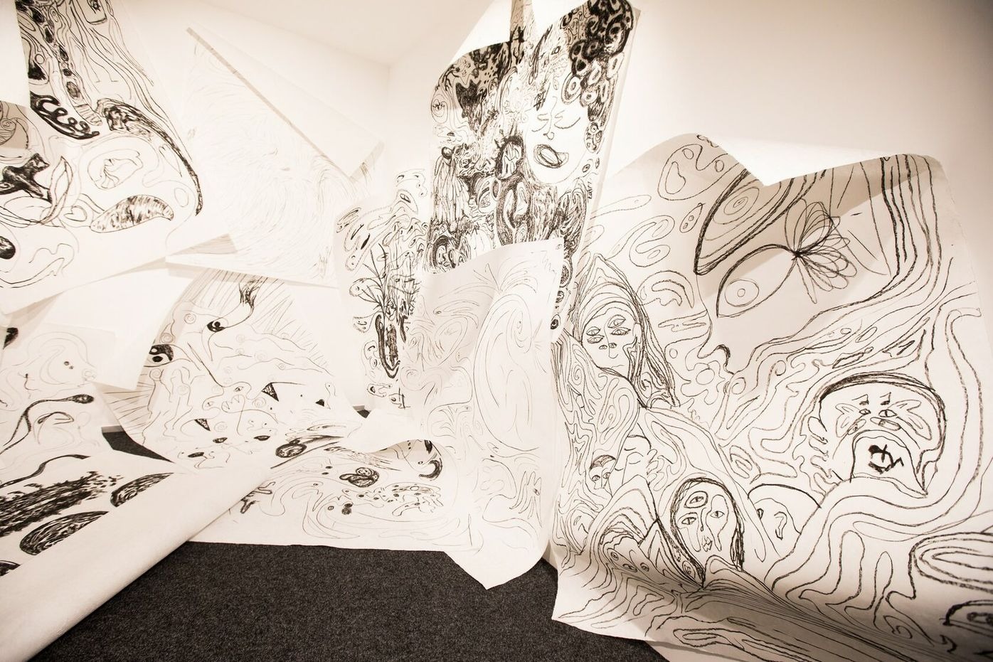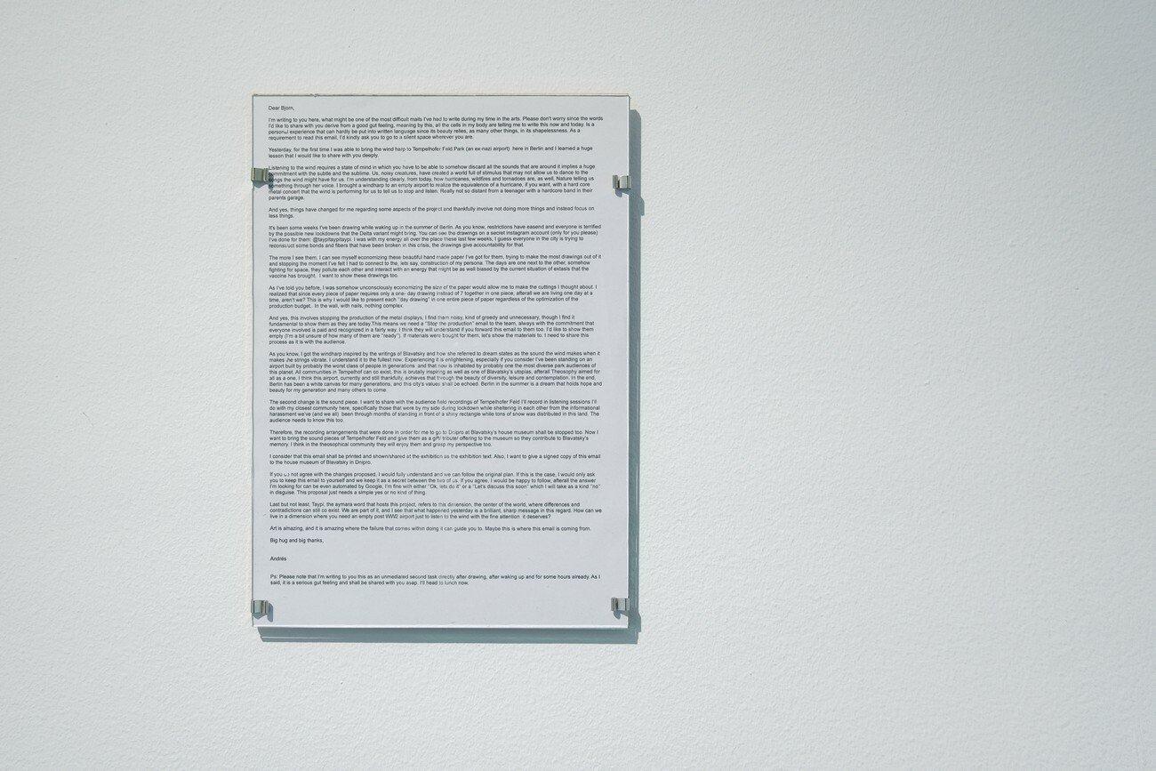 A sound piece, echoing in the space, presents recordings made by a wind harp that was specially produced for the project. It is capturing the moments of silence and sound, vibrance and resonance in Tempelhofer Feld, from the window of the artist’s bedroom and near the canal close to his apartment. Both elements — drawings and sound — dance together in a state of randomness that includes the potential of learning such a state brings.
