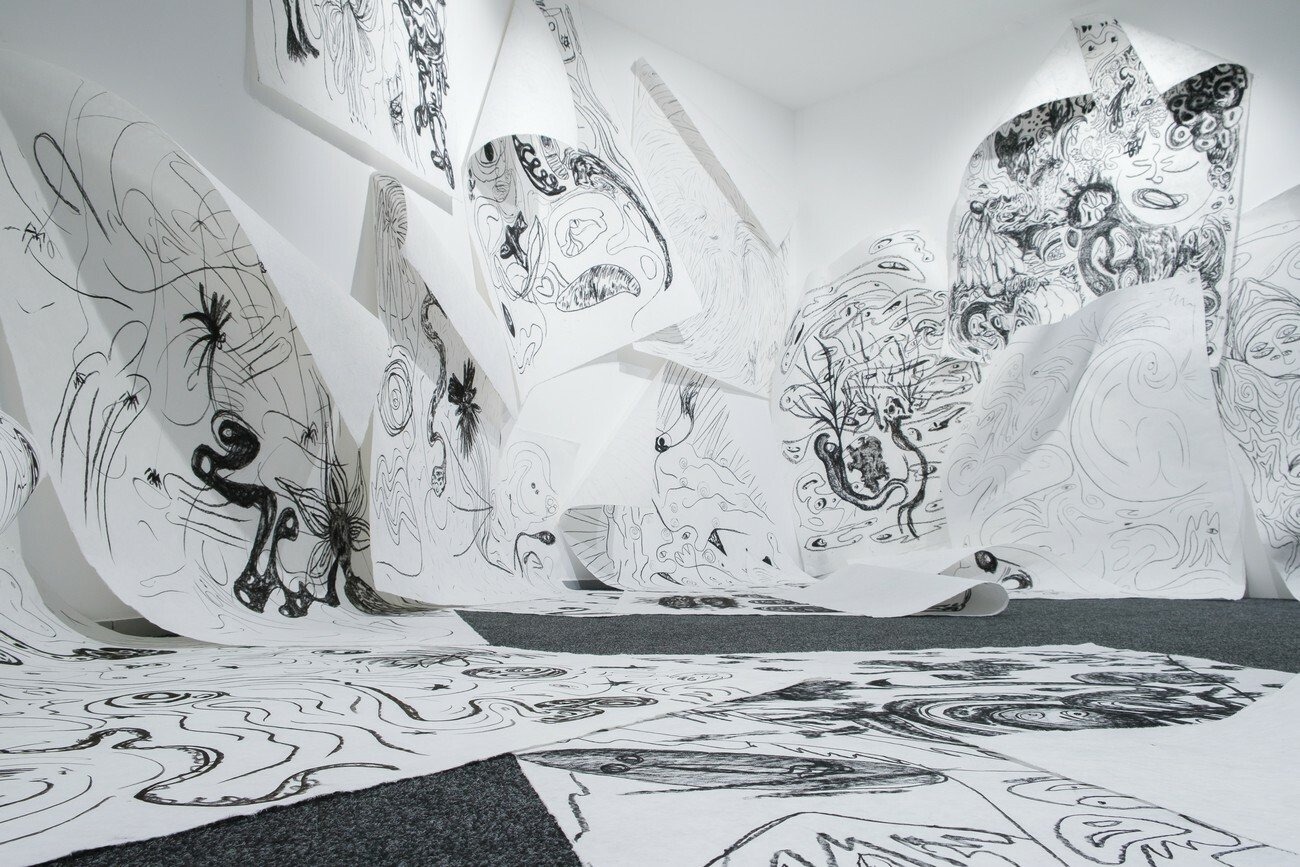 In the practice of Minia Biabiany, drawing within space represents a thinking process and a way to interact with one’s perception in an active and guided way. For the Future Generation Art Prize 2021, she presents an onsite installation directing the circulation of the spectator through the room. How is the perception of the space shaped by our own story, both externally, as in the movement of the body through it, and internally, as in the way it is perceived by the body? For several years, the artist has been interested in understanding her own system of forgetting and its relationship with the land in which she lives. Referring to the history of Guadeloupe, she investigates the traces of the plantation slavery system within her, as well as the tools available for recreating relationships with the territory and context in spite of its present day colonial situation — a Caribbean archipelago still controlled by France and actively assimilated into French culture.