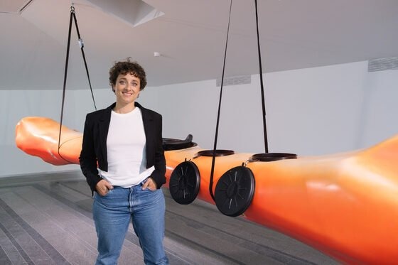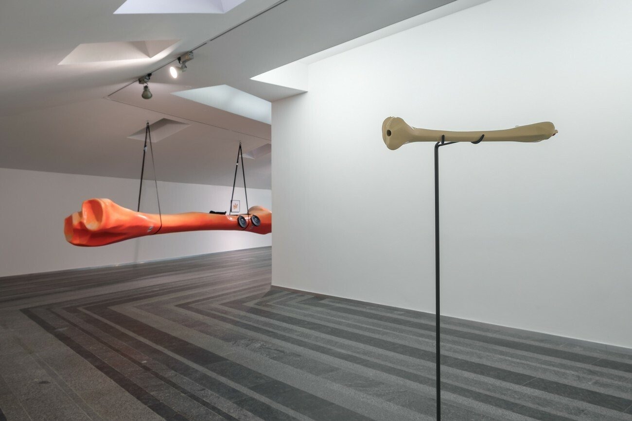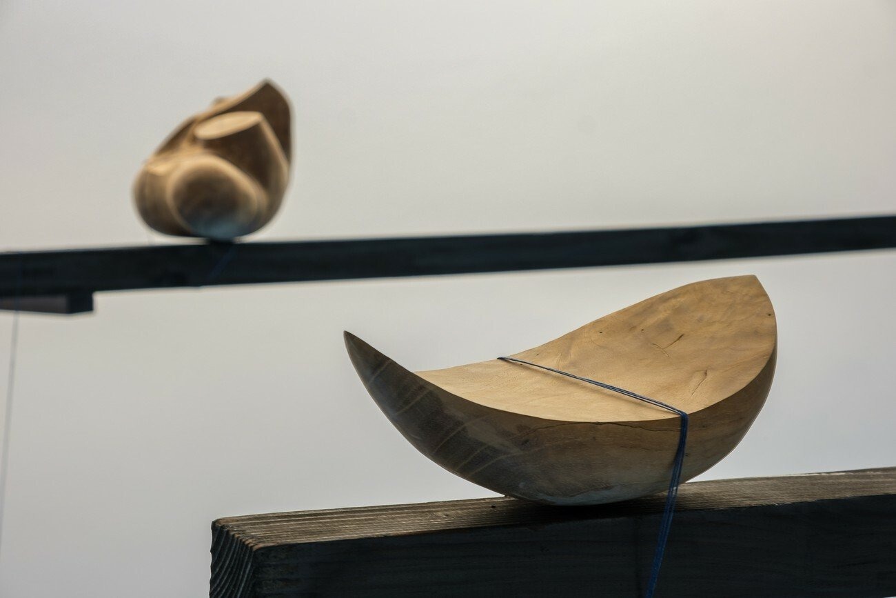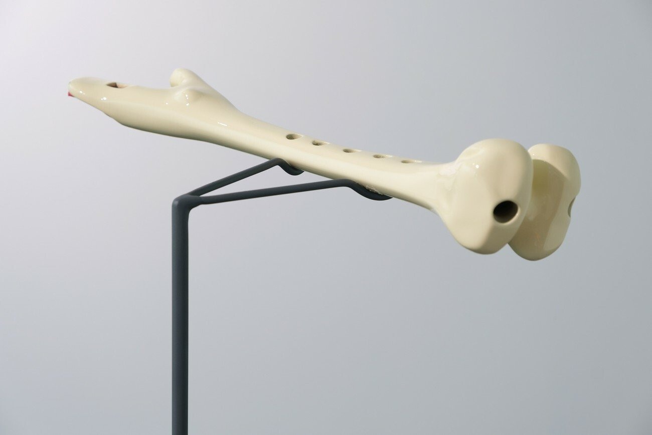 In Amplified wind pattern the artist draws a parallel between bones — as hollowed structures, carriers of tissues, veins and cell communities, message pathways — and kayaks and flutes. The first ones being primitive vehicles of migration, and the second ones connectors of bodies and knowledge. Both of them hollowed and traversed by the wind, both of them emitting an air signal that evokes body fragility over the sea while simultaneously celebrating the human capacity for transition and transformation.