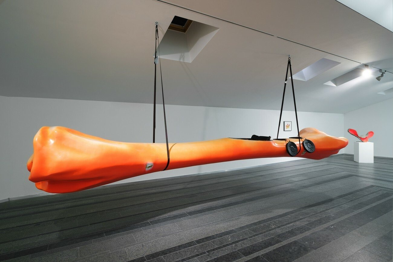 The wooden and bronze objects come from the form of a rescue dummy which is a mannequin used for water rescue training. The wooden molds are populated with 3D scanned tree mushrooms that usually grow parallel to the ground. Here, turning in all directions suddenly they indicate a different or changing point of gravity and at the same time mimic an imaginary system of internal organs. Bronze pieces, covered with red modelling wax on the outside, with polished insides and oxidized edges, resemble armour. Costumes are sewn together from many coatings with visible stitches. Playing with the idea of a mould, Ingarden introduces us to different sculptural shells, referring to the multiplicity of layers.