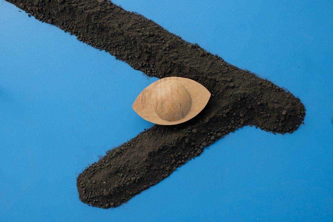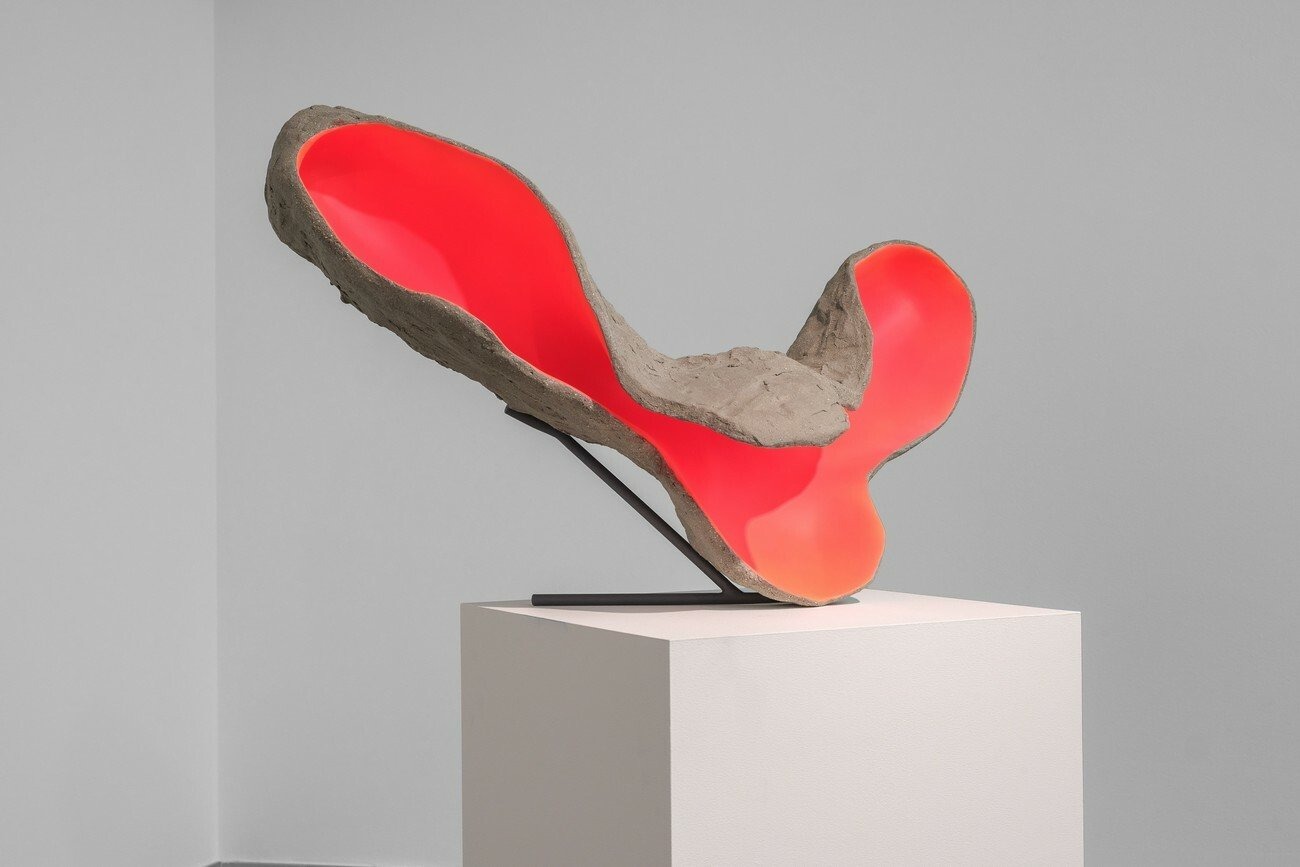 The artist works with pieces that vary in size and materiality: clay, found objects and human symbols coexist in her work. Teresa Solar approaches these relationships from an organic sensibility, as if they were bodily functions, but she also accentuates the complex system of relationships in the industrial world, where hybrid forms of existence that combine organic and synthetic properties are constantly being produced. In Hermaphrodite Solar evokes a not yet fully developed reproductive organ that has been unearthed from the ground and exposed to the public. In contrast to the raw organic exteriors, the interiors are delicately finished and clad in bright colors reminiscent of miners’ overalls or sprays used to mark new tunnels in the underground darkness.