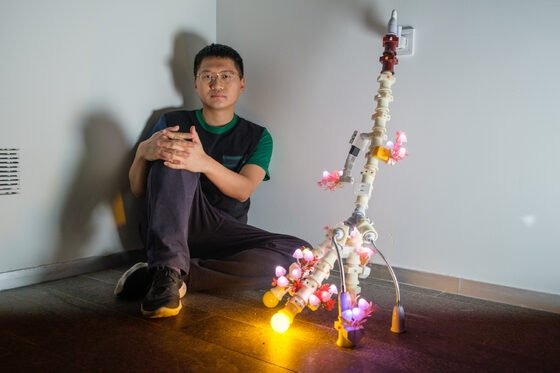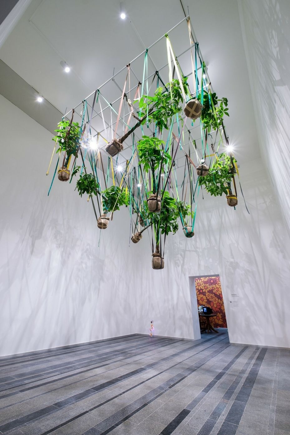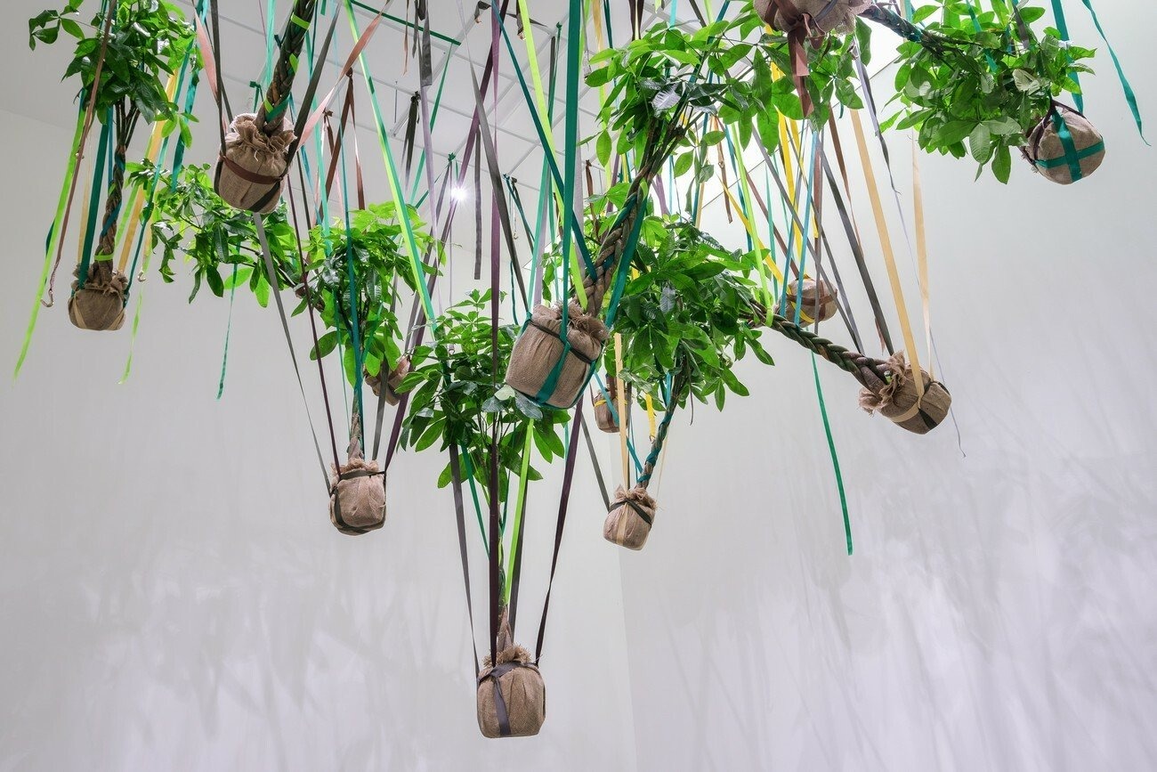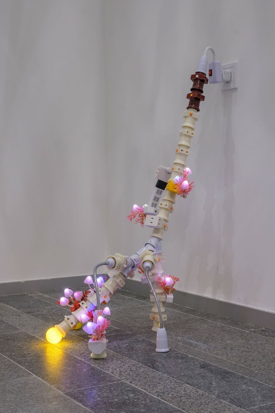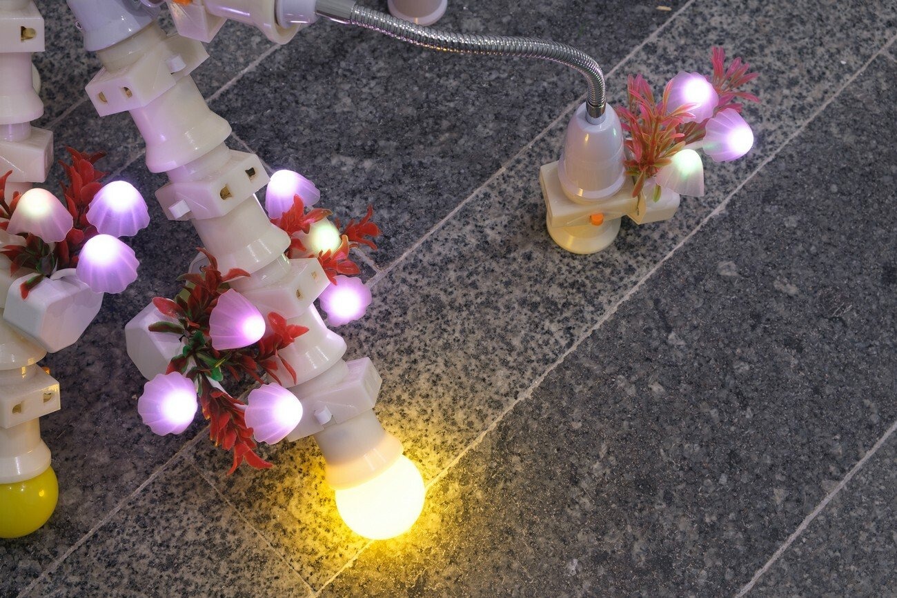 Trevor Yeung creates a site-specific installation, presenting two different works. Mr. Cuddles shows the Pachira-trees hanging from the ceiling by colored straps. Night Mushroom Colon is a smaller-scale object made of several plug adaptors with glowing mushrooms. Working spatially, Yeung combines and contrasts tall suspended plants with a tiny plug-in night light at floor level. The human scale here is a crucial aspect that becomes an opportunity for the audience to feel themselves as a part of the installation and to match the different measurement systems.