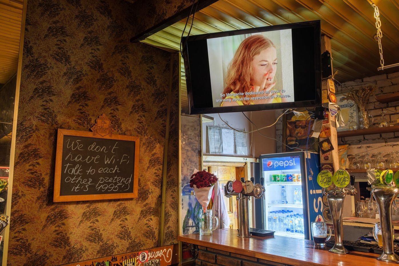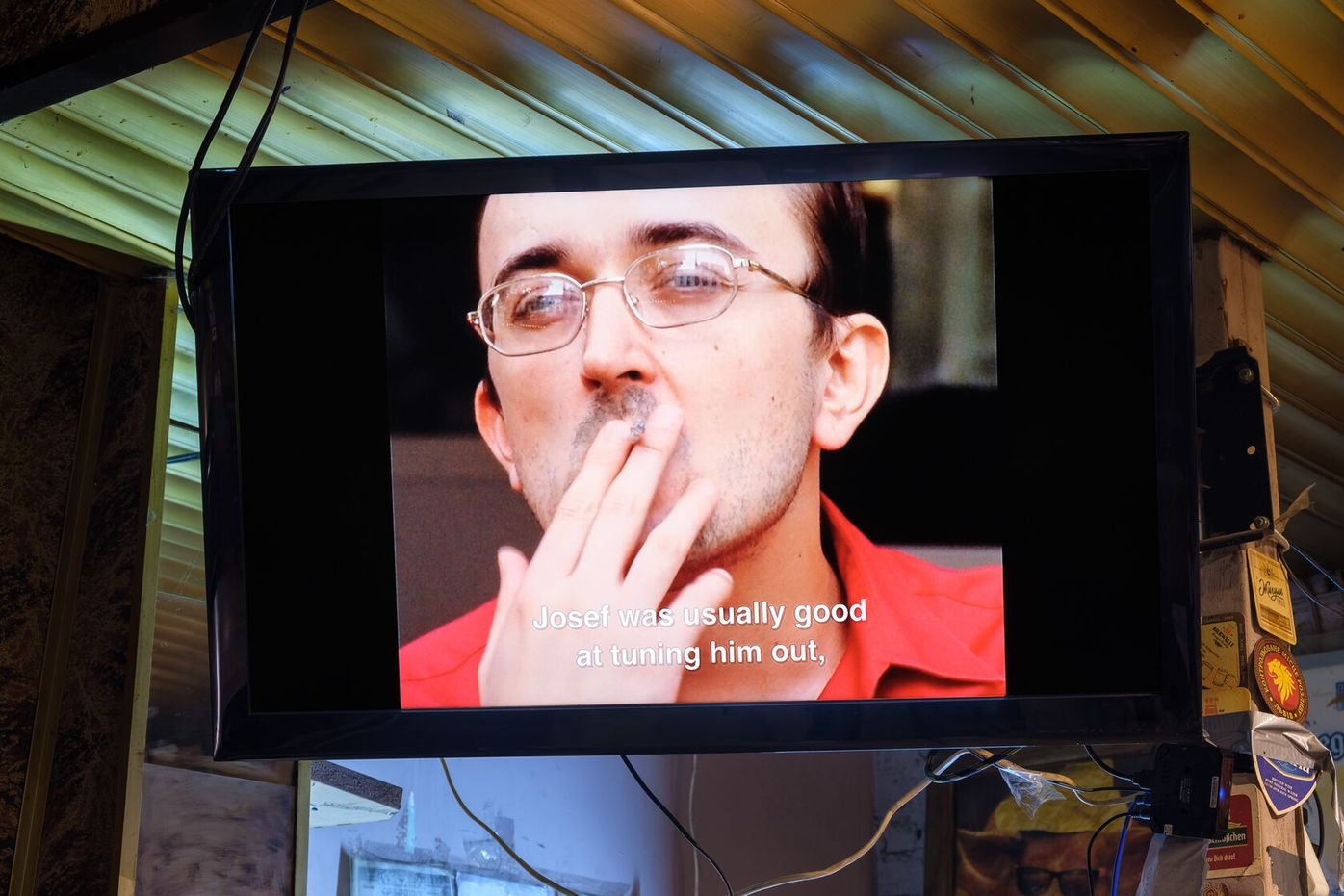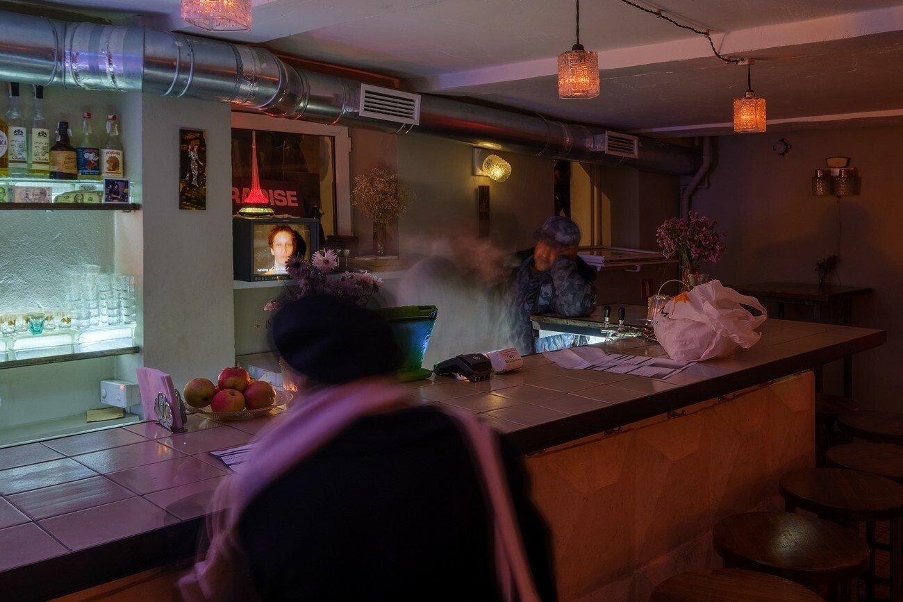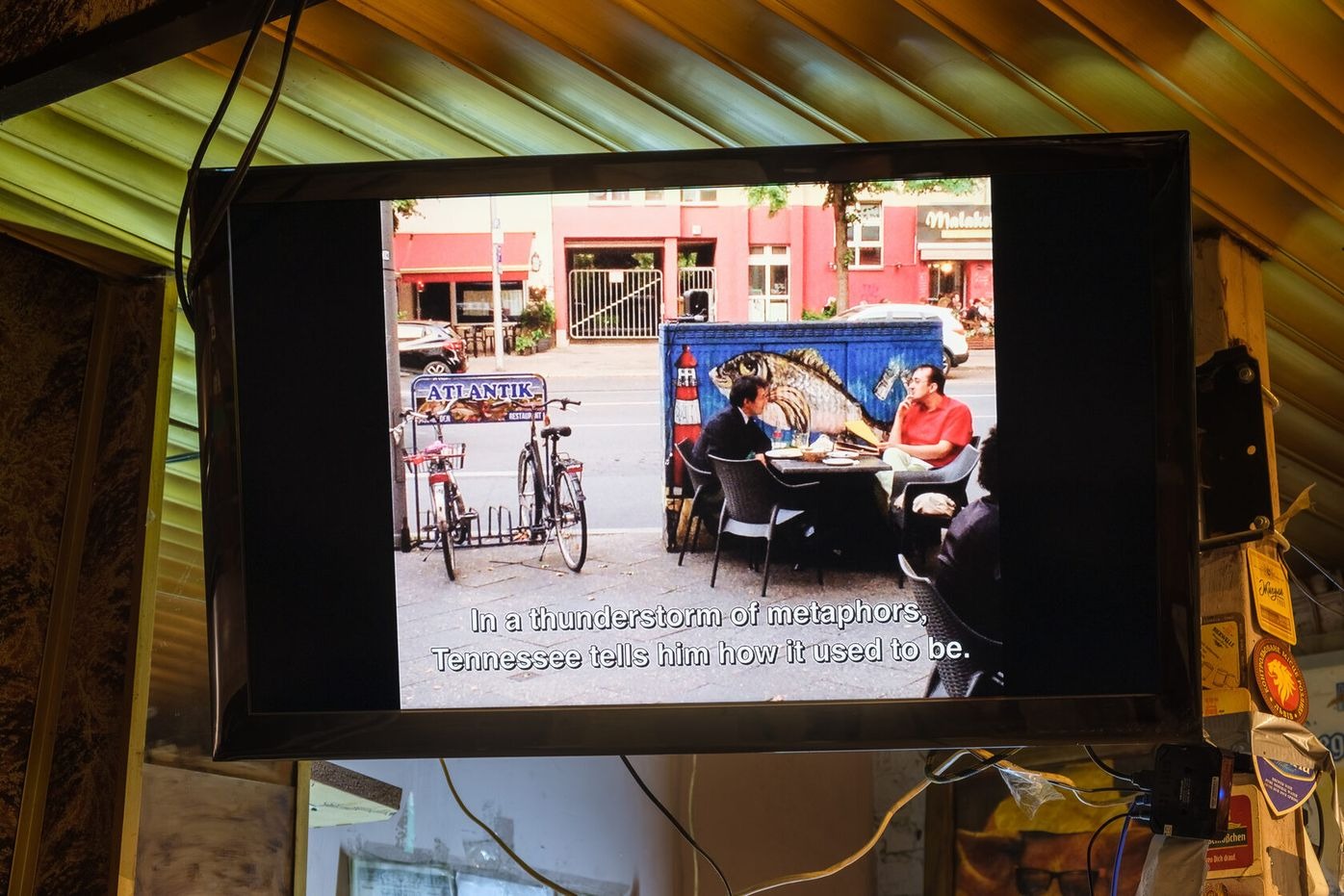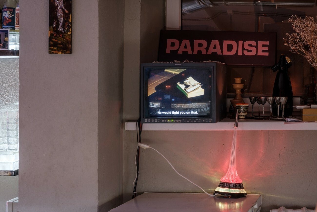 For the Future Generation Art Prize 2021, Henkel and Pitegoff present their ongoing project Paradise, a TV series shot at their own bar, TV, in Berlin, cast with regulars, employees, and neighbours. The plot unfolds in the fictional bar Paradise in 2023, where the bartenders are forced to work as newscasters, following their absent boss’s desire to transform the place into a hyper-local news channel by reading prepared speeches to the bar’s customers via teleprompter. Over the course of the show, the employees attempt to take control over the bar’s narrative.