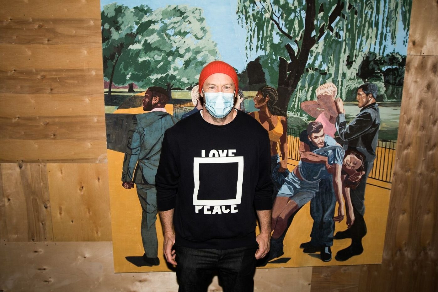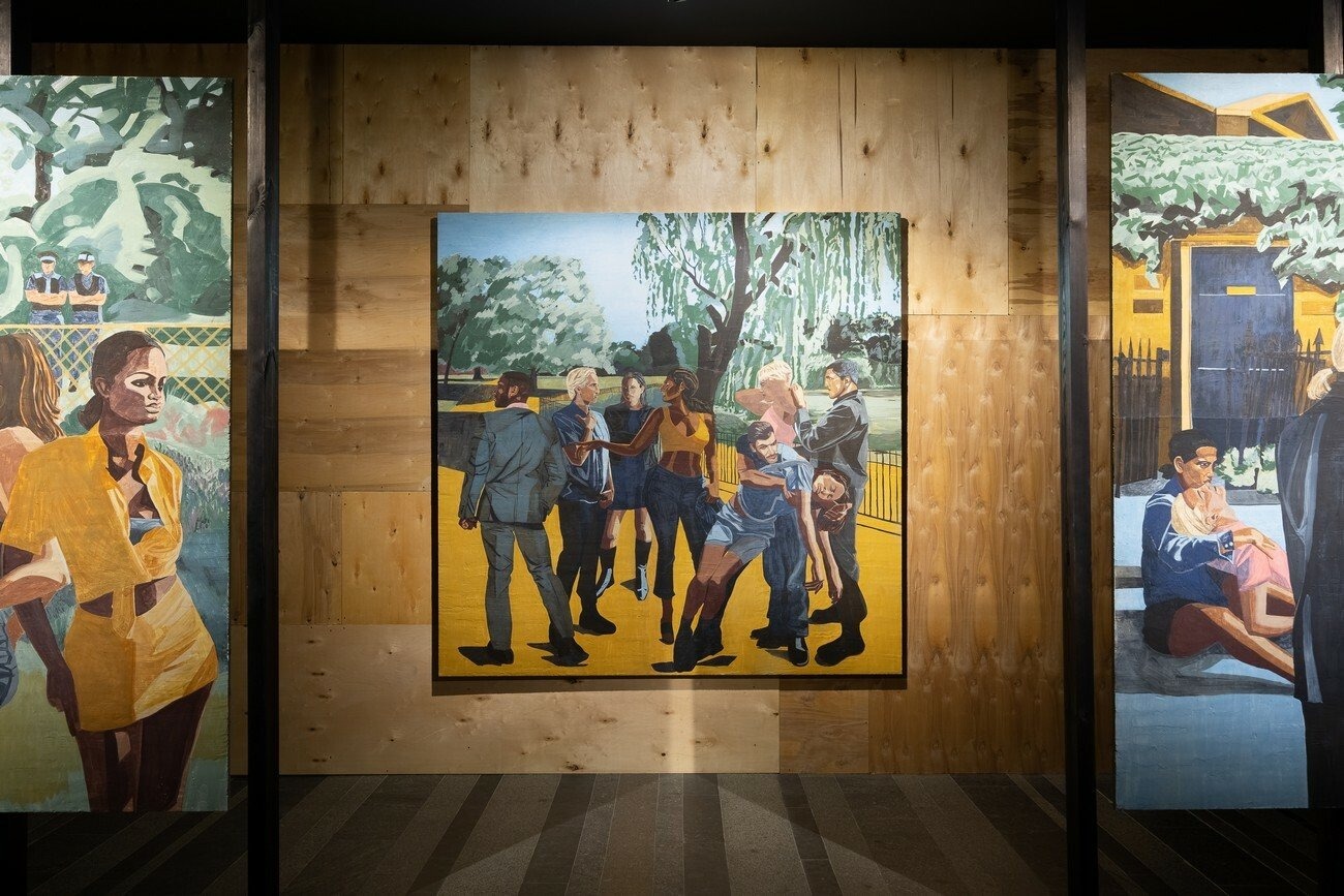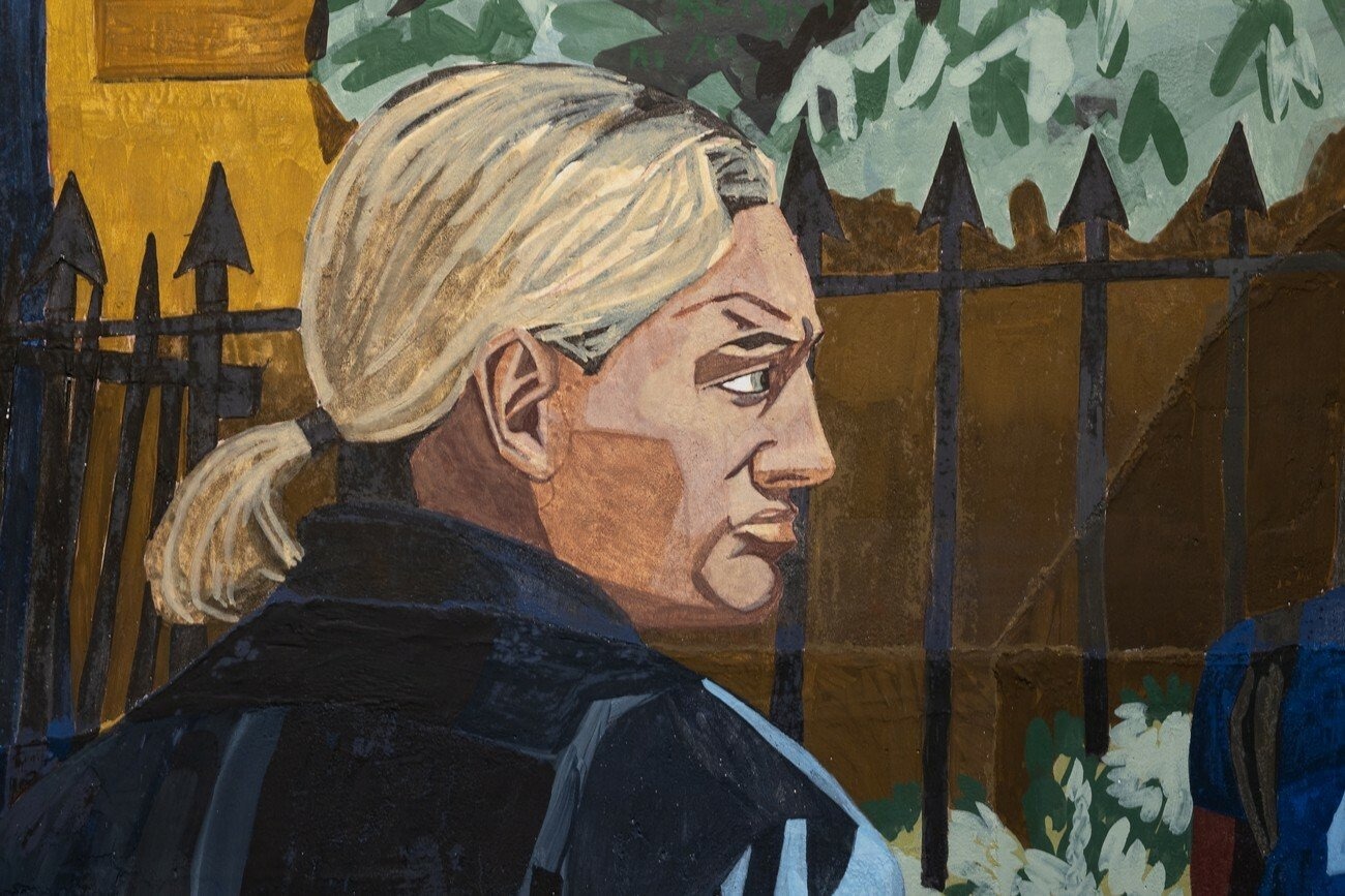 Public Affairs references hate crime legislation and reveals the inequalities between privileged and discriminated groups within the queer community. In this fresco series, the artists reconsider the role fresco has played in society and culture and the balance it strikes between ideology and symbolism. Given that fresco painting is often found in places of political, legal and educational importance, the artists have set these works in central London locations, such as Green Park, a zone of elite power but also the location of Gay Pride parades and a historic cruising ground for gay men. In these works, the artists depict images that represent this unruly clash of registers, such as the disciplining power of the state and the rebellious energy of the people who gather in these spaces.