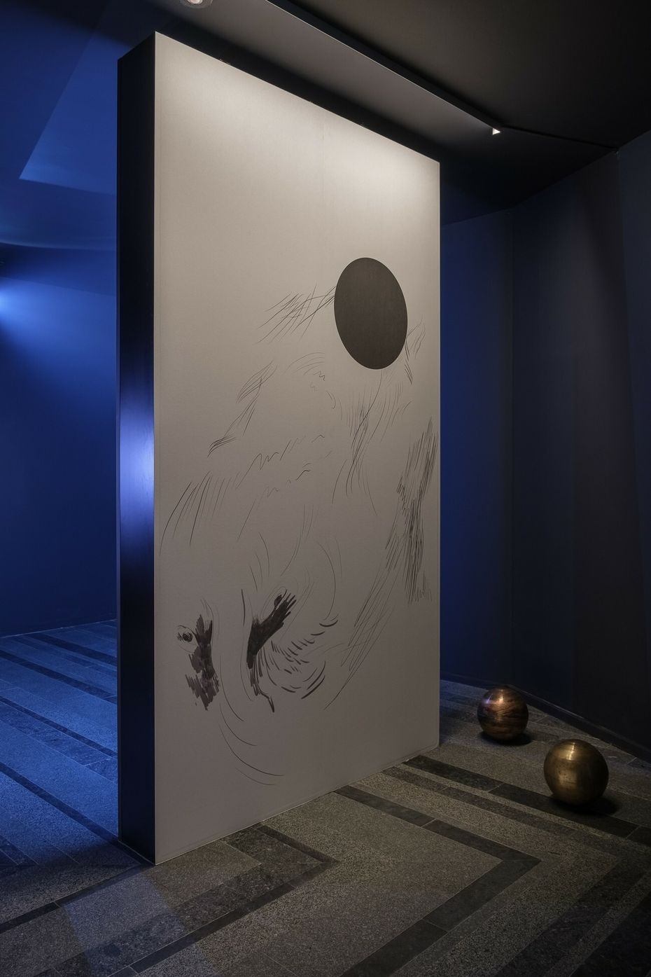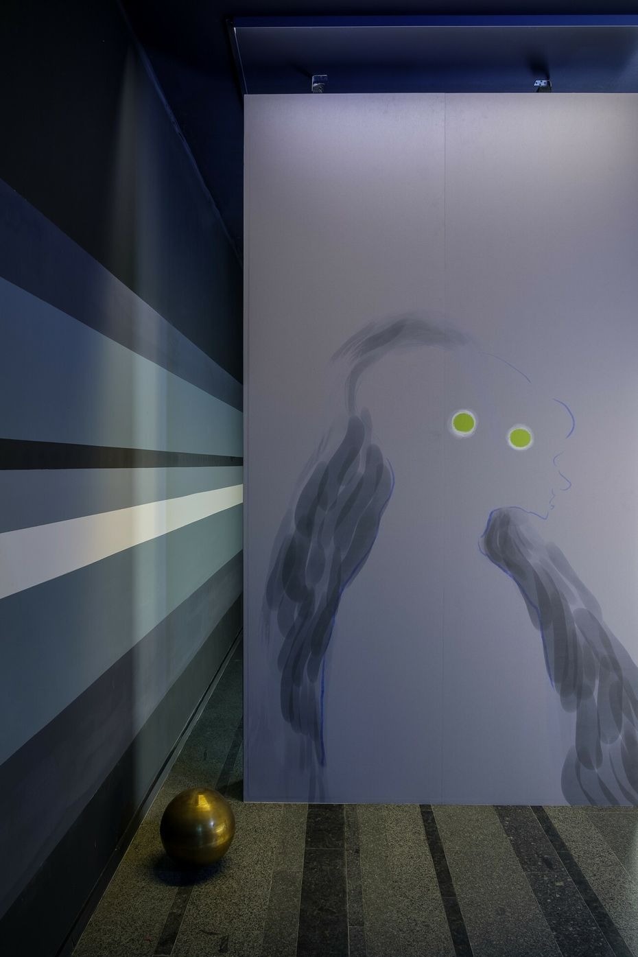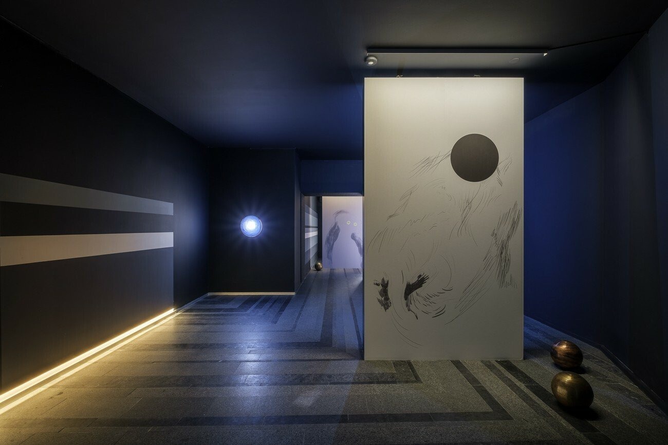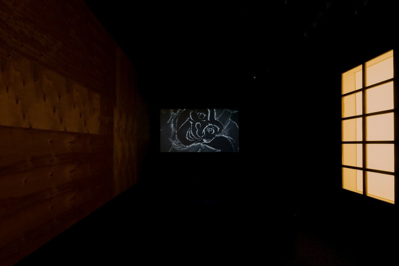 While a dancing figure appears and disappears repeatedly on screen, words are mumbled, a couple of wall drawings depict ghostly beings and metallic planets punctuate our journey through this sensorial space, which has no beginning and no end. Combining sound, light, and movement, the installation exists mostly as an attempt to blur the field of vision by arguing for the presence of that which is (made) invisible.