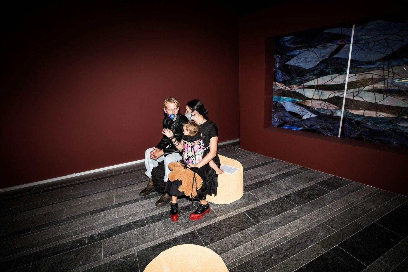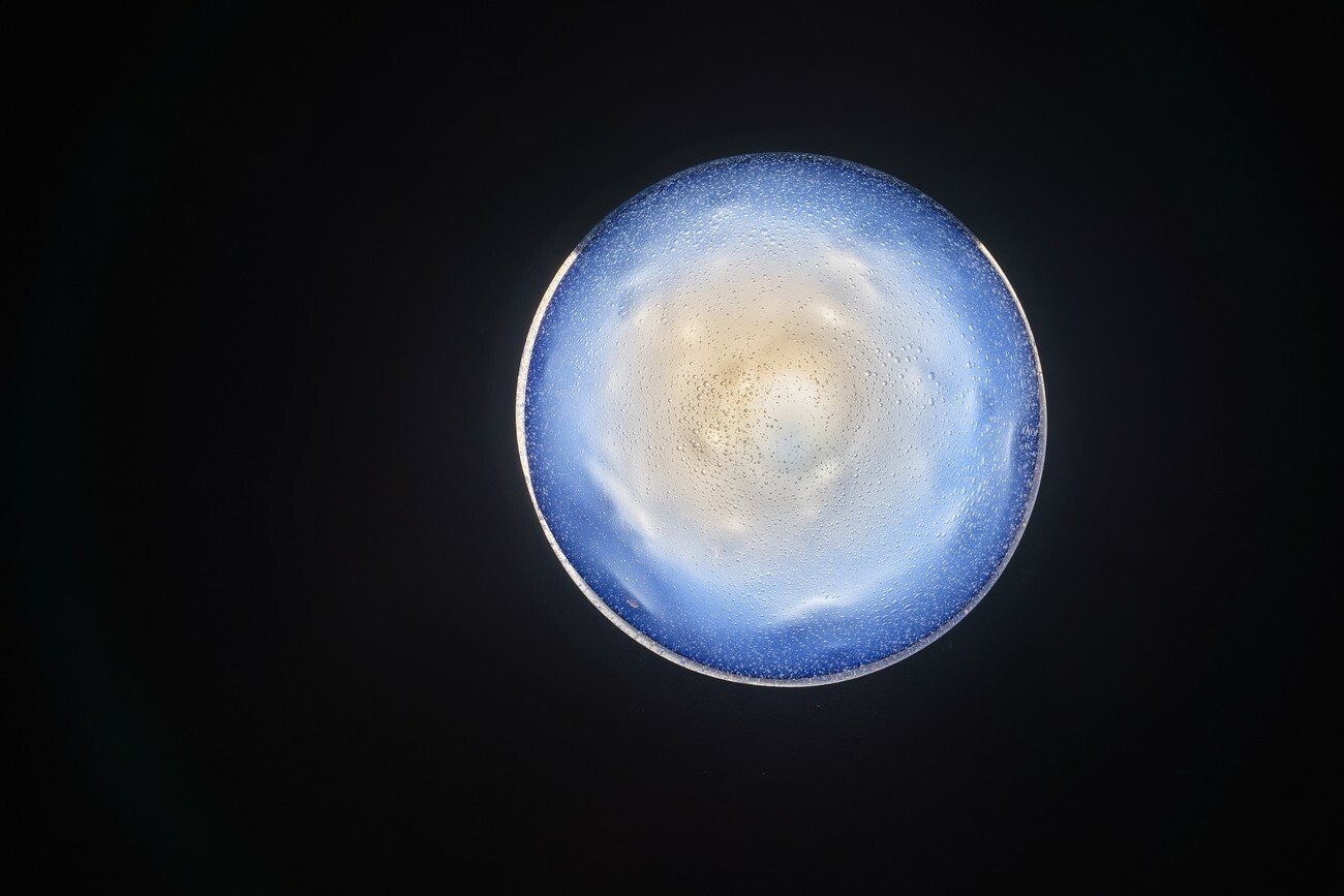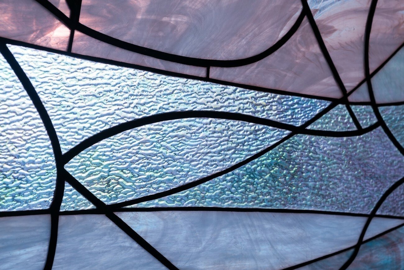 The story unfolds when the main characters of the book discover that the initial inhabitants of their planet were immortal until a certain knowledge was taken away from them. Among five protagonists only one enters the exhibition space, a glassmaker called Sima. A replica of Sima’s dream is seen as a central large-scale installation of an iridescent cloud depicted in stained glass. This visual experience brought them to the understanding that in one beam of light all colors exist at once. This comprehension suggests a perspective of inclusion and fullness.