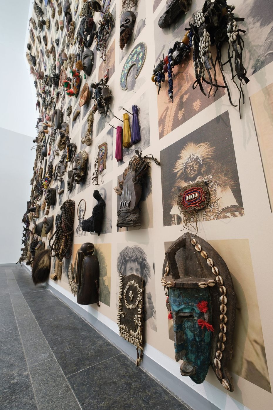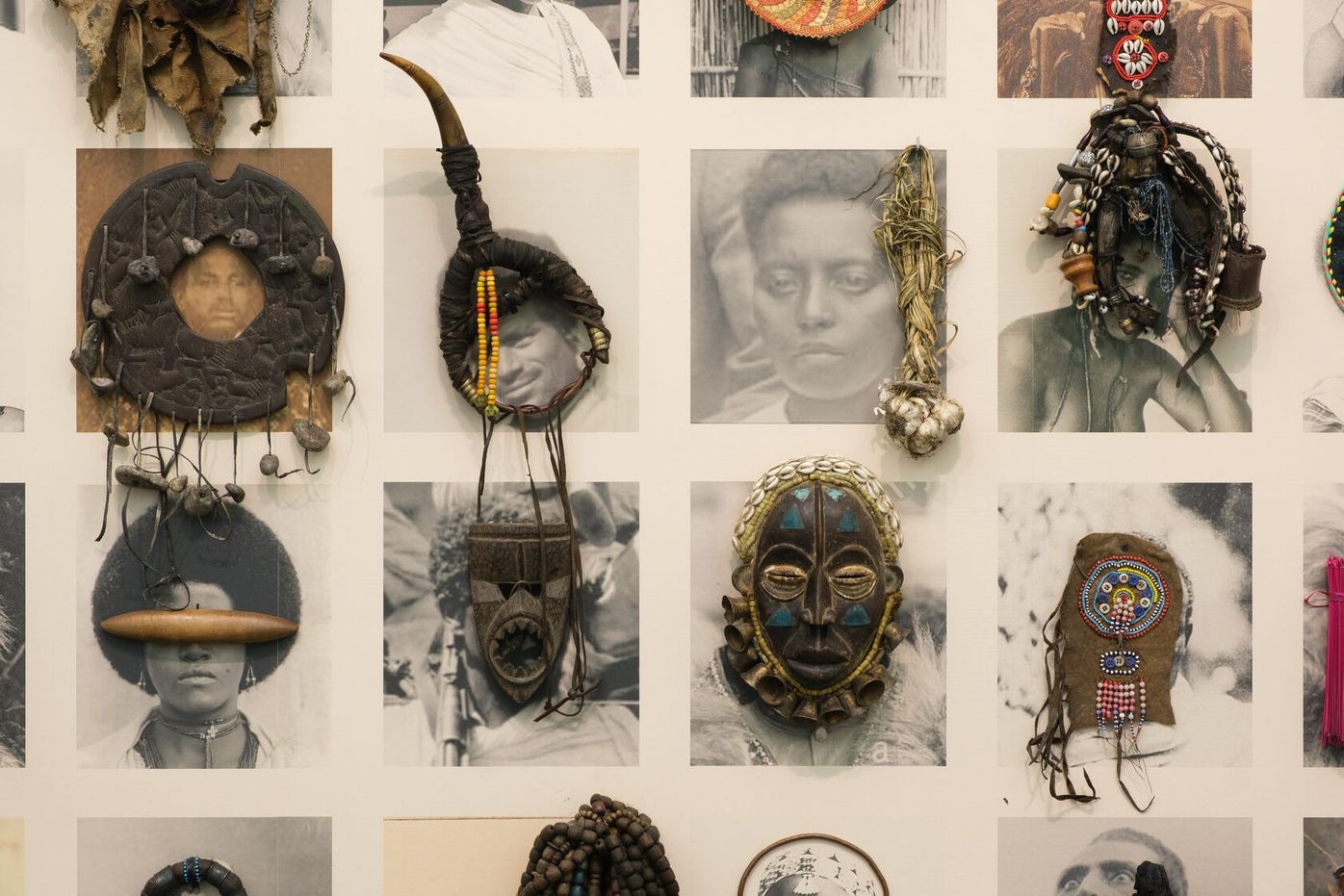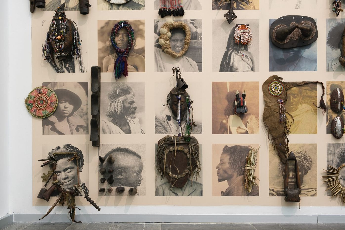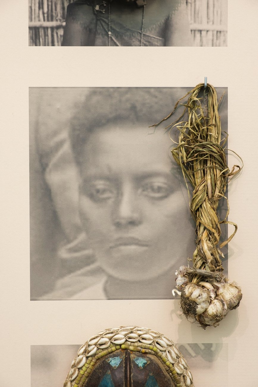 Creating a further layer, a collection of objects is placed over the photographs. Originating not only from Ethiopia, but also from other African countries, they create a visual diversity that intentionally detaches the narrative of the work from one specific location in order to resonate with wider context. The process of assembling each photo with the accompanying objects involves both a conscious and subconscious approach, tapping into the idea of inherited memories which might surface through artistic gestures or linger in the materials themselves.