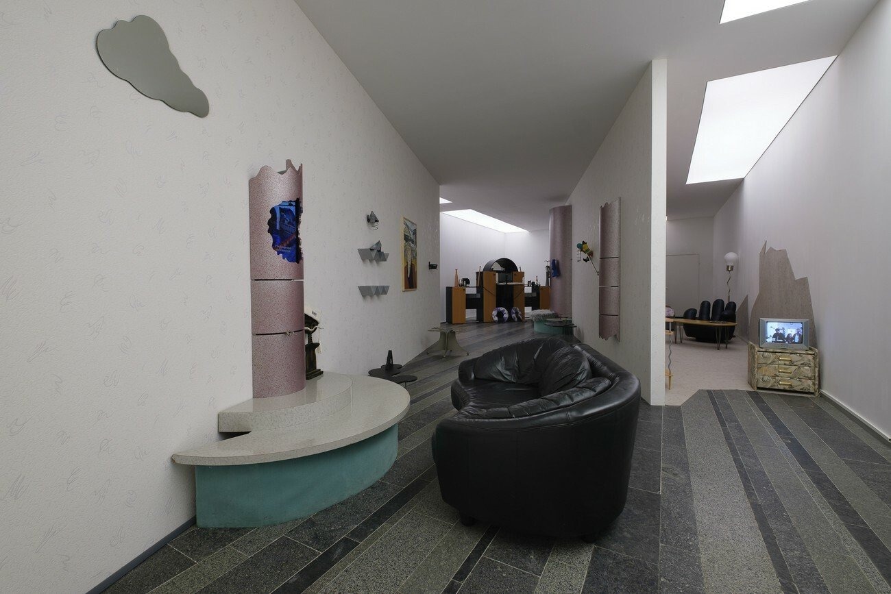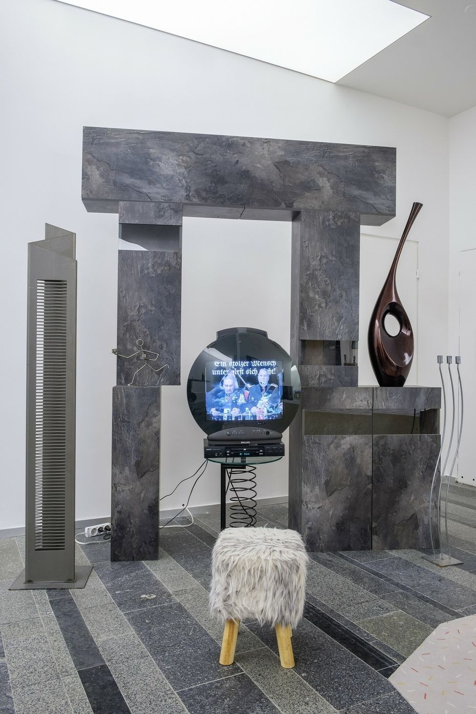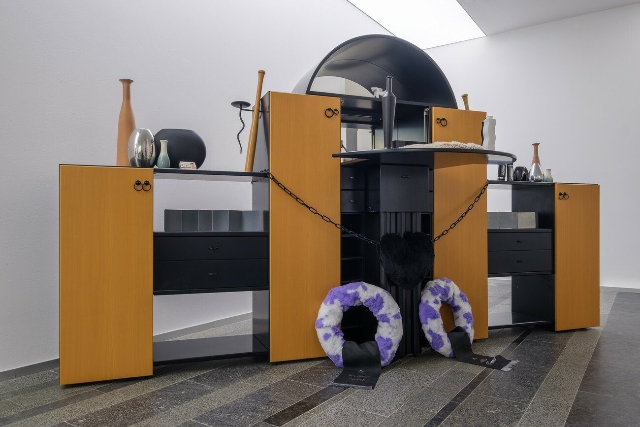 For the Future Generation Art Prize 2021 Naumann presents her work 2000, which takes the year of the new millennium as the starting point for a discussion about the post-unification period and the influence of postmodern design in Germany. The installation consists of furniture pieces, design objects, and artifacts of that time, sourced from the artist’s personal archive, Expo 2000 in Hanover, and the living rooms of Mönchengladbach. Together they represent the postmodern era, and, arranged based on the artist’s research on social media, composite images of apartment interiors of East German neo-Nazis. The grey carpet on the floor duplicates Germany’s territory borders, depicting the East and West parts as two separated sections. Through the practice of reconstruction, Naumann seeks to define the reasons why these aesthetic codes are still common in German homes and how they affect the future of the country.