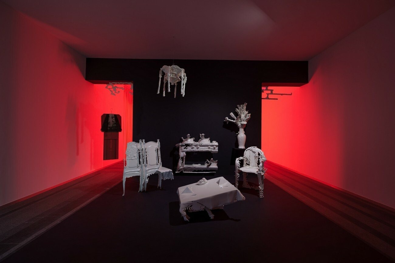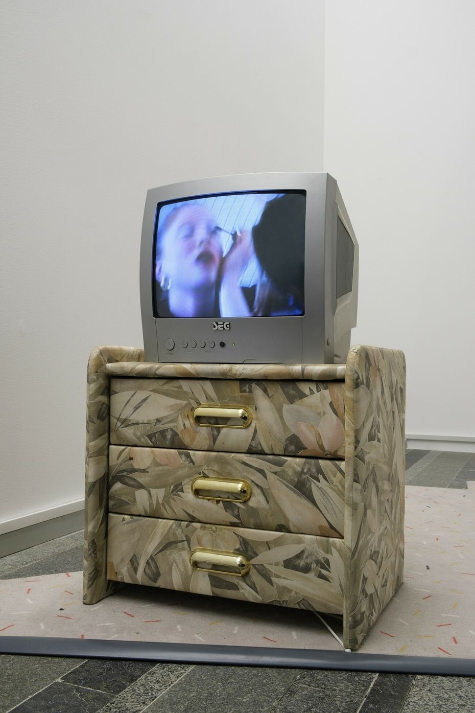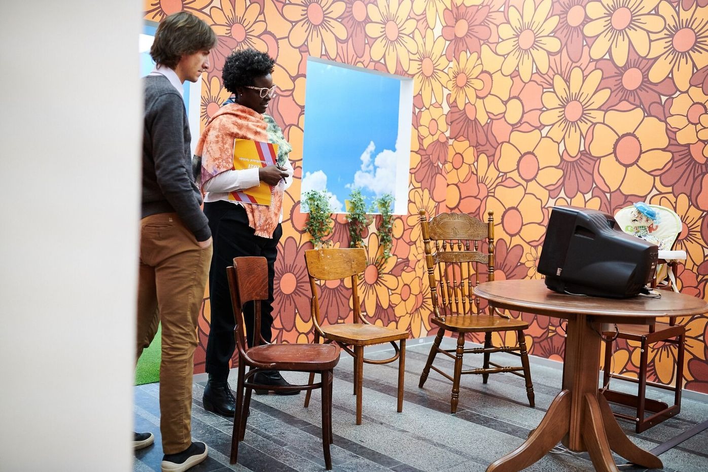 For the Future Generation Art Prize 2021 Naumann presents her work 2000, which takes the year of the new millennium as the starting point for a discussion about the post-unification period and the influence of postmodern design in Germany. The installation consists of furniture pieces, design objects, and artifacts of that time, sourced from the artist’s personal archive, Expo 2000 in Hanover, and the living rooms of Mönchengladbach. Together they represent the postmodern era, and, arranged based on the artist’s research on social media, composite images of apartment interiors of East German neo-Nazis. The grey carpet on the floor duplicates Germany’s territory borders, depicting the East and West parts as two separated sections. Through the practice of reconstruction, Naumann seeks to define the reasons why these aesthetic codes are still common in German homes and how they affect the future of the country.