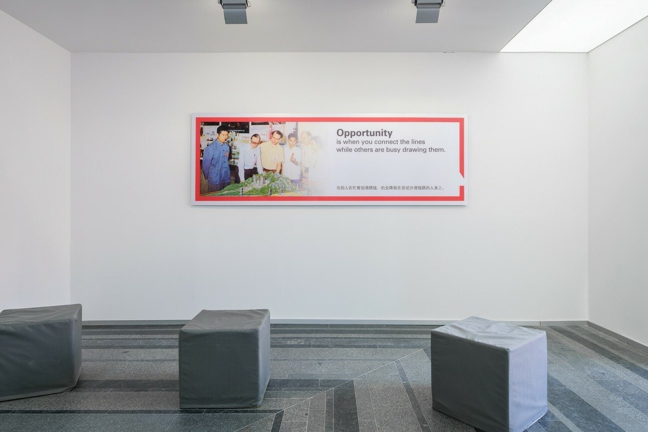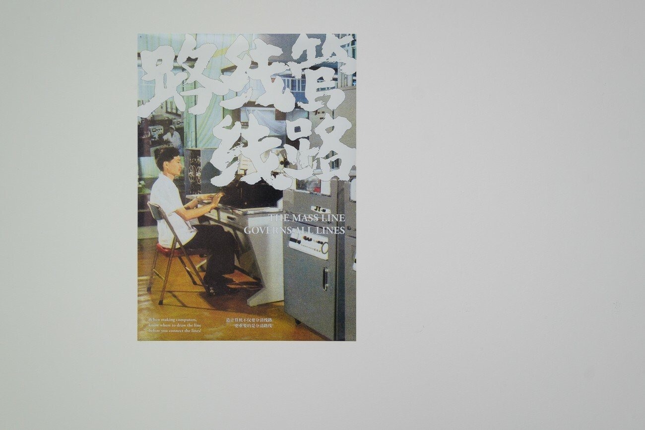 There are two posters included in the installation. They draw upon imagery extracted from publicity materials of the China Import and Export Fair, also known as the Canton Fair, during the 1970s. As one of the few occasions where Chinese trade representatives met foreign businessmen, the fair was where one could observe the ideological shifts of the Party as it gradually transitioned to a market economy integrated within global flows of labour, capital, and technology. The somewhat ironic pairing of the images with a set of devised slogans invokes the depoliticisation of technology that occurred as a part of these shifts, while questioning whether technological flows can ever be extricated from the lines of ideology.