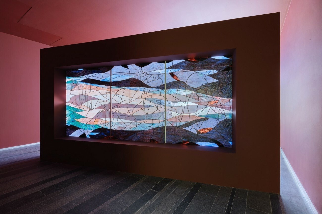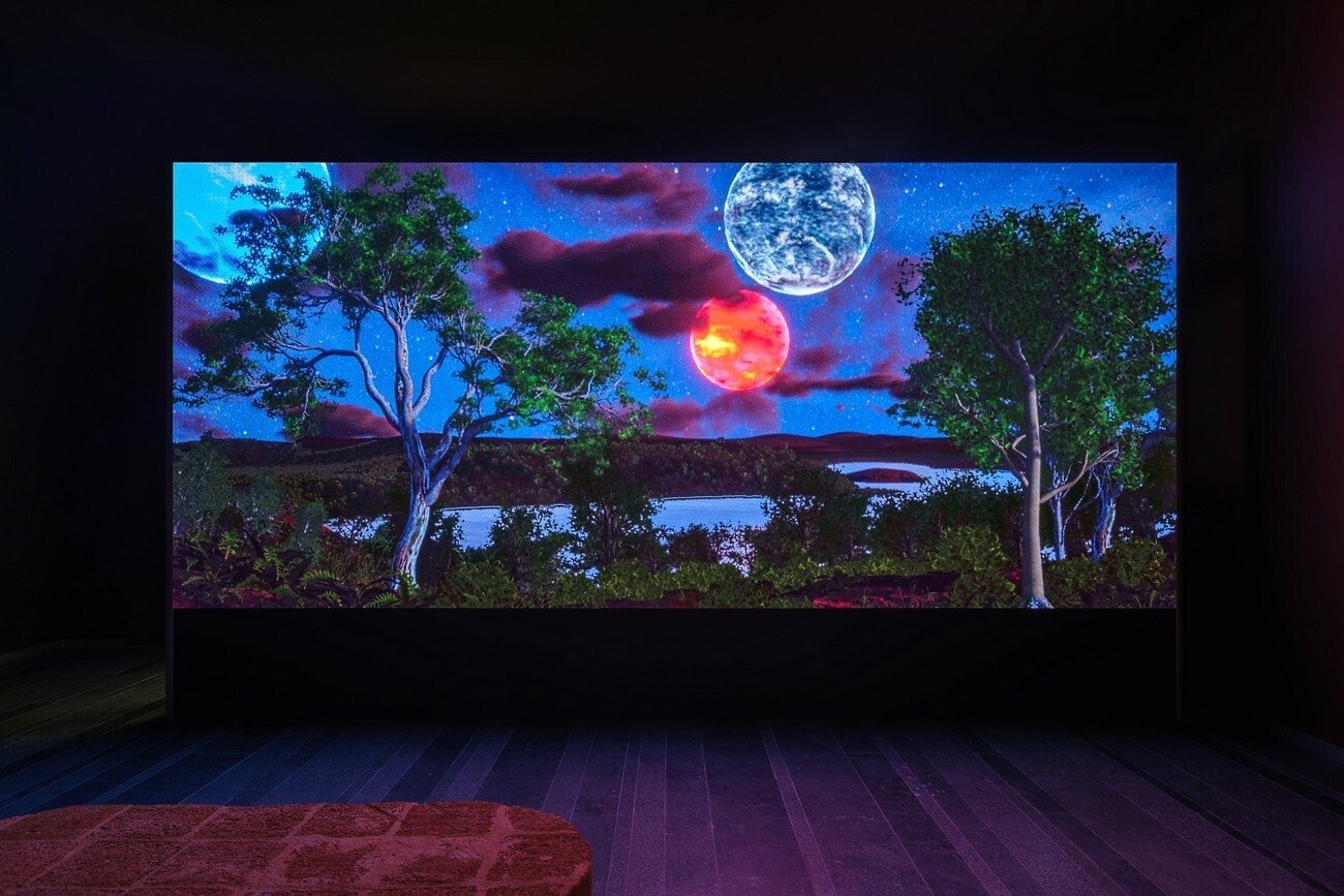The LED wall, which both opposes and illuminates the glass piece, shows the Bay of Jaffir, one part of the landscape of the video game version of Clattering. The video invites viewers to watch the shifts in light across the bay, through the trees, as the three planets move through the sky over the course of a day and a night.
