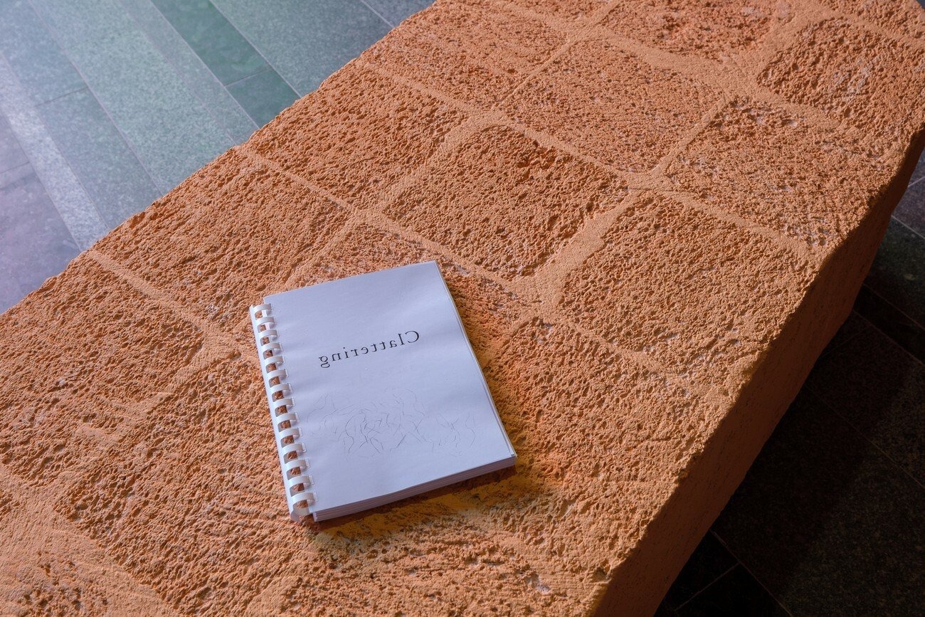 The installation emerges around a sci-fi novel called Clattering. The story, written in collaboration with writer Diana Hamilton, began as a proposition for open-mindedness, multiplicity, and opposition to the organizational states of our world, which is mostly built on various forms of dualism. Rindon Johnson’s practice is bound up with writing, which he scales up to spatial installations that contain various elements or media.