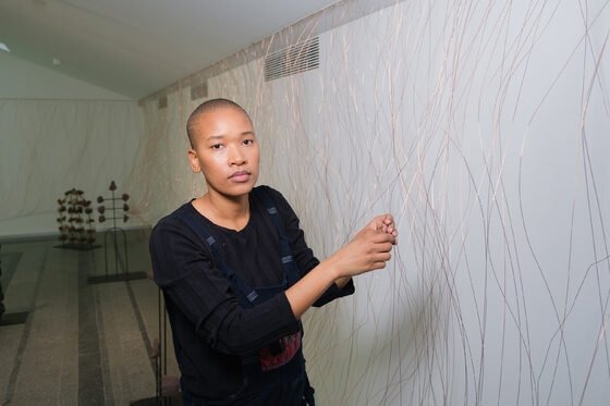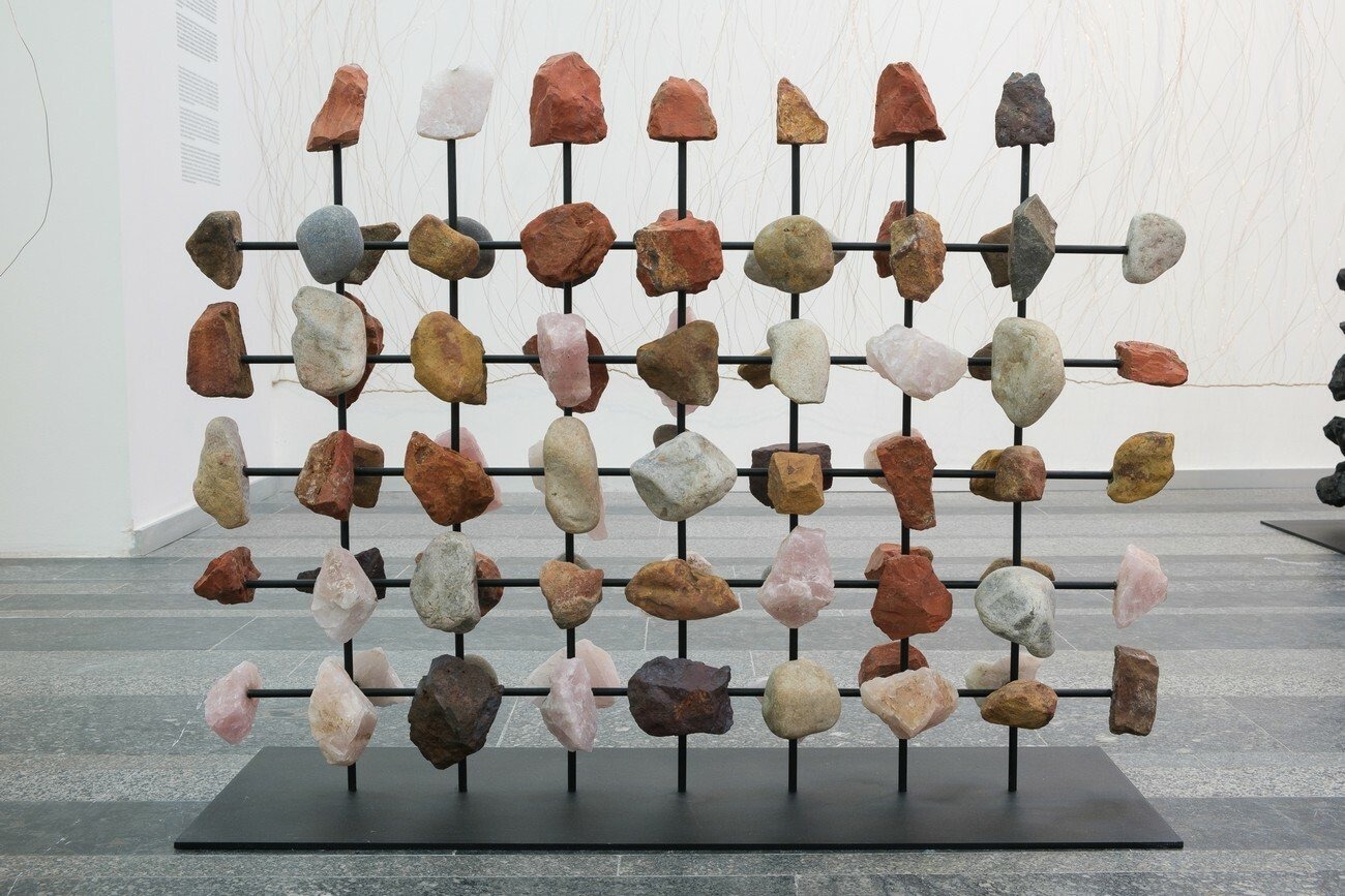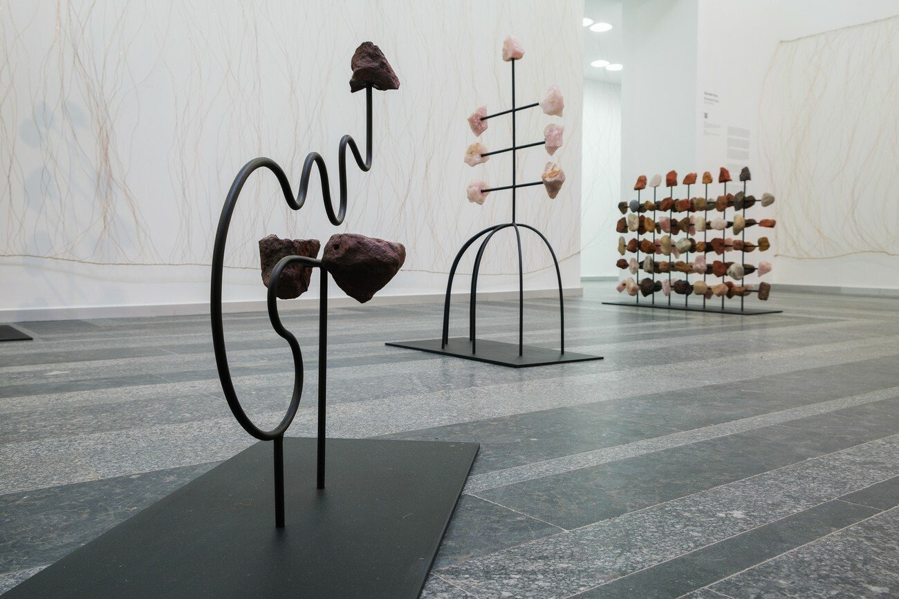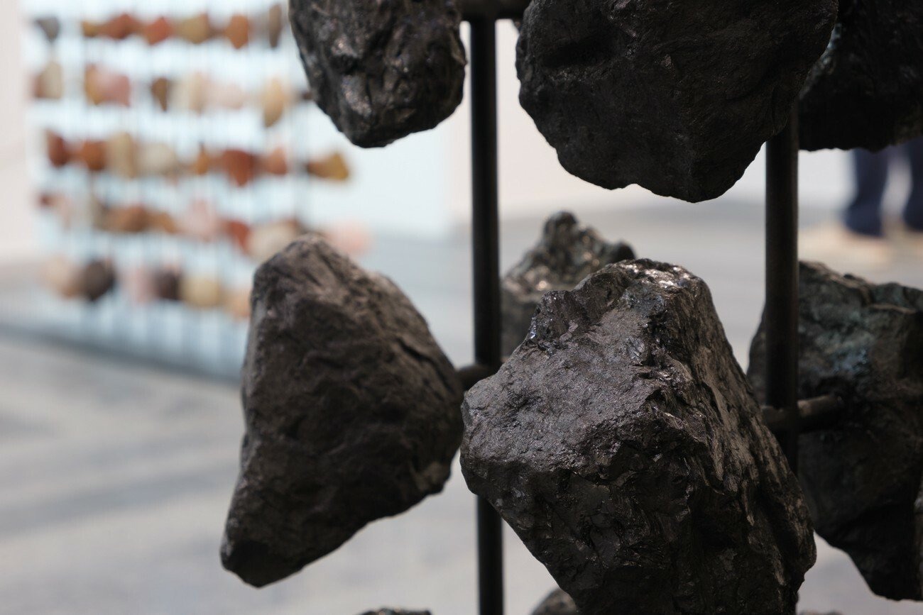 Bronwyn Katz’s large-scale installation, /xabi, is an extension of a system of notation she has been developing to signify the phonetics of a creole language, which is typically made by mixing two different languages into a new one. Her iteration of creole gestures towards the Southern African click-based dialect of !Ora. The installation is manifested as a single, immersive environment. In it, a series of rock and steel sculptures — denoting the letters or symbols of Katz’s imagined language — are surrounded by what she identifies as curtains of rain, materialised as lengths of copper coated carbon steel joined together with hemp twine.