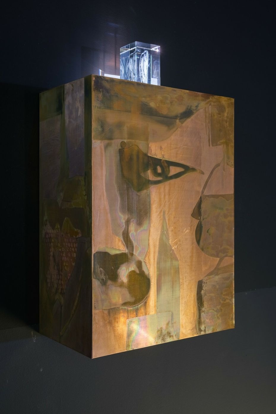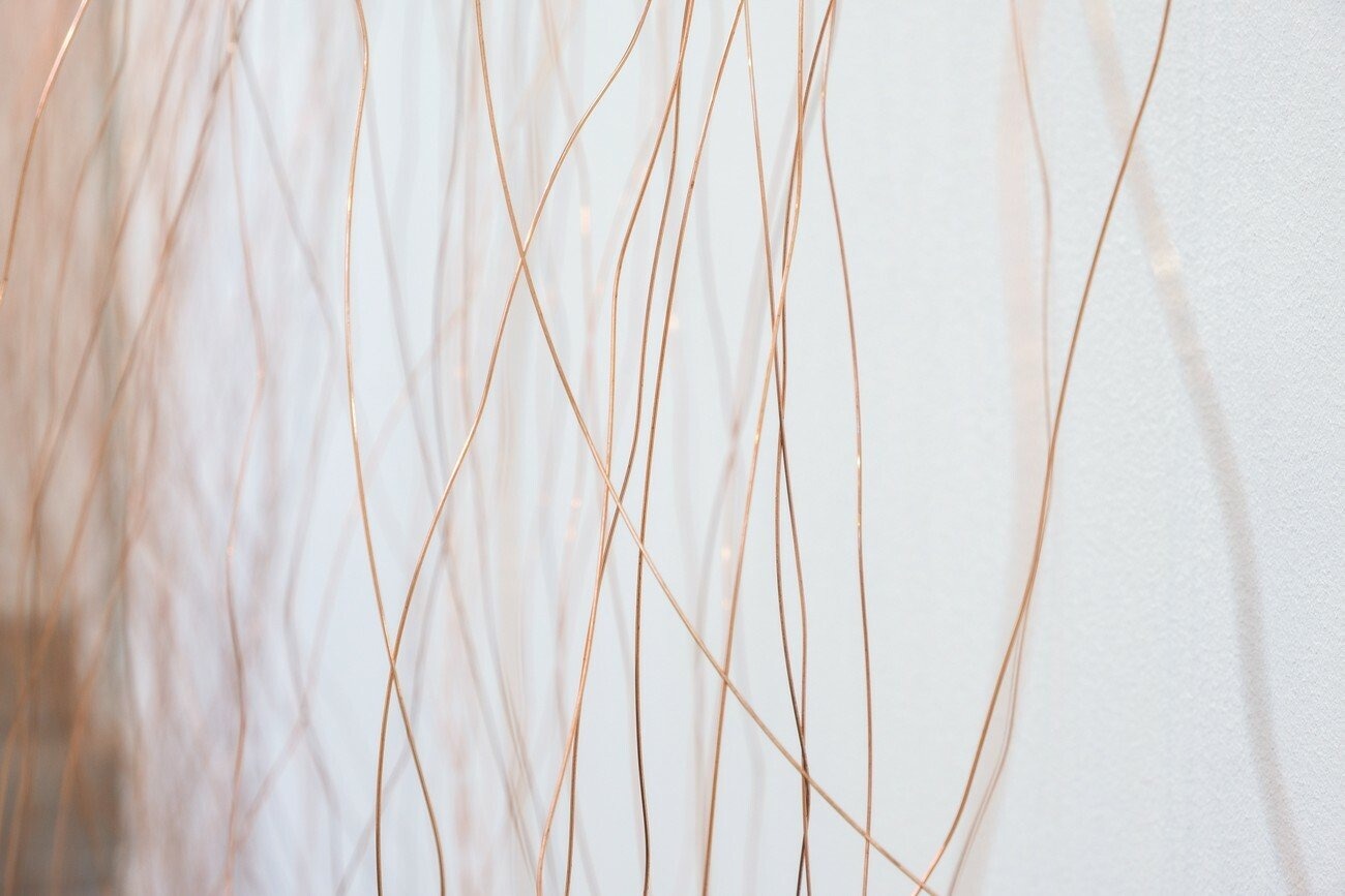 This installation represents a cohesive body of work centered around the question of visibility and invisibility. Each compositional element of the work has the potential to affect our physical experience of the space; of what we can see, hear, or feel. Everything here moves or alludes to movement, such as the use of a chemical reaction to form spontaneous images on copper, or the deep bass frequencies travelling through our bodies.