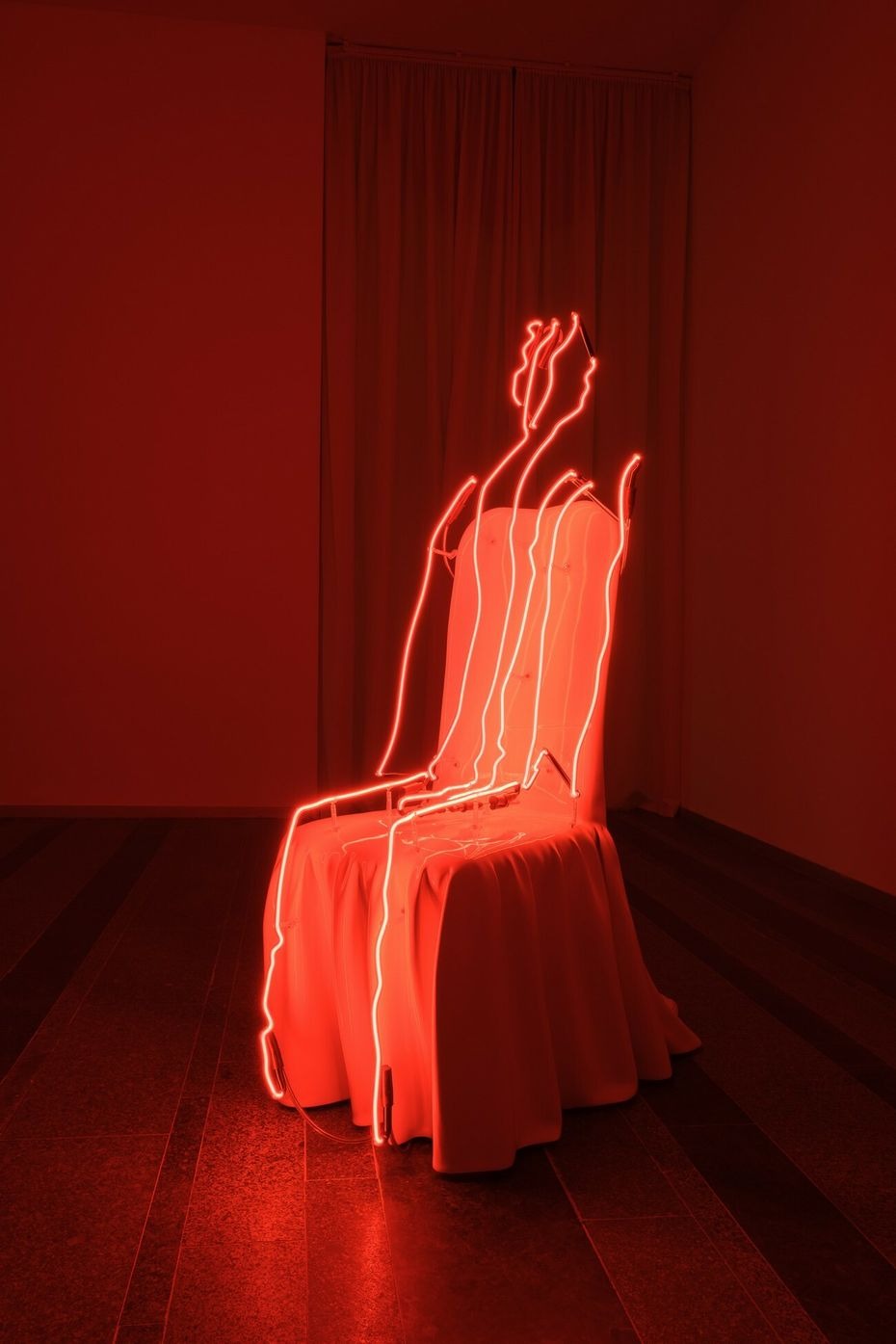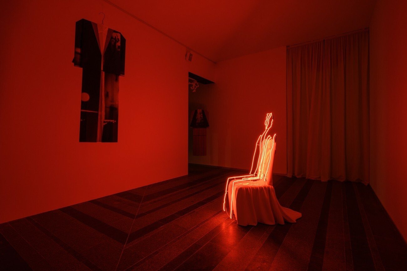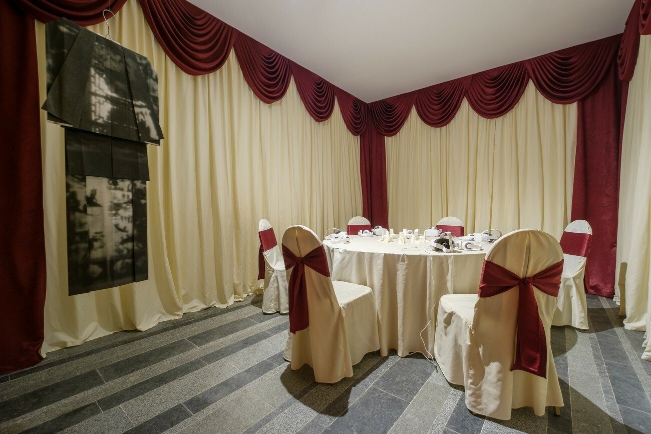 The following space is illuminated by the neon sculpture of a ghost — a form generated by the moving figures accidentally captured by Lam’s 3D scanner in the restaurant. Its figure appears as an ancestor and a guide to the banquet room around the corner. The closed and intimate space with a round table in the centre brings to mind a spiritualistic seance. Through VR headsets the visitors are transported into another dimension, where, together with a mysterious guide, they cross over the dark universe of restaurants that once existed, a space that expands over the course of the trip.