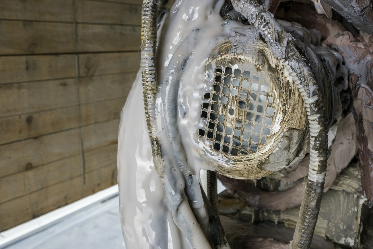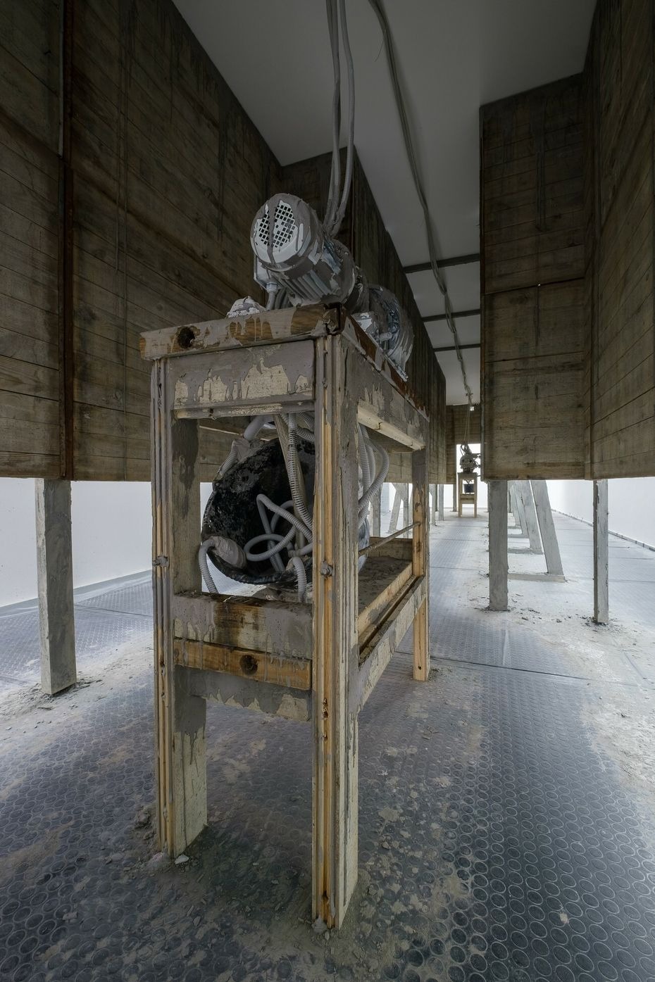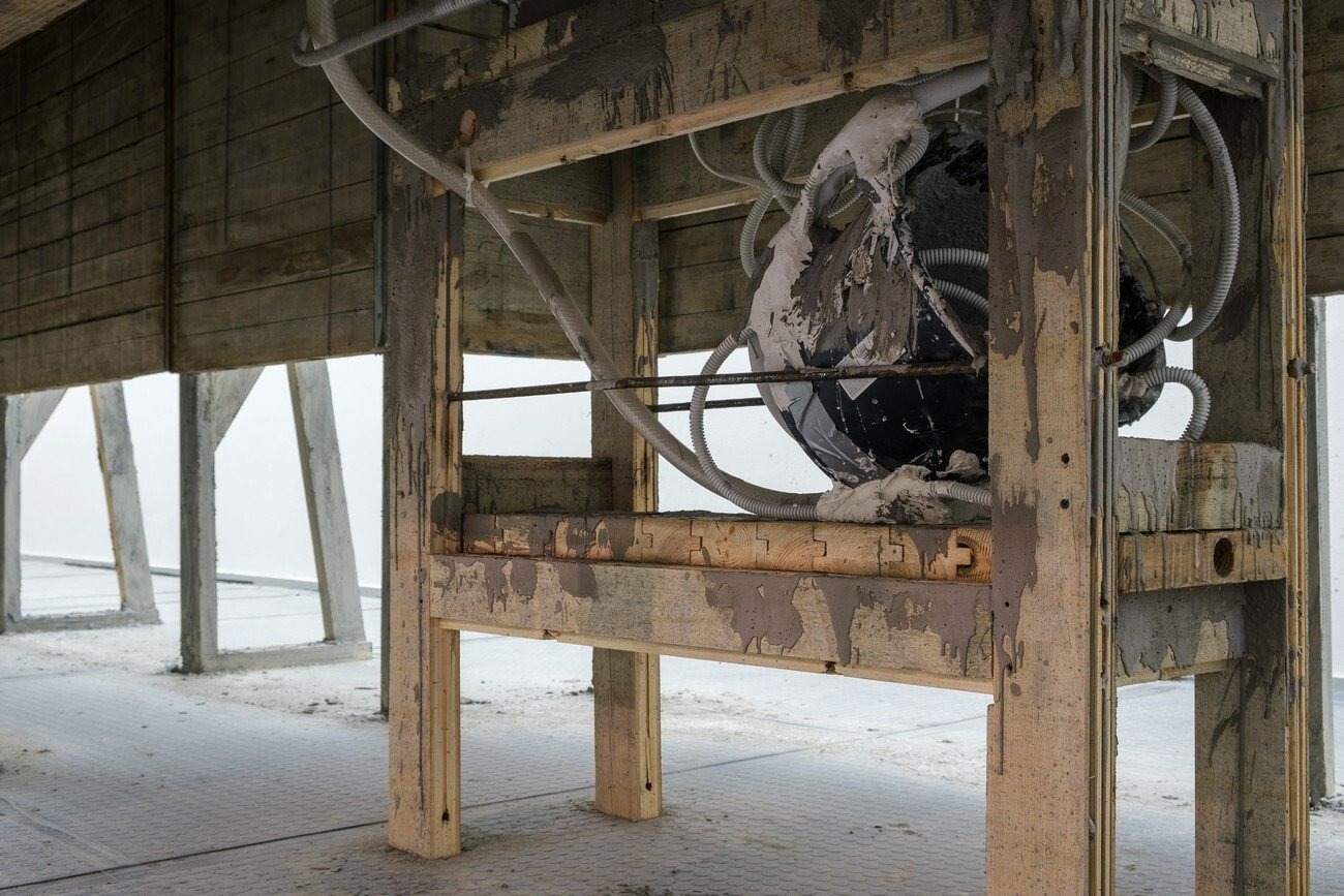 From here, the structure can be navigated as if it is an internal space of a body: there are two organ spaces and vessels that connect them. In the adjacent symmetric formwork rooms, there are constantly working peristaltic pumps. The sculptures on the top of the machines are entangled, creating a hybrid body. The physical feeling of outside and inside becomes blurred in all elements of Lee’s installation. The dry and hard facade surface is covered with concrete, while the outer layer of the sculptures are cracked allowing a viscous liquid to flow out. The slush inside bursts through a shell that once looked solid.