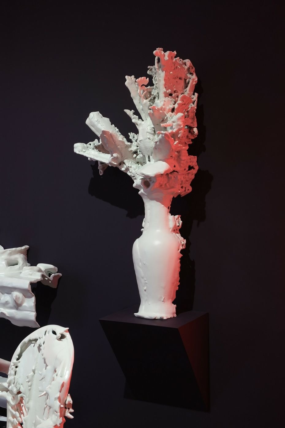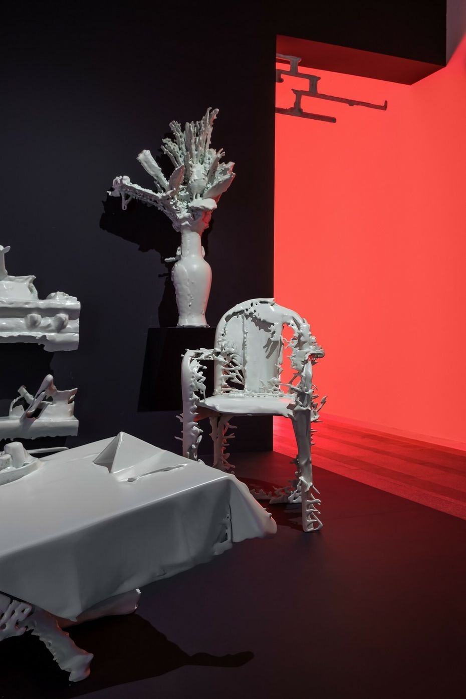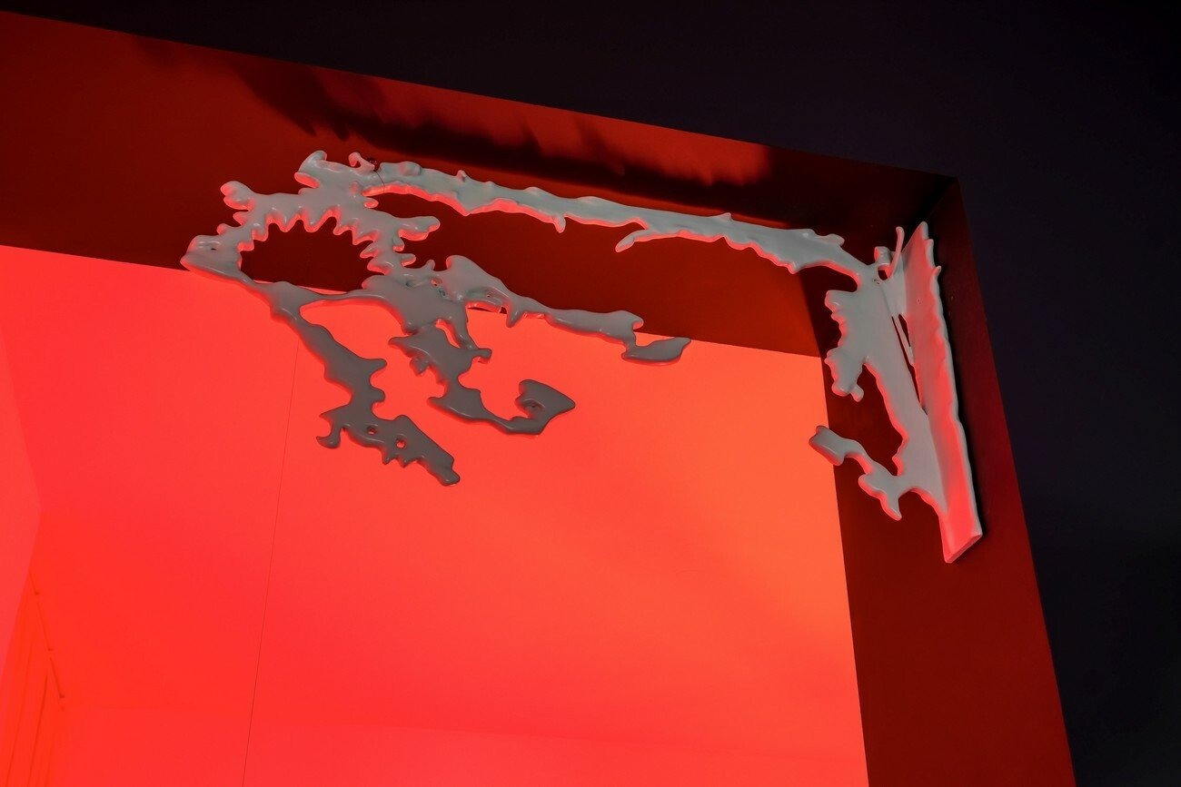 From here, the structure can be navigated as if it is an internal space of a body: there are two organ spaces and vessels that connect them. In the adjacent symmetric formwork rooms, there are constantly working peristaltic pumps. The sculptures on the top of the machines are entangled, creating a hybrid body. The physical feeling of outside and inside becomes blurred in all elements of Lee’s installation. The dry and hard facade surface is covered with concrete, while the outer layer of the sculptures are cracked allowing a viscous liquid to flow out. The slush inside bursts through a shell that once looked solid.