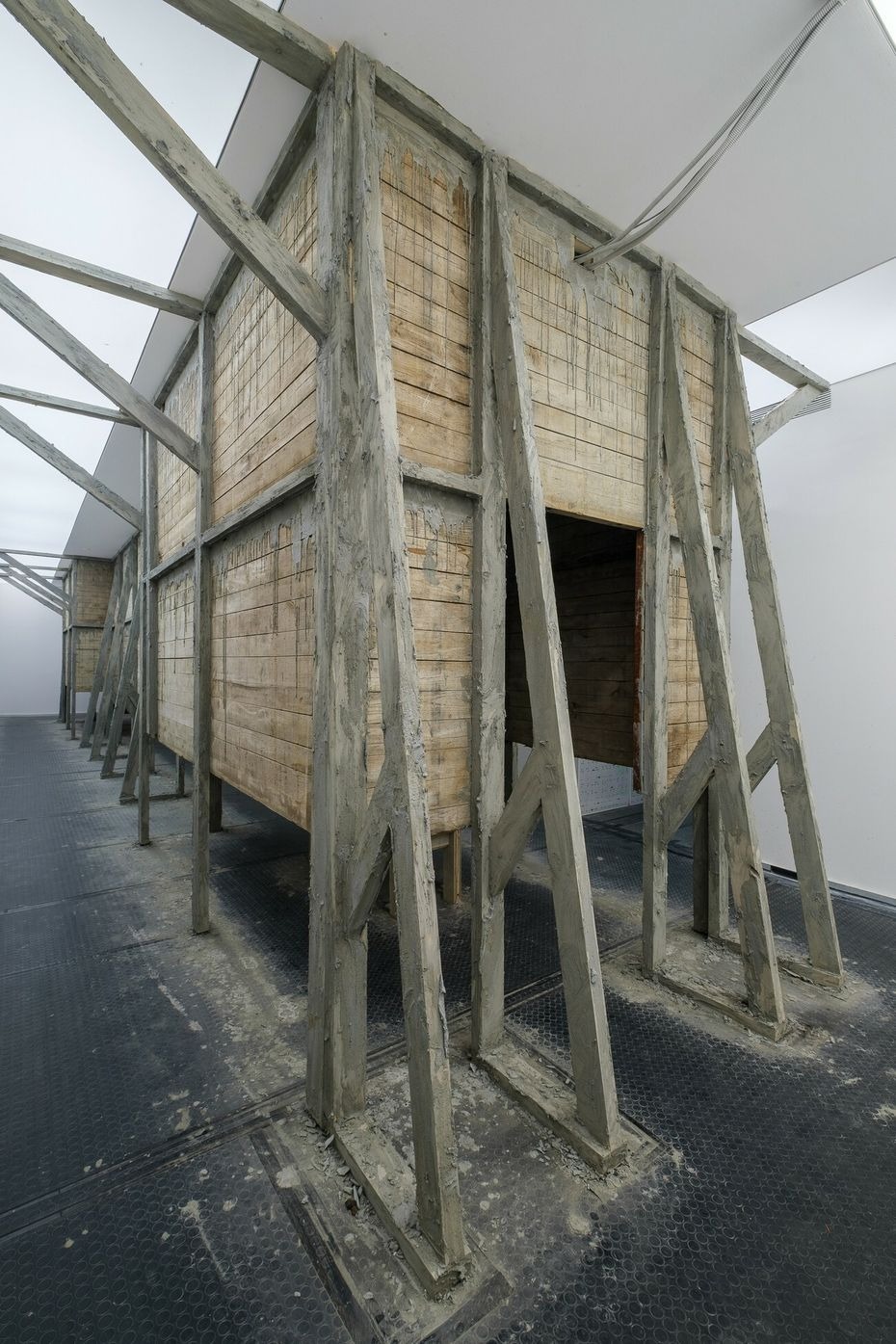 For her installation, Mire Lee creates an architectural interior made of formworks — typical tools for modeling building facades. The molds are removed after the material inside dries and are then reused over and over again. In a sense, these formworks “give birth” to concrete blocks, a process in which their surfaces appear to carry the traces of all the produced modules. The structure can be entered, allowing the viewer to walk through its inner architecture. Being inside of this half-closed space we find ourselves surrounded by walls, confined by formwork skin.