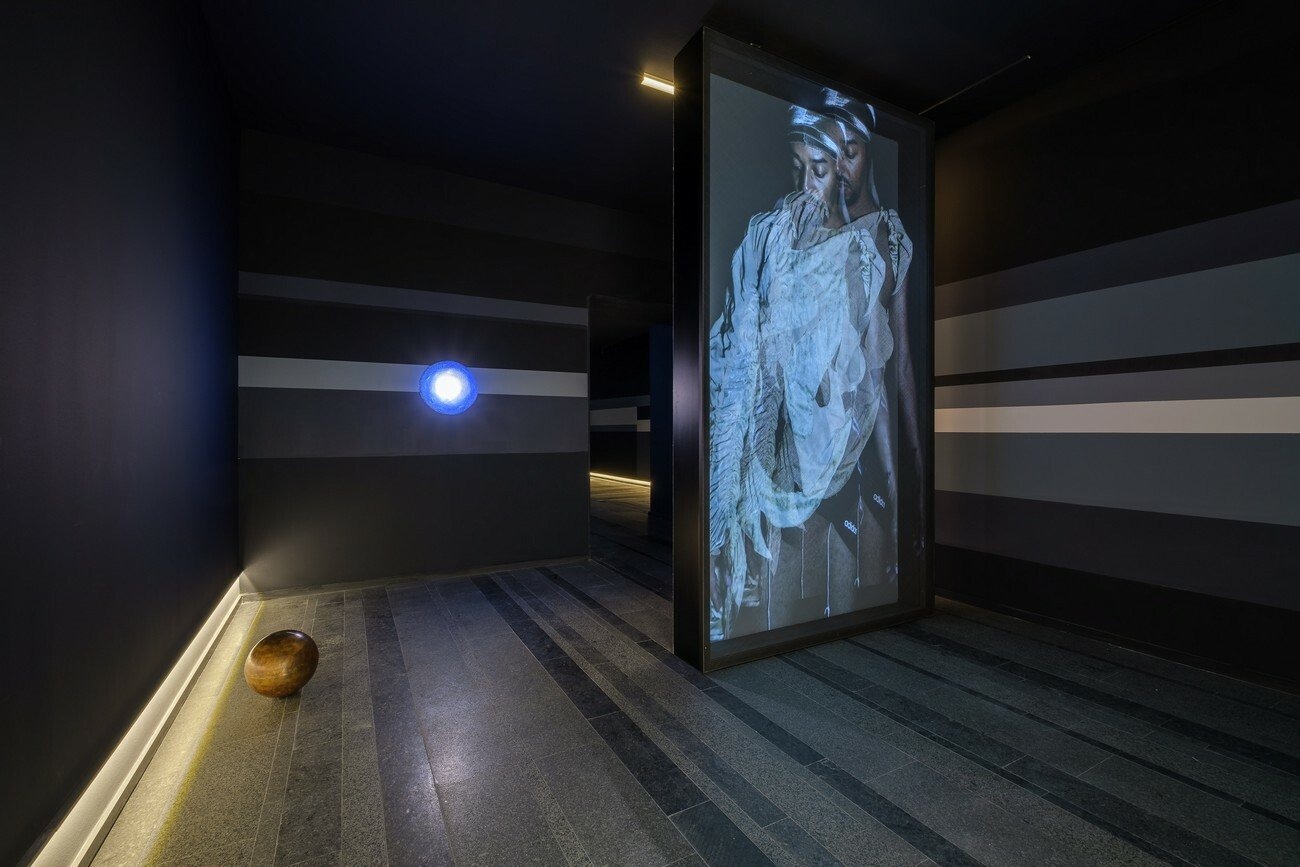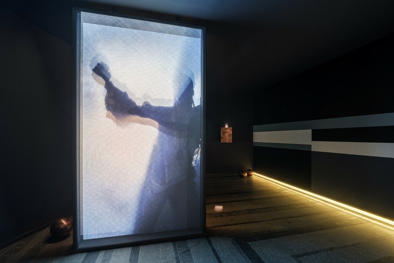 In When the bodies dissolved into the ether, orbs sang notes of the heavens, Maheke plays with the poetics of a body dancing to the sound of the Moon. This video diptych, projected on two identical screens erected in two consecutive rooms, uses motifs of presence and withdrawal. Both screens are made from HoloGauze, a material known for producing the illusion of a hologram. Captured on camera and shown as a video loop, the performance encompasses different choreographic moments based on principles of circularity and renewal found in the cosmology of ancient Congo, as well as in French Créole poet Edouard Glissant’s writing.