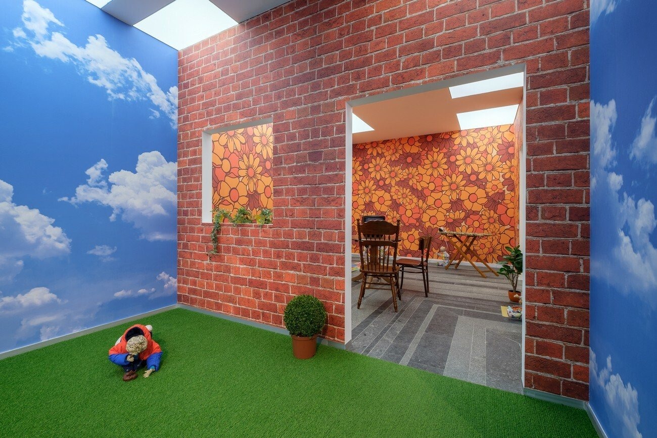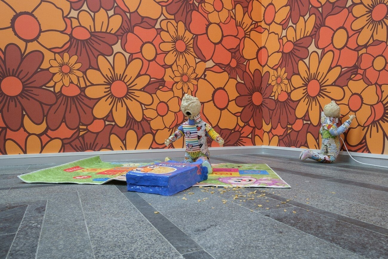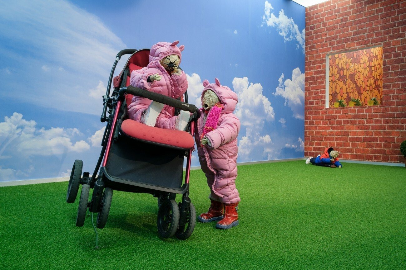 Lindsey Mendick’s installation utilizes cinematic techniques drawn from the horror genre. She creates an installation divided into two settings; the first one represents an outdoor space with a playground, idyllic blue skies, and fake-grass underfoot. The second room reproduces a perfectly typical interior of a1970s house. Both spaces are inhabited by bizarre celeriac-headed infants who evoke a pervasive feeling of anxiety. These ceramic children are frozen in all manner of dangerous and terrified moments, showing the hostility of the environment and the impossibility of constantly monitoring their actions.