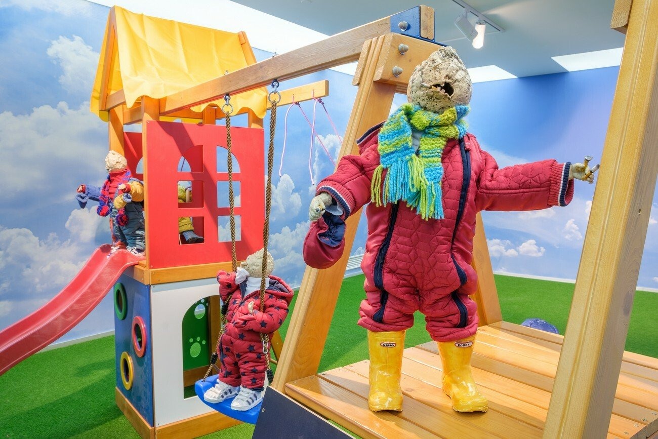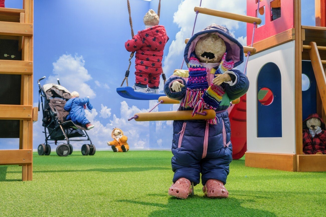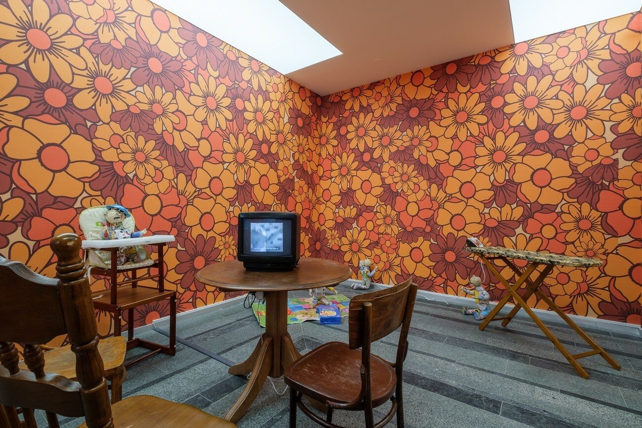 Lindsey Mendick’s installation utilizes cinematic techniques drawn from the horror genre. She creates an installation divided into two settings; the first one represents an outdoor space with a playground, idyllic blue skies, and fake-grass underfoot. The second room reproduces a perfectly typical interior of a1970s house. Both spaces are inhabited by bizarre celeriac-headed infants who evoke a pervasive feeling of anxiety. These ceramic children are frozen in all manner of dangerous and terrified moments, showing the hostility of the environment and the impossibility of constantly monitoring their actions.