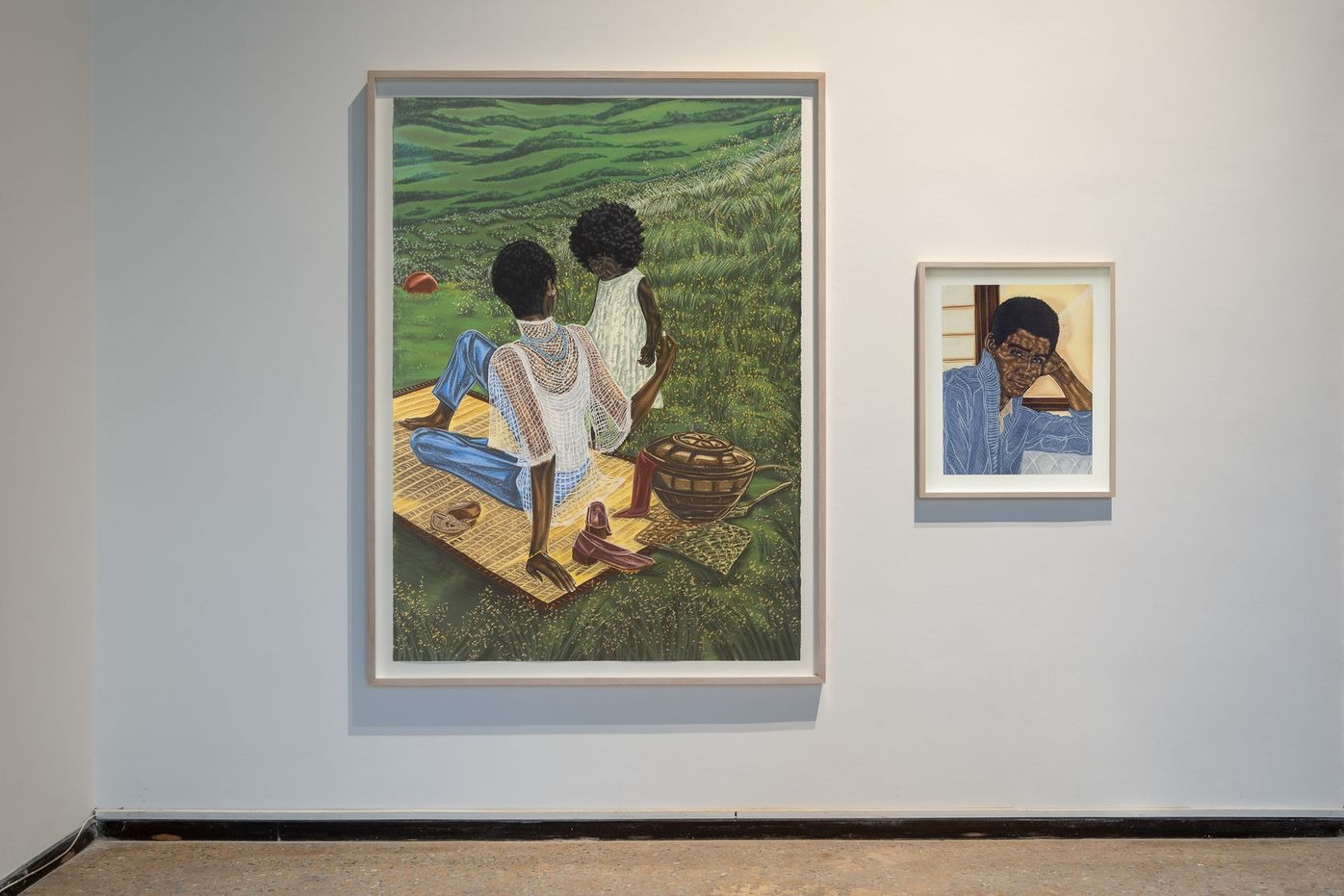 Toyin Ojih Odutola creates multimedia drawings on various surfaces, investigating formulaic representations and how such images can be unreliable, systemic and socially coded. Her most recent work explores this through the fictitious narrative of a Nigerian aristocratic family. The larger series, of which the exhibition showcases excerpts, attempts to illustrate the parameters of wealth and its perspectives, the adaptability of cultural history and suspicions around unquestionable status. It is a thought experiment where historically oppressed figures own their bodies and capital as opposed to the actuality of their bodies being capital. Ojih Odutola inquires whether seeing such figures in luxurious surroundings changes perceptions of self and capability. Ultimately, what is revealed is akin to any social construct and tool: they are only being seen because of an elevated regard; with or without it, their value as people is flattened.