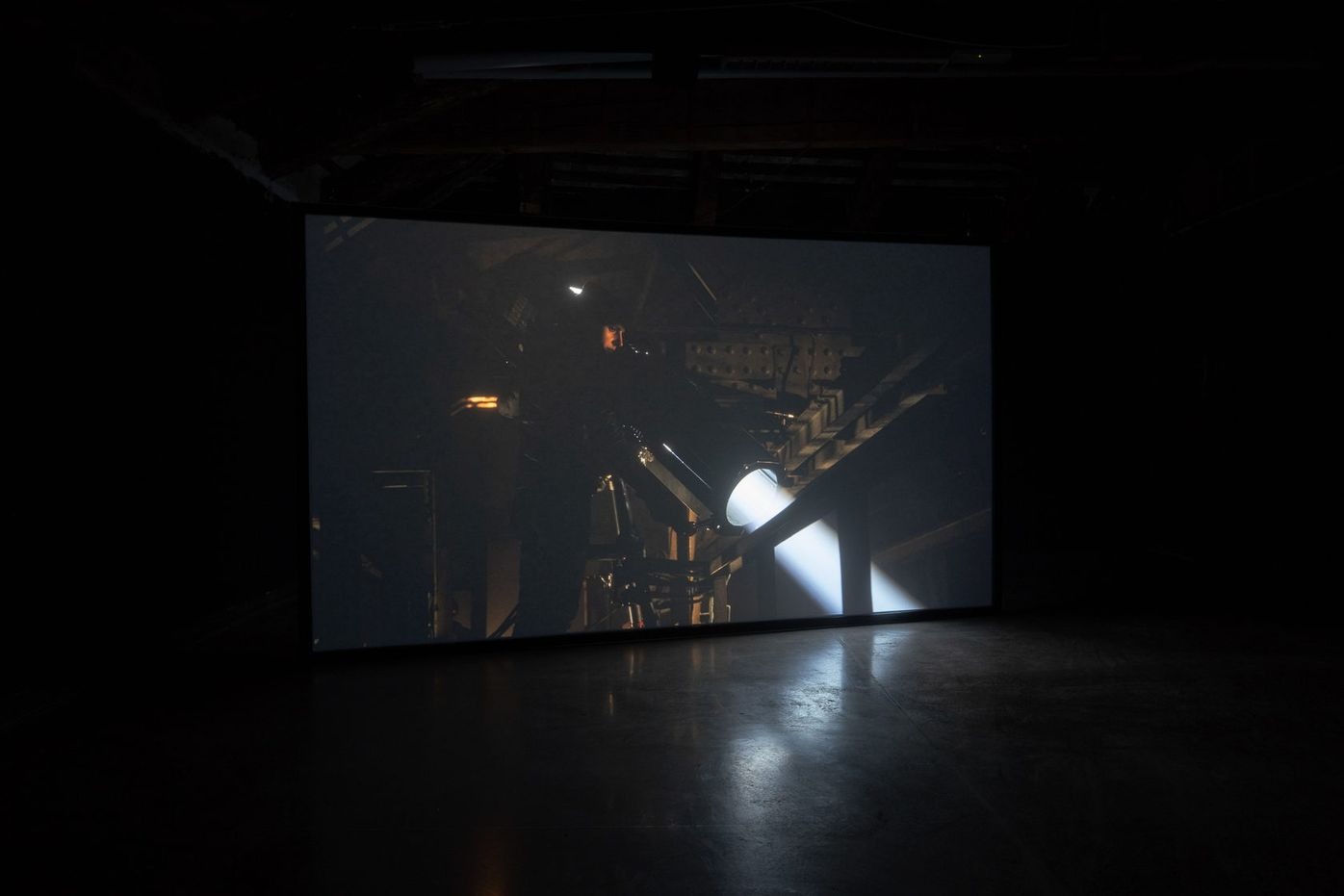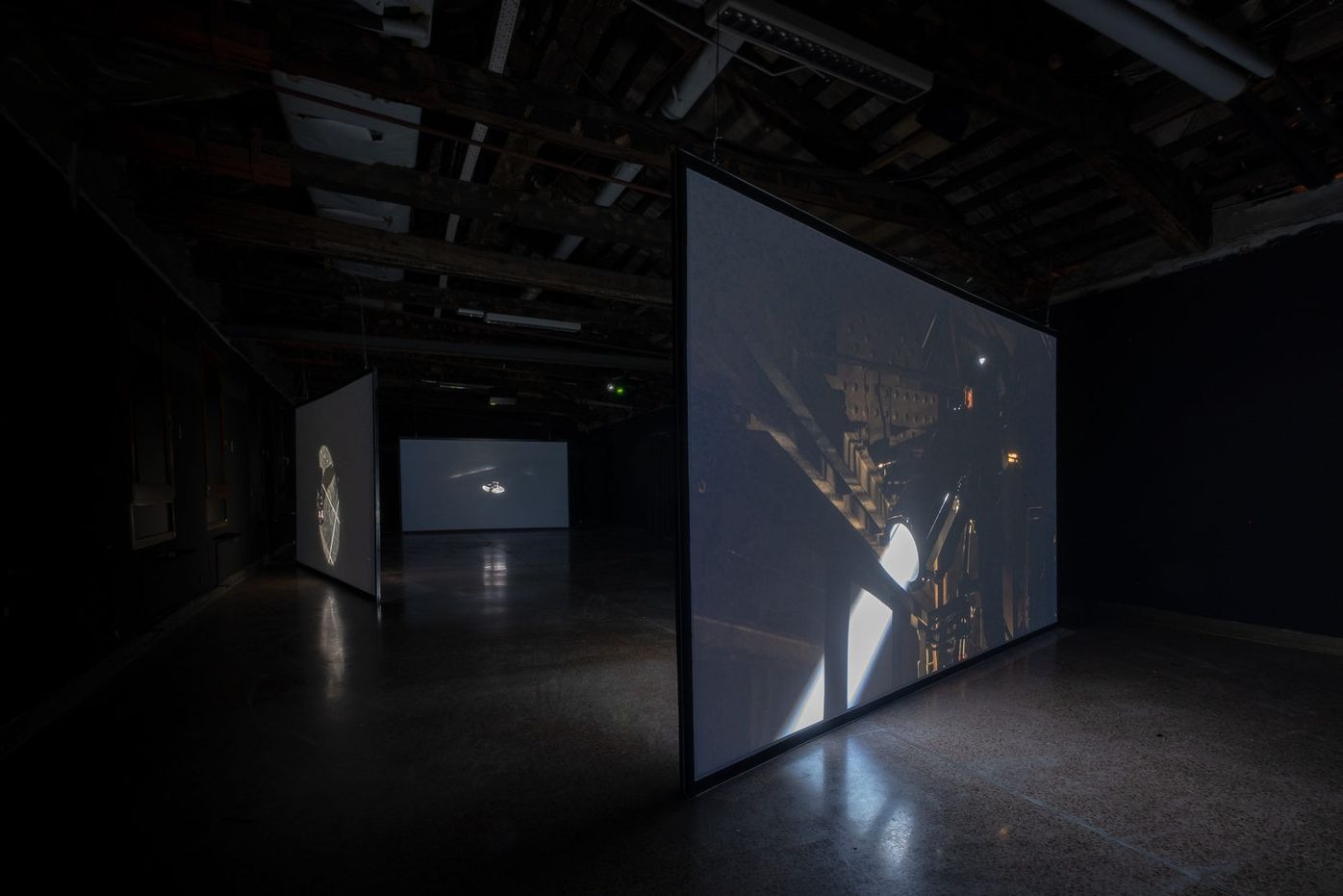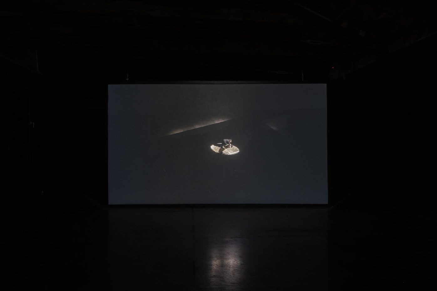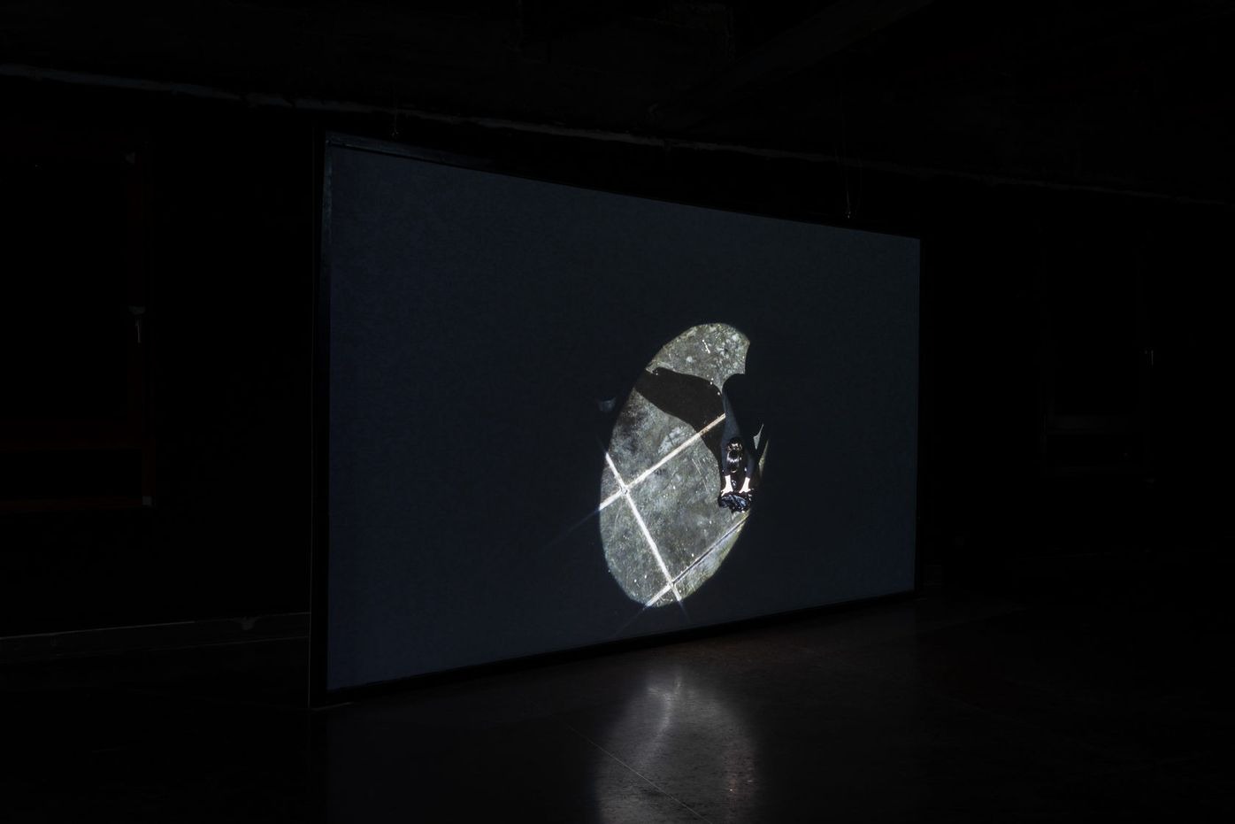 Emilija Škarnulytė investigates the shifting boundaries between documentary and fiction, between ecological and cosmic forces, feeling out all kinds of non-human and post-human scales, in the depths of space and time. t1/2 continues that topic of post-human mythology in a fictional visual meditation about contemporary science from the perspective of a future archaeology. The title refers to the symbol for “half-life”, a term commonly used in nuclear physics to describe radioactive decay. Presented as a large-scale video installation, the work shows architecture envisioned by the artist through remote-sensing 3D scans and a mirrored ceiling, traversing an epic landscape of geography.
