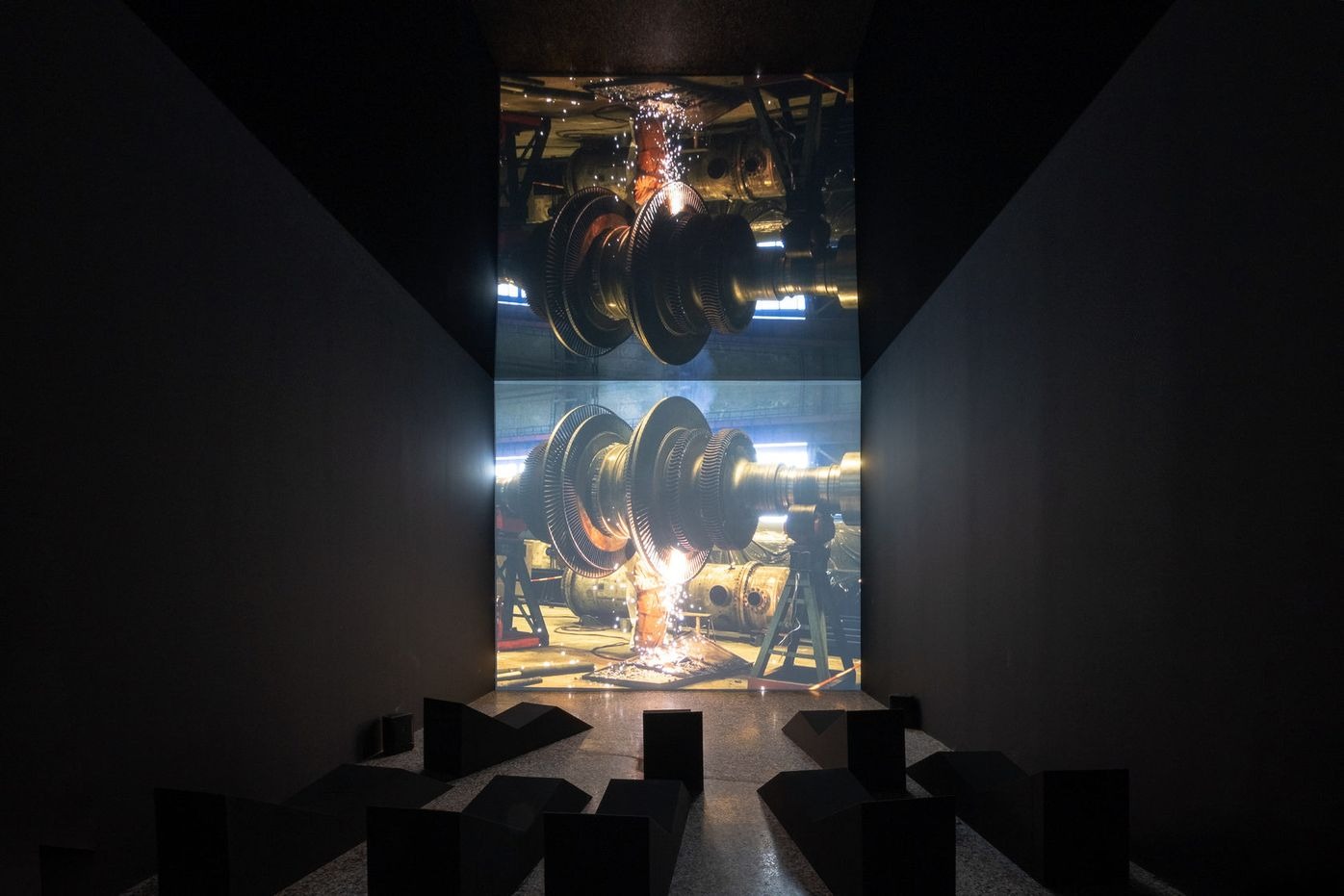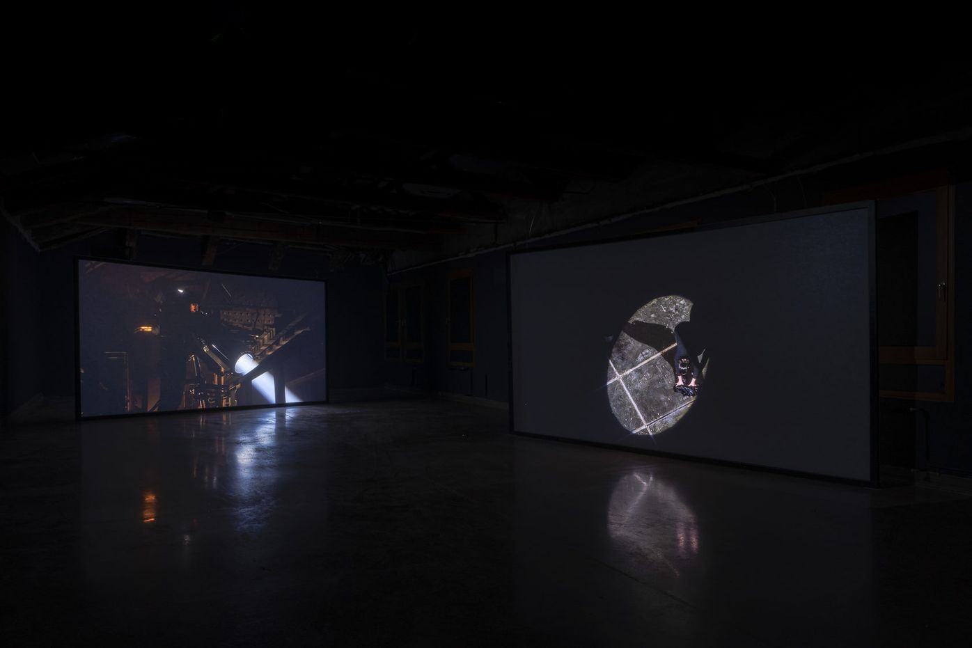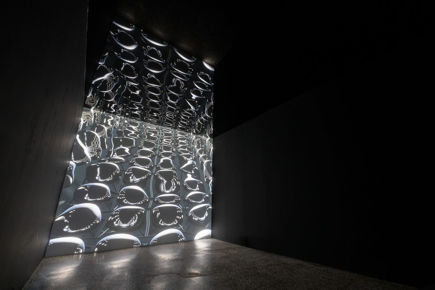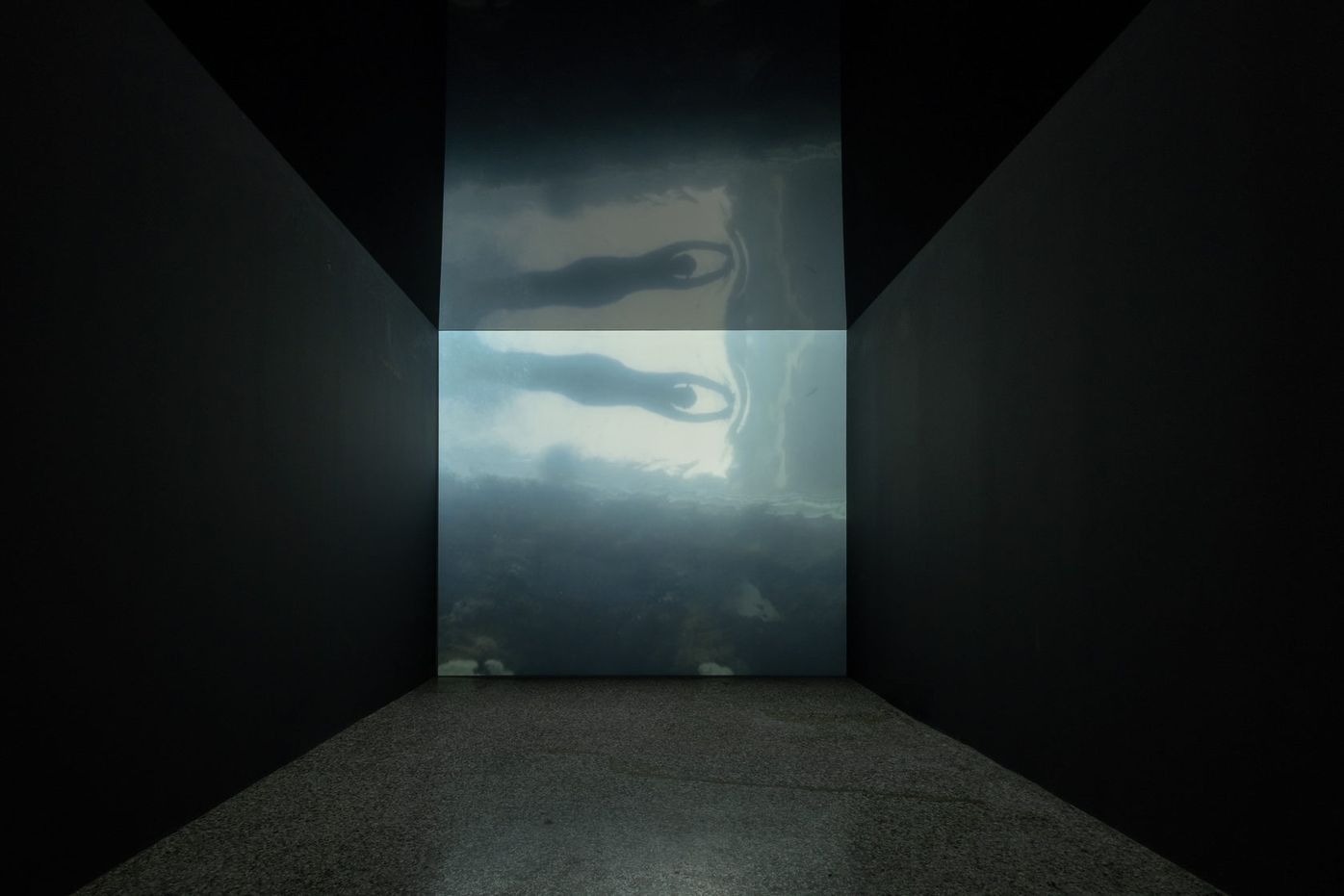 Emilija Škarnulytė investigates the shifting boundaries between documentary and fiction, between ecological and cosmic forces, feeling out all kinds of non-human and post-human scales, in the depths of space and time. t1/2 continues that topic of post-human mythology in a fictional visual meditation about contemporary science from the perspective of a future archaeology. The title refers to the symbol for “half-life”, a term commonly used in nuclear physics to describe radioactive decay. Presented as a large-scale video installation, the work shows architecture envisioned by the artist through remote-sensing 3D scans and a mirrored ceiling, traversing an epic landscape of geography.