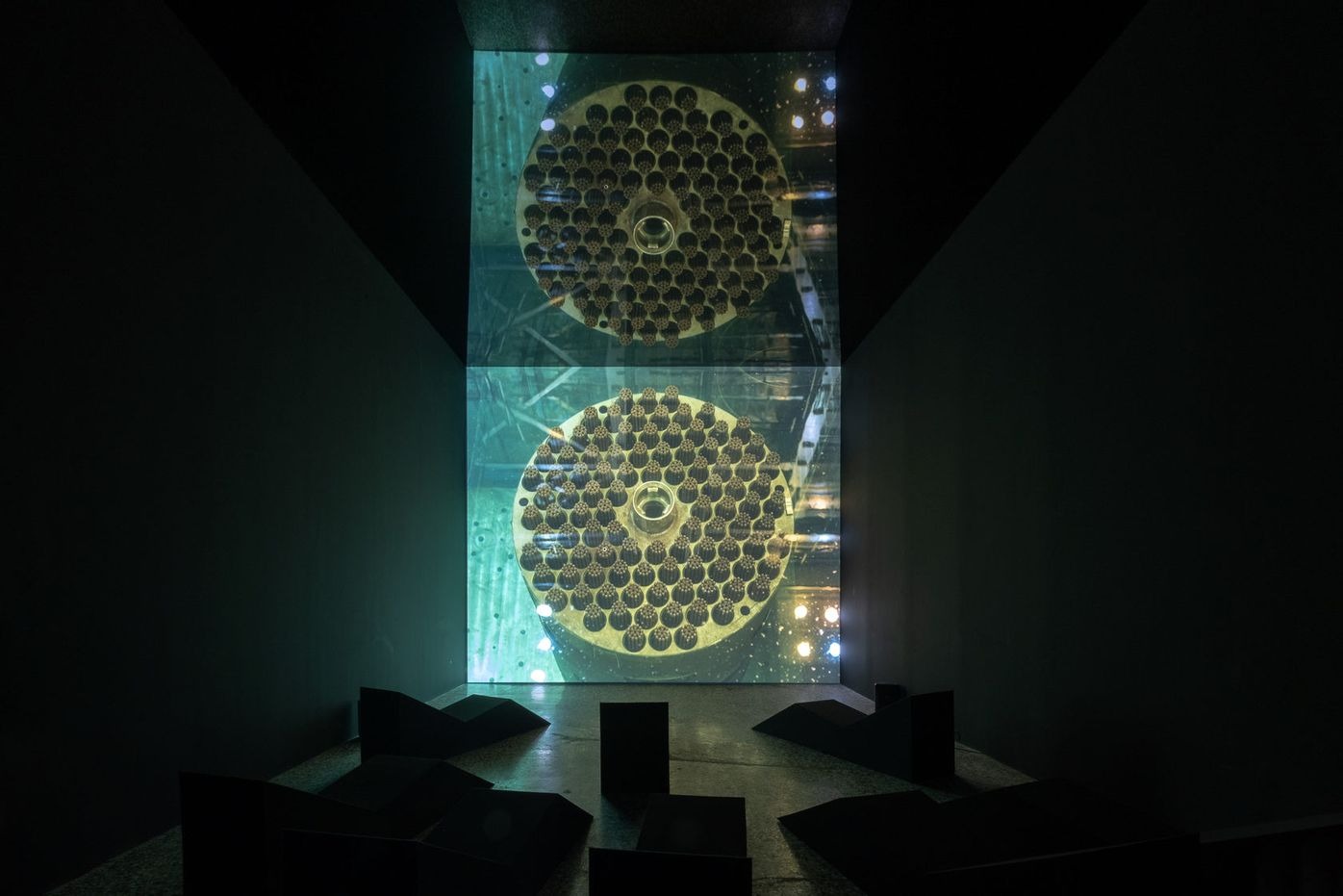 Škarnulytė, performing as a siren herself, links the past and future by exploring the memoryof Etruscan cemeteries, a nuclear power plant in Lithuania – twin sister of the ChernobylAES –, the Super-Kamiokande neutrino observatory in Japan, the Antimatter Factory, the Large Hadron Collider at CERN, Duga radar and a Cold-War submarine base above the Arctic Circle. t1/2 encounters all that is larger than us and larger than life – a looming climate catastrophe, natural phenomena, ideological constructions, massive scientific structures, recent geopolitical processes and what we know as human knowledge. All have left scars on planet Earth.