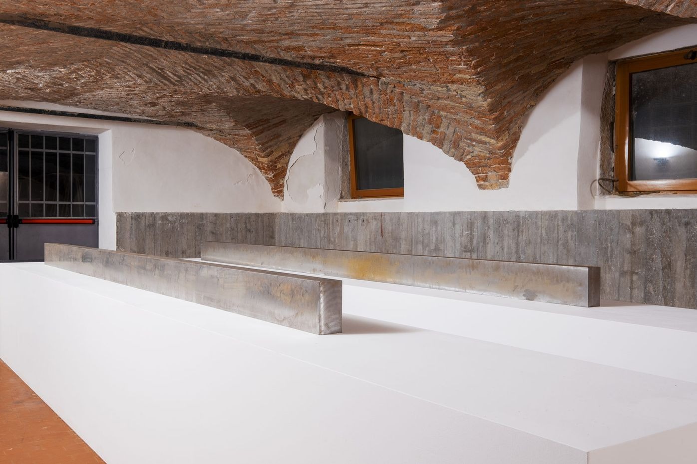 Daniel Turner works primarily in sculpture involving the manipulation of materials, objects and environments into tactile or atmospheric forms. His works are characterized by a specific response to a site under a controlled set of processes. For Turner, form is a process of transformation. His choice of materials speaks to familiar, yet constrained environments, preserving a sensory link to geographical locations, cultural associations and human contact. Founded in 1897, The Vinnitsa Regional Psychoneurological Hospital in Vinnitsa, Ukraine, is an active medical and prophylactic institution specializing in polyclinic medical care for psychiatry, neurology and neurosurgery. For the exhibition, Turner has produced two sculptures in response to this institution: through a calibrated processing of environment, the artist has identified, archived and recast one metric ton of the hospital’s steel bedding into two concentrated forms.