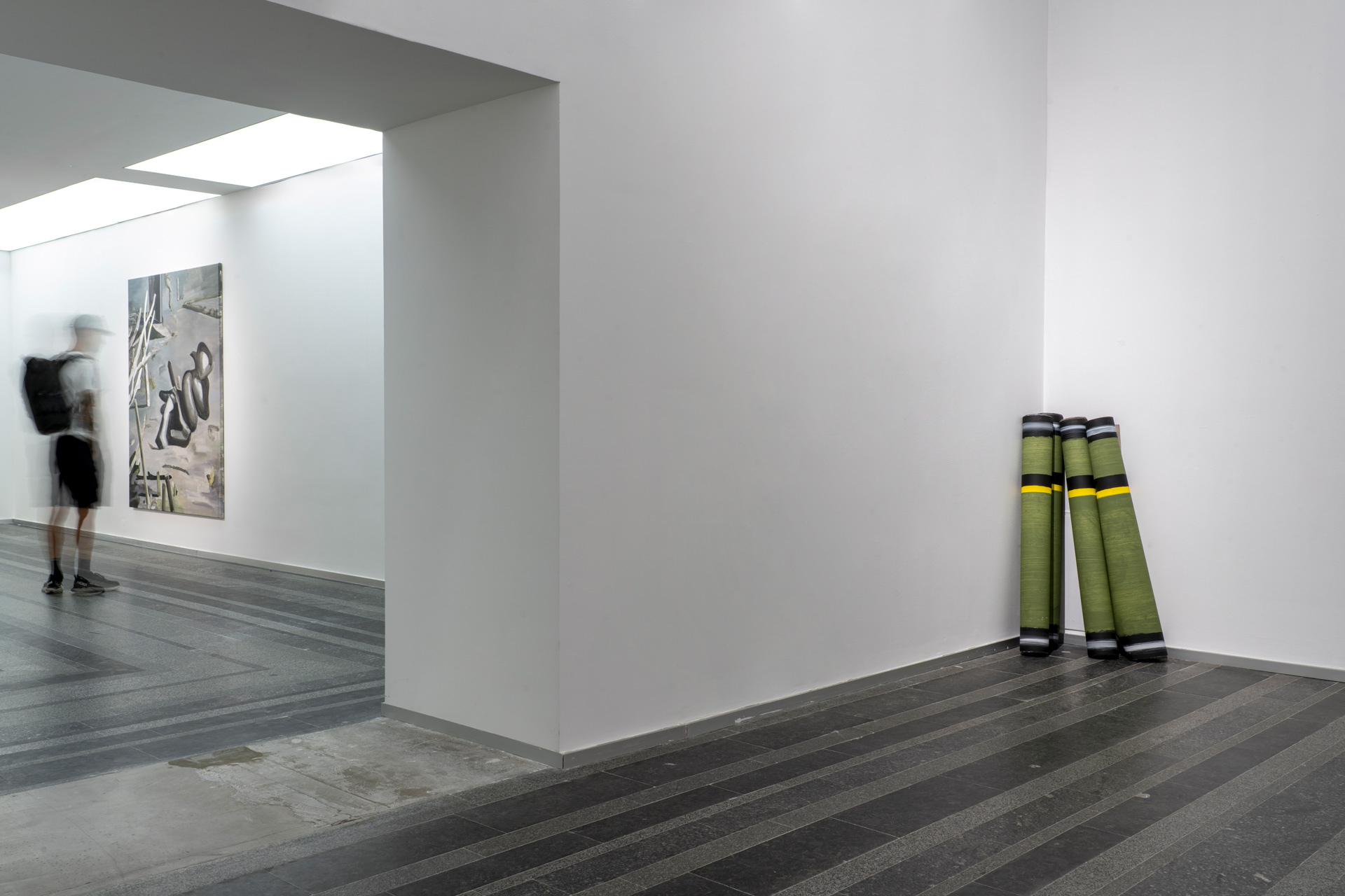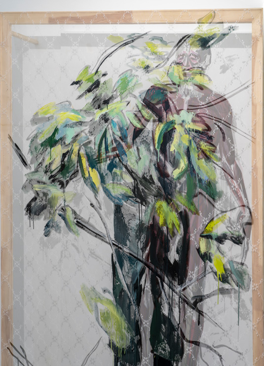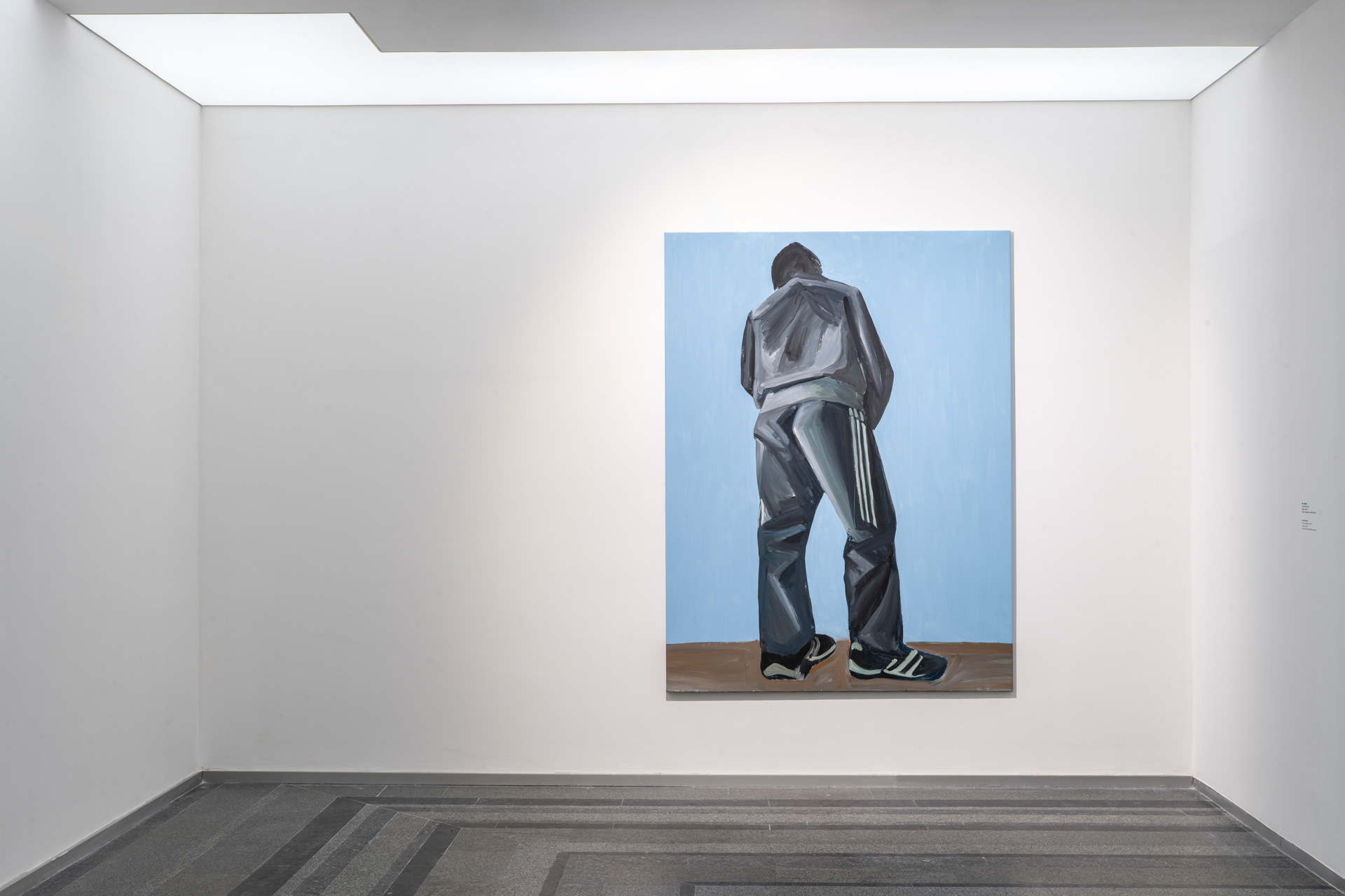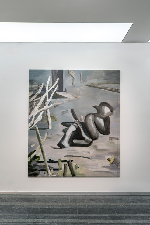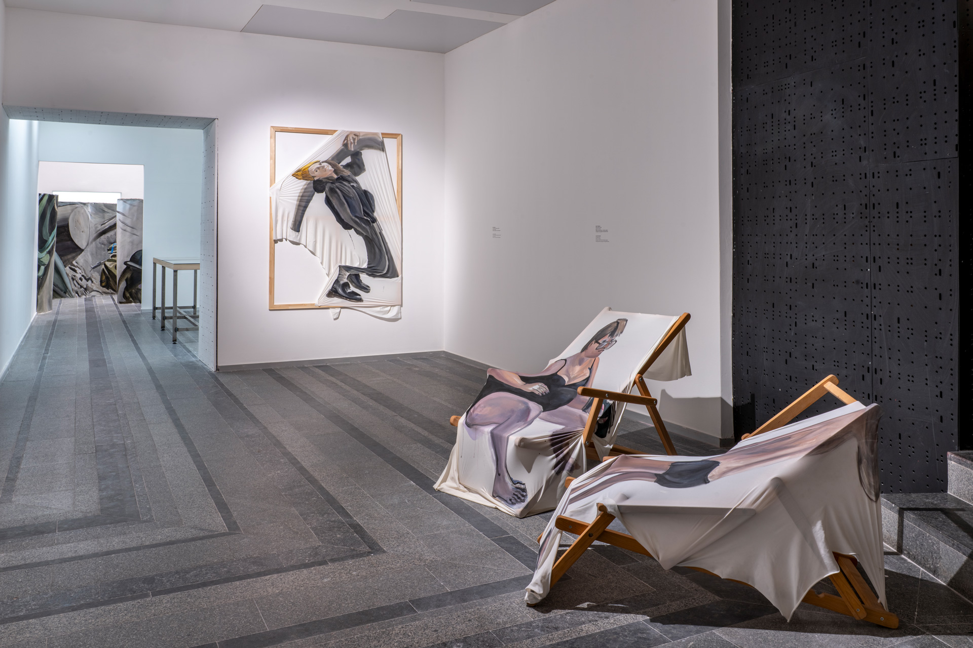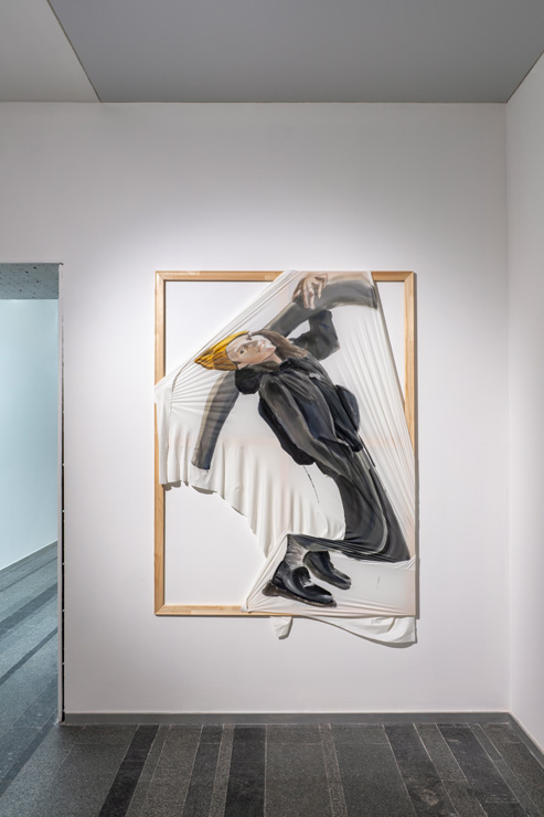 The artist uses elastic fabric as a canvas, and by stretching it onto a stretcher, she deforms the image. Thus, the distorted self-portrait embodies an identity that changes with relocation and constant movement. Simultaneously, Khomenko treats her own image with irony. Continuing her work with fabric, she shows how the medium of painting transforms the human figure. Thus, her figure underwent change yet became flexible due to the constant need to adapt.
