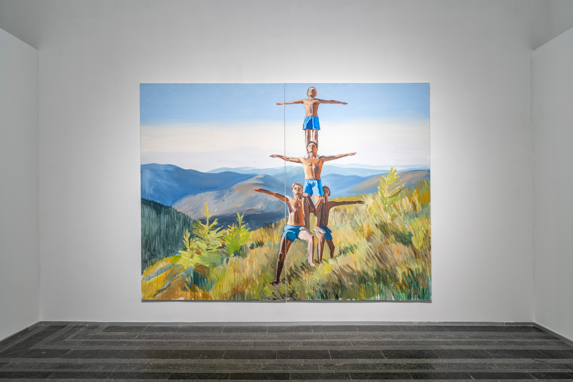 By depicting acrobats whose bodies are assembled into a single composition, Khomenko refers to the Soviet past, where athletic exercises and competitions were part of ideological education. The landscape of the Carpathians, where the athletes are placed, embodies harmony, but at the same time is a centre of chaotic privatization and construction. Thus, Wonderland outlines the political and ideological uncertainty that Ukraine faced for a long time: torn between its decaying Soviet heritage and chaotic capitalist rule.