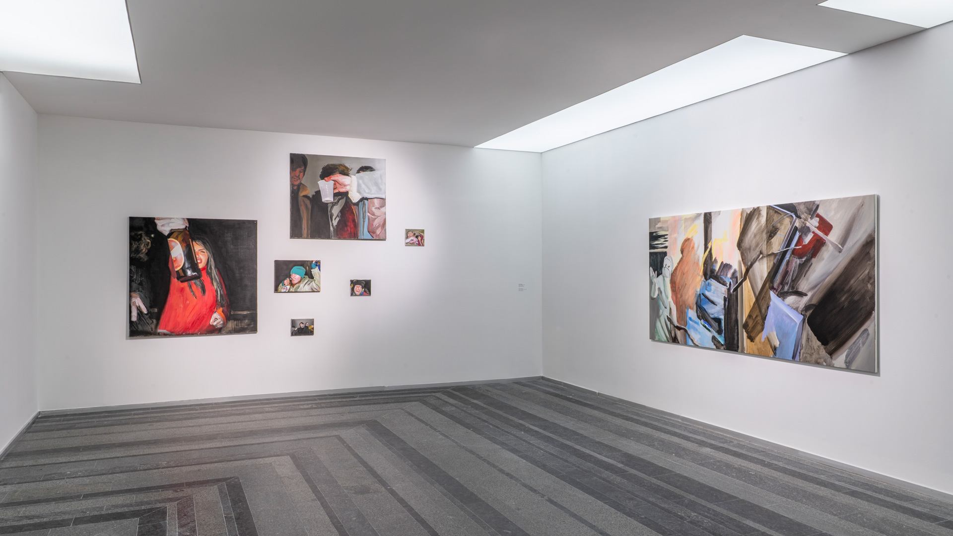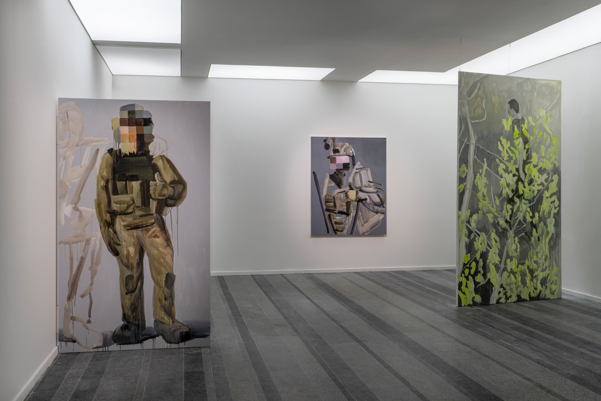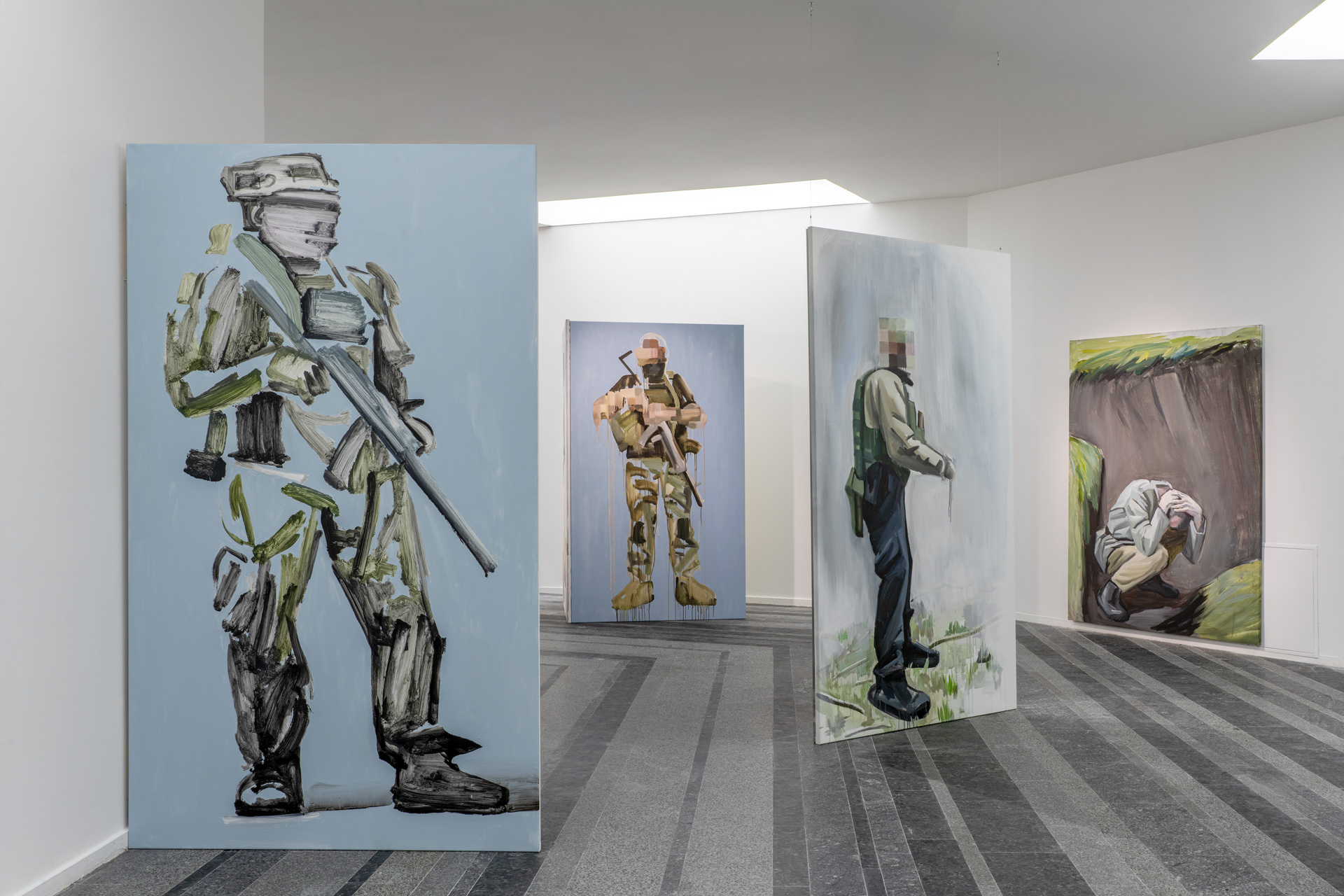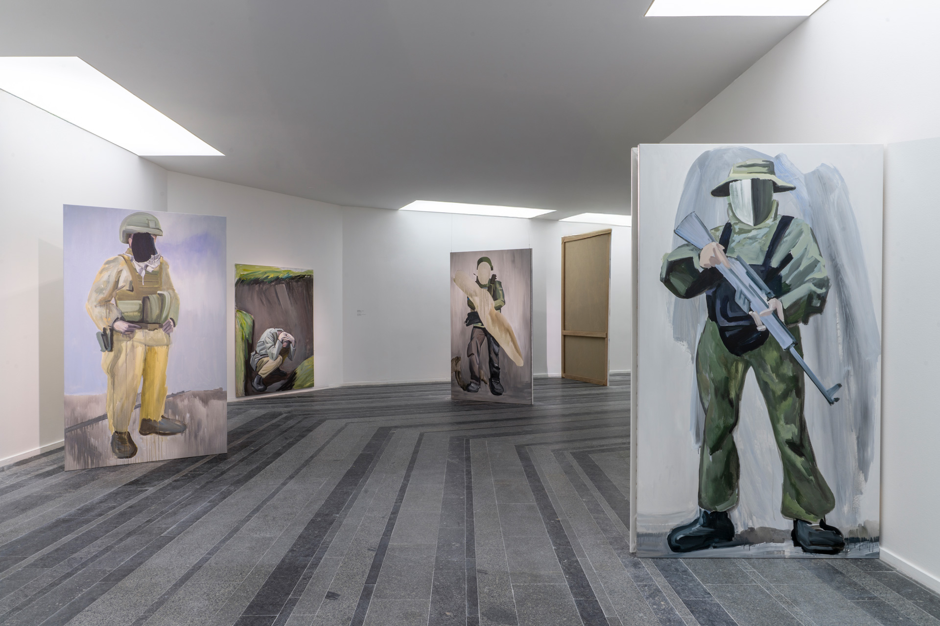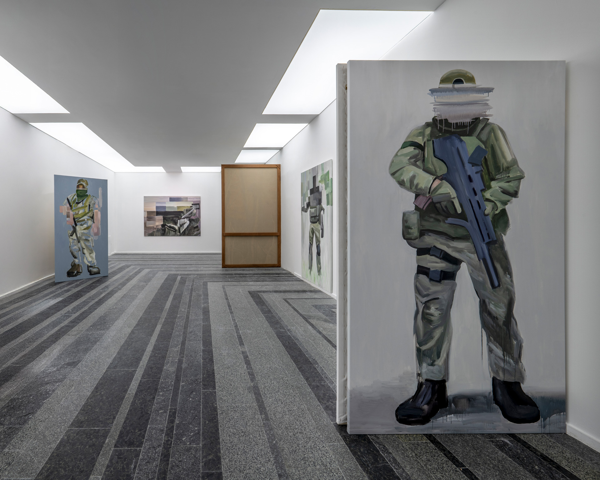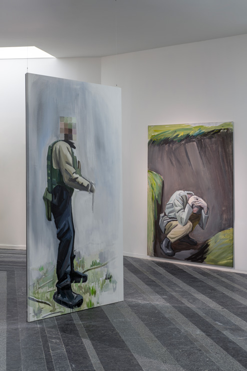 The paintings from the Unidentified Figures series (2022–ongoing) reproduce pictures taken by military servants. They usually pixelate and blur images to hide any identifying information from the enemy. The paintings reflect how the image of the soldier becomes abstract and the real person behind it becomes uncertain. The final work in the room, A Moment of Shot (2023), reproduces a frame from the video capturing the moment a shot is fired. The static and figurative image dissipates and the image of the soldier and wartime reality shatters into pieces that become increasingly difficult to put together.