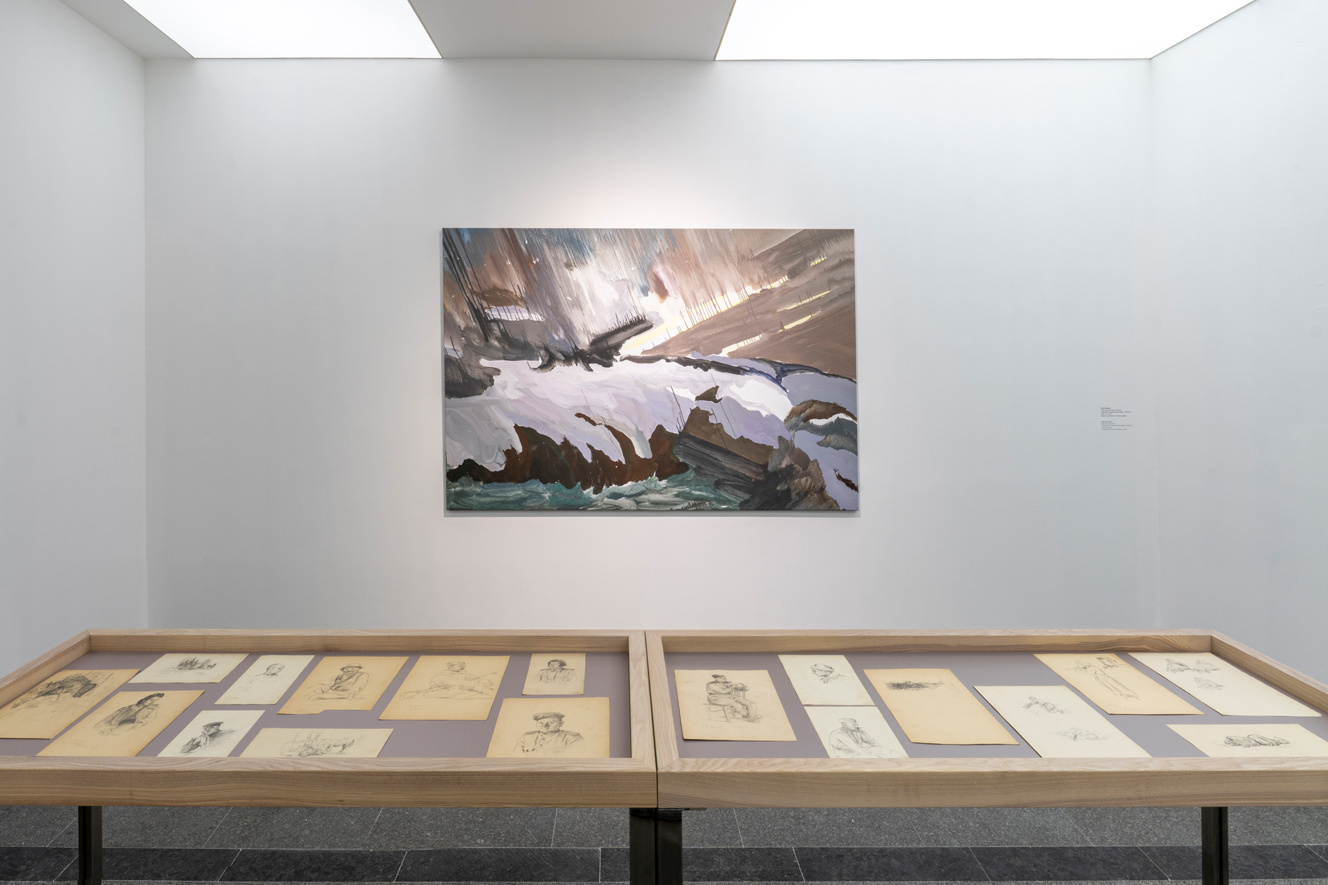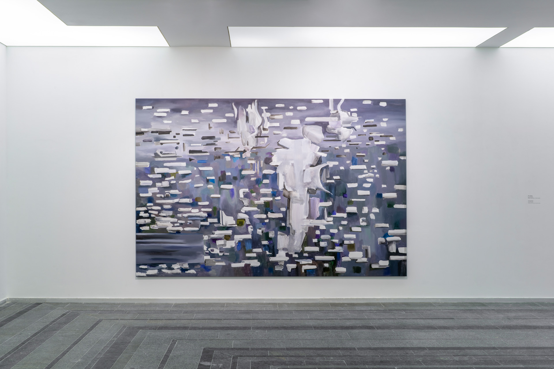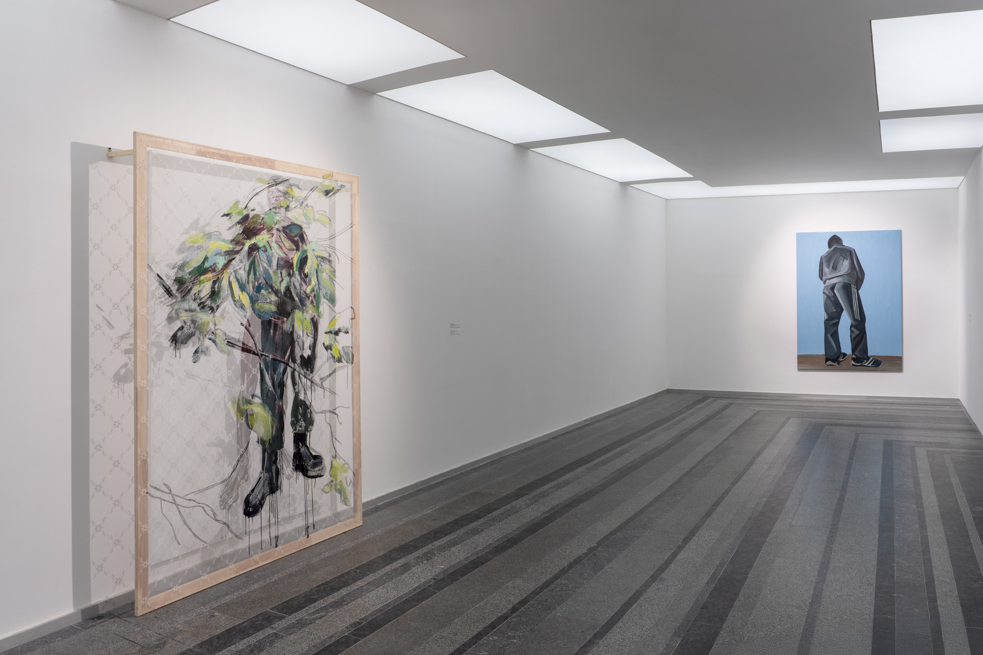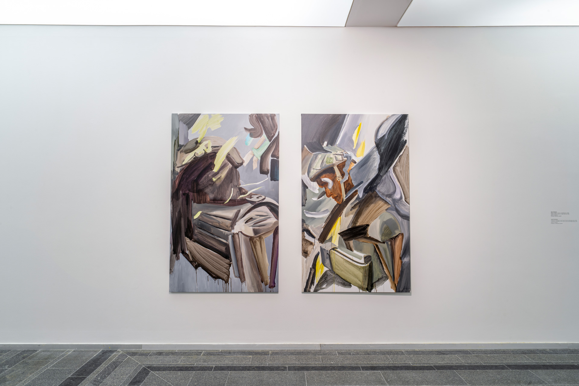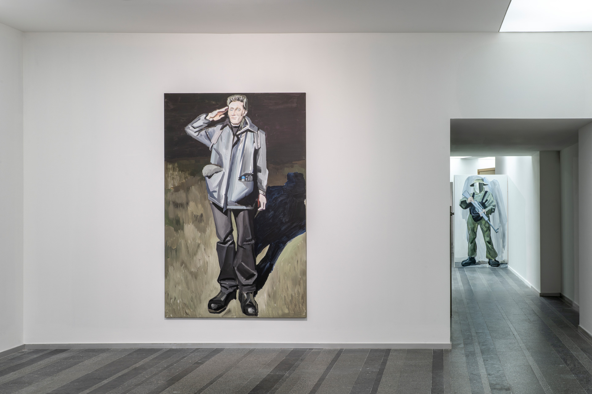 The paintings from the Unidentified Figures series (2022–ongoing) reproduce pictures taken by military servants. They usually pixelate and blur images to hide any identifying information from the enemy. The paintings reflect how the image of the soldier becomes abstract and the real person behind it becomes uncertain. The final work in the room, A Moment of Shot (2023), reproduces a frame from the video capturing the moment a shot is fired. The static and figurative image dissipates and the image of the soldier and wartime reality shatters into pieces that become increasingly difficult to put together.