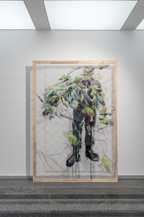 Khomenko has consistently represented soldiers in her work since 2009. In the Perspektyvna series (2021), military figures are hidden behind branches and depicted at a specific angle. The artist portrays soldiers whom she saw every day from the windows of her workshop, located next to a military unit. The painting reflects the artist’s own perspective — but also that of society, as if spying on the soldier.
