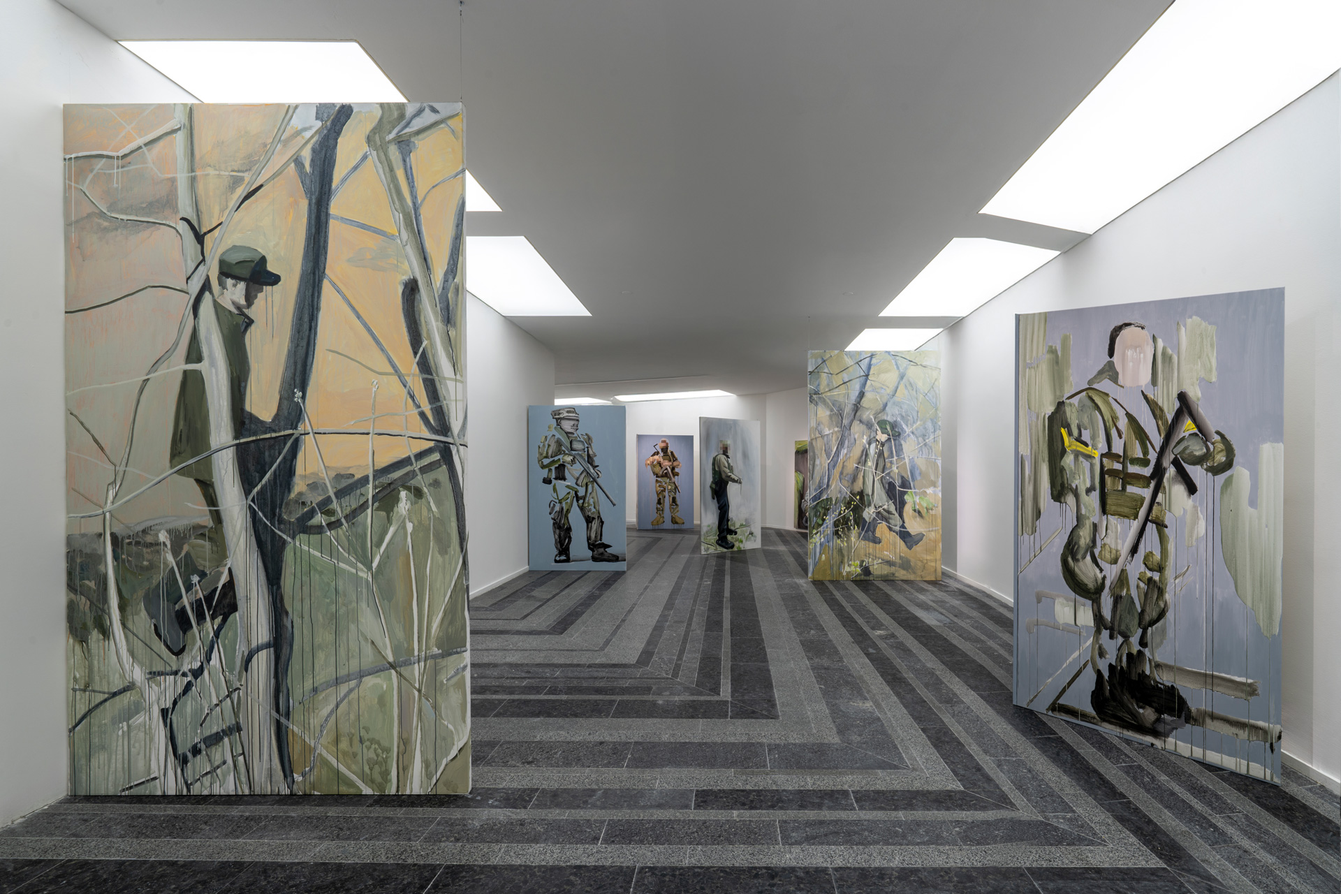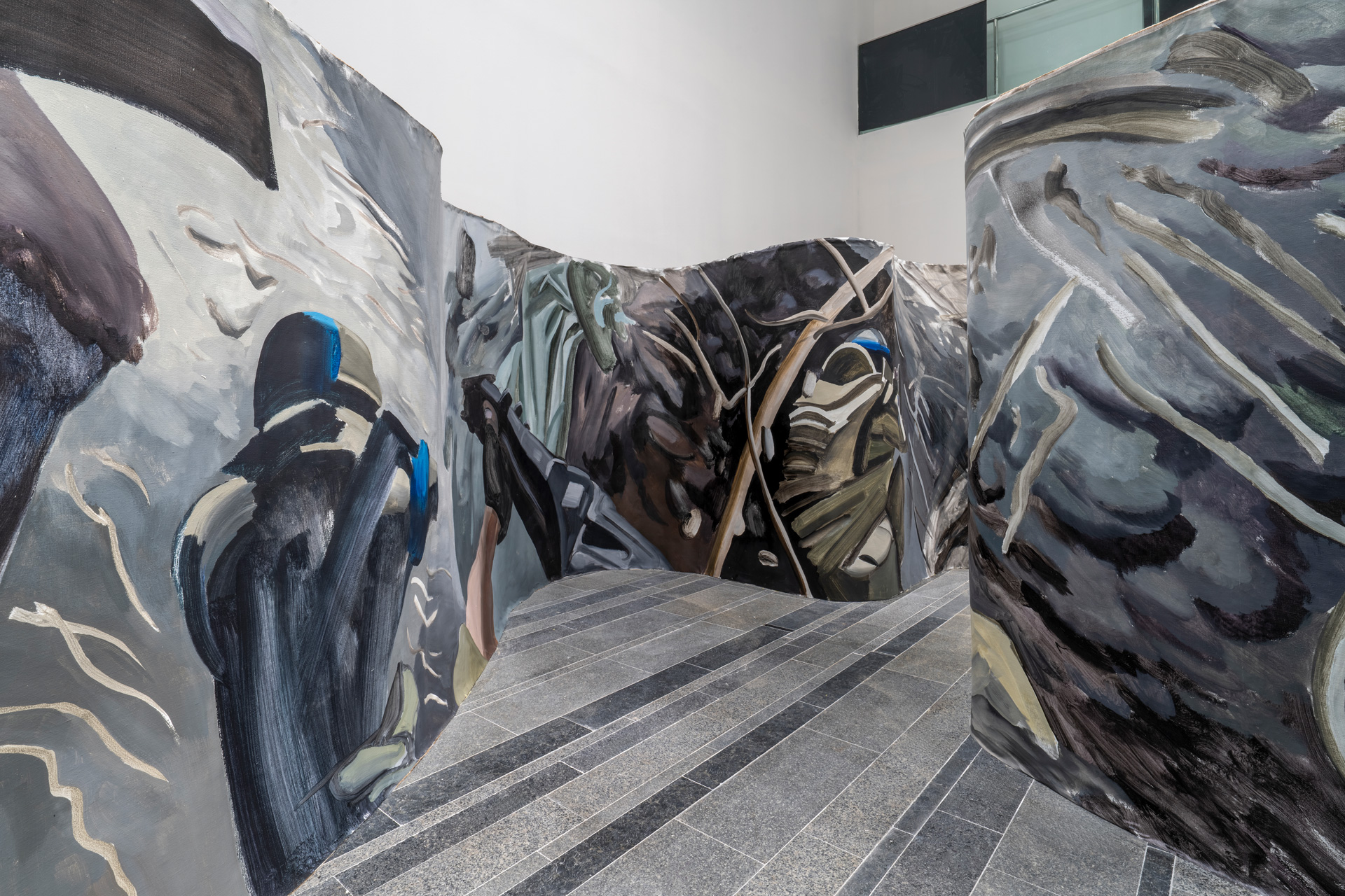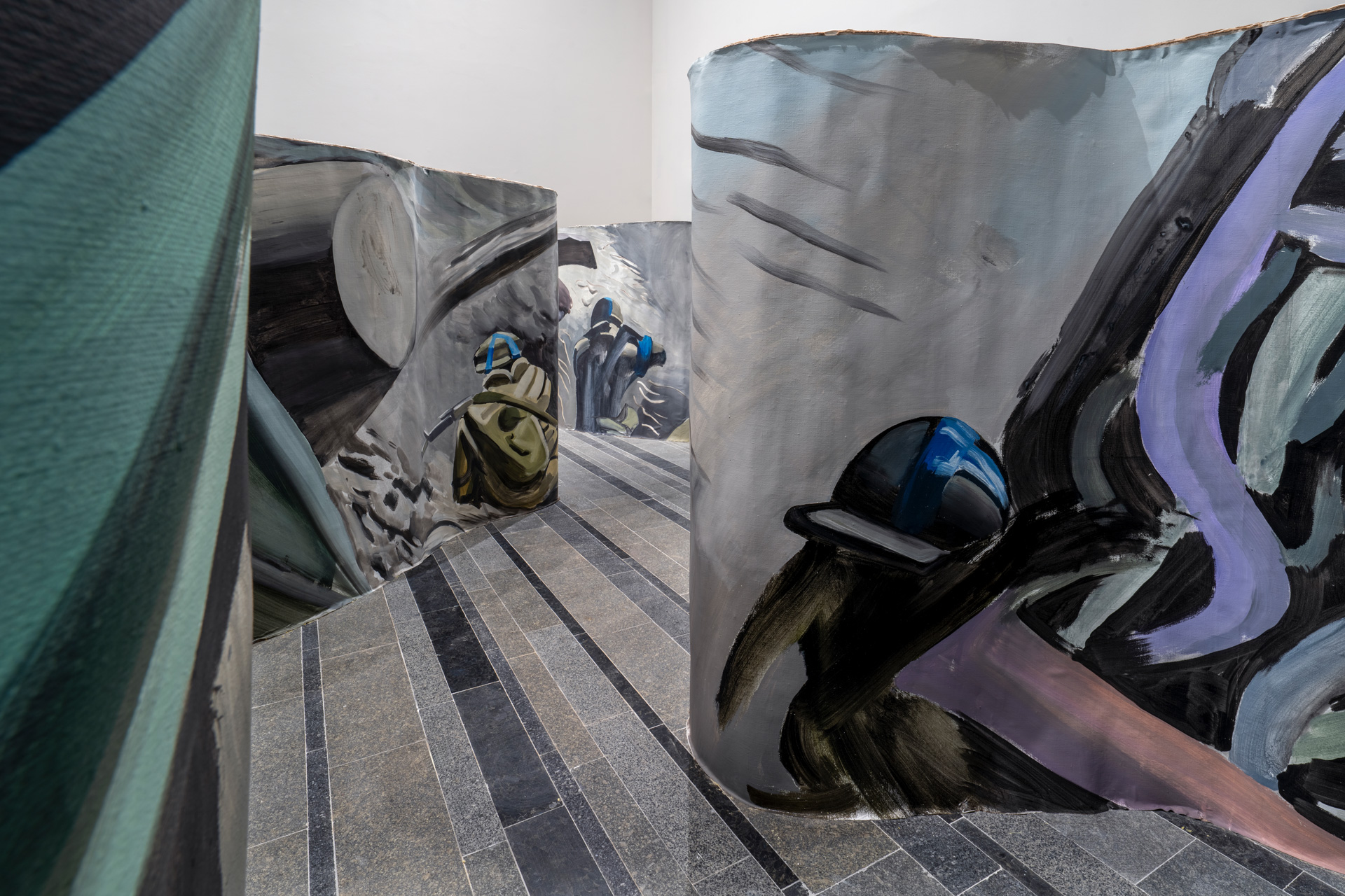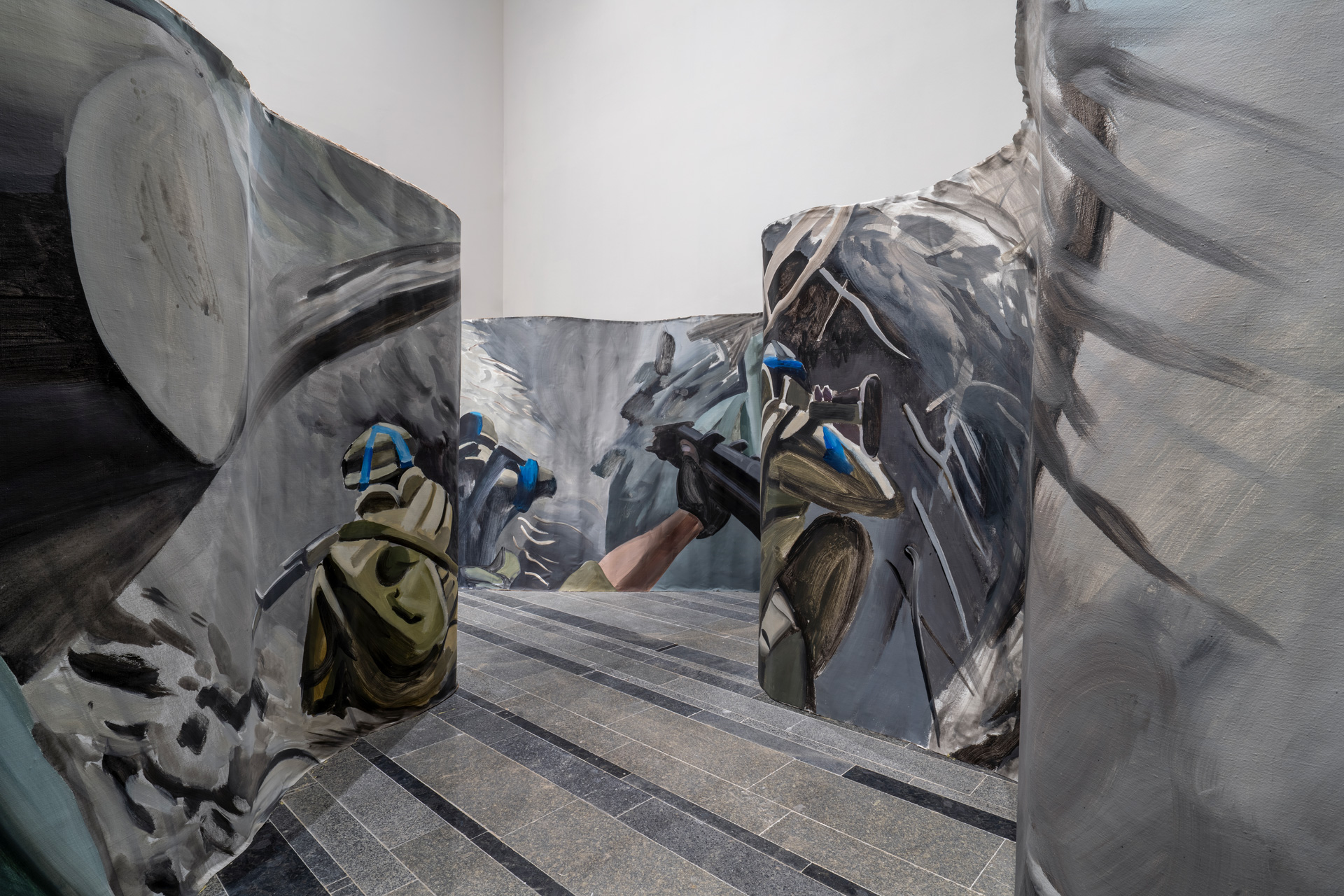 Continuing her exploration of the pictorial medium, the artist worked with a restorer to transform the canvases into an immersive structure. The design of the ‘trenches’ is based on videos from drones and soldiers’ body cameras. This form of documentation shapes our modern image of war, and is reflected in the work as it offers a comparison of two perspectives: a body camera, as close as possible to the person participating in the events, and the mechanistic, all-encompassing vision of a drone.