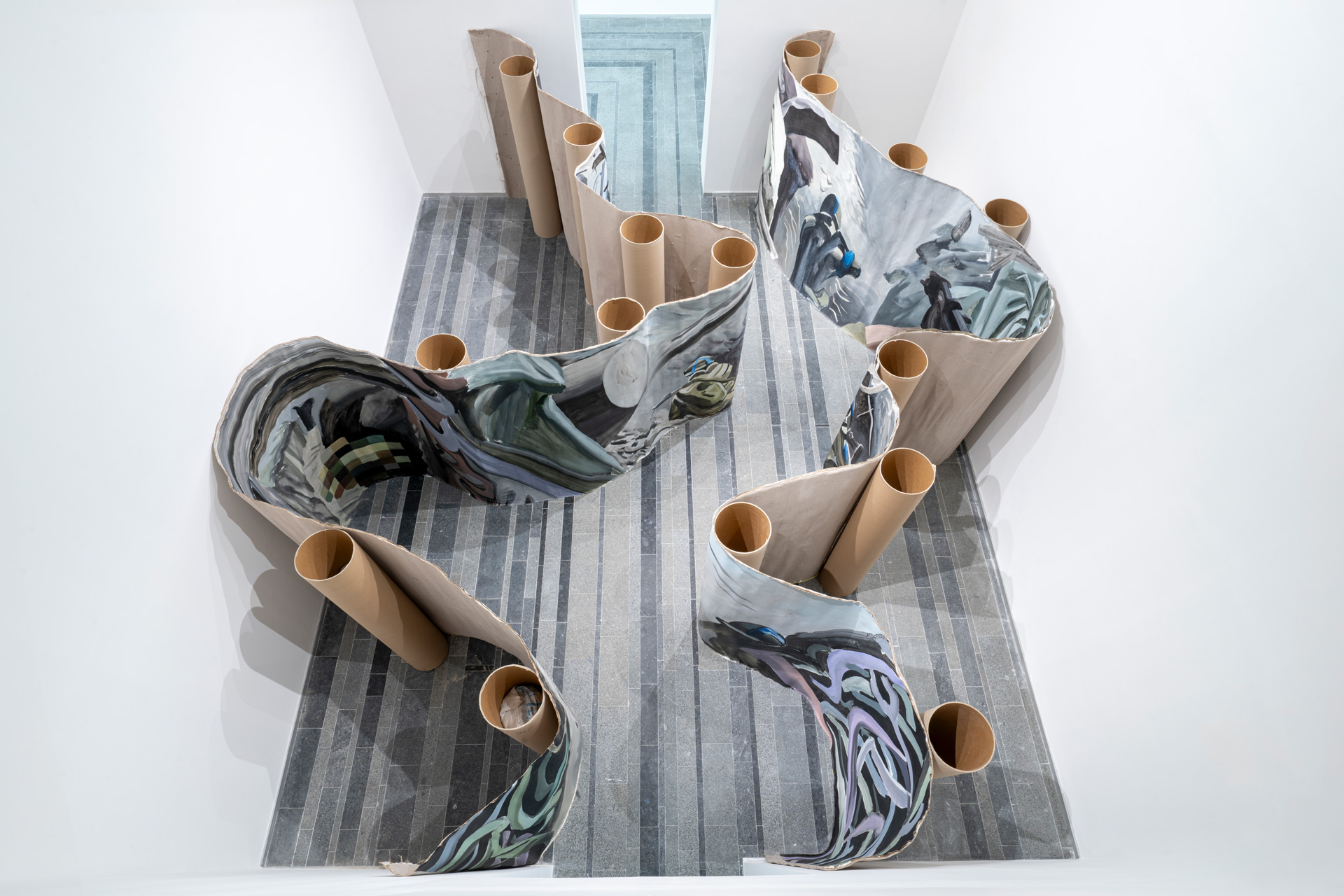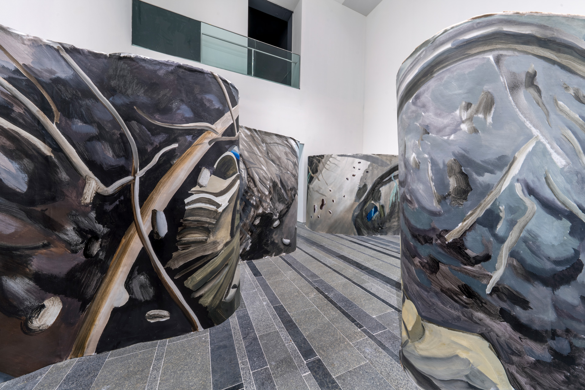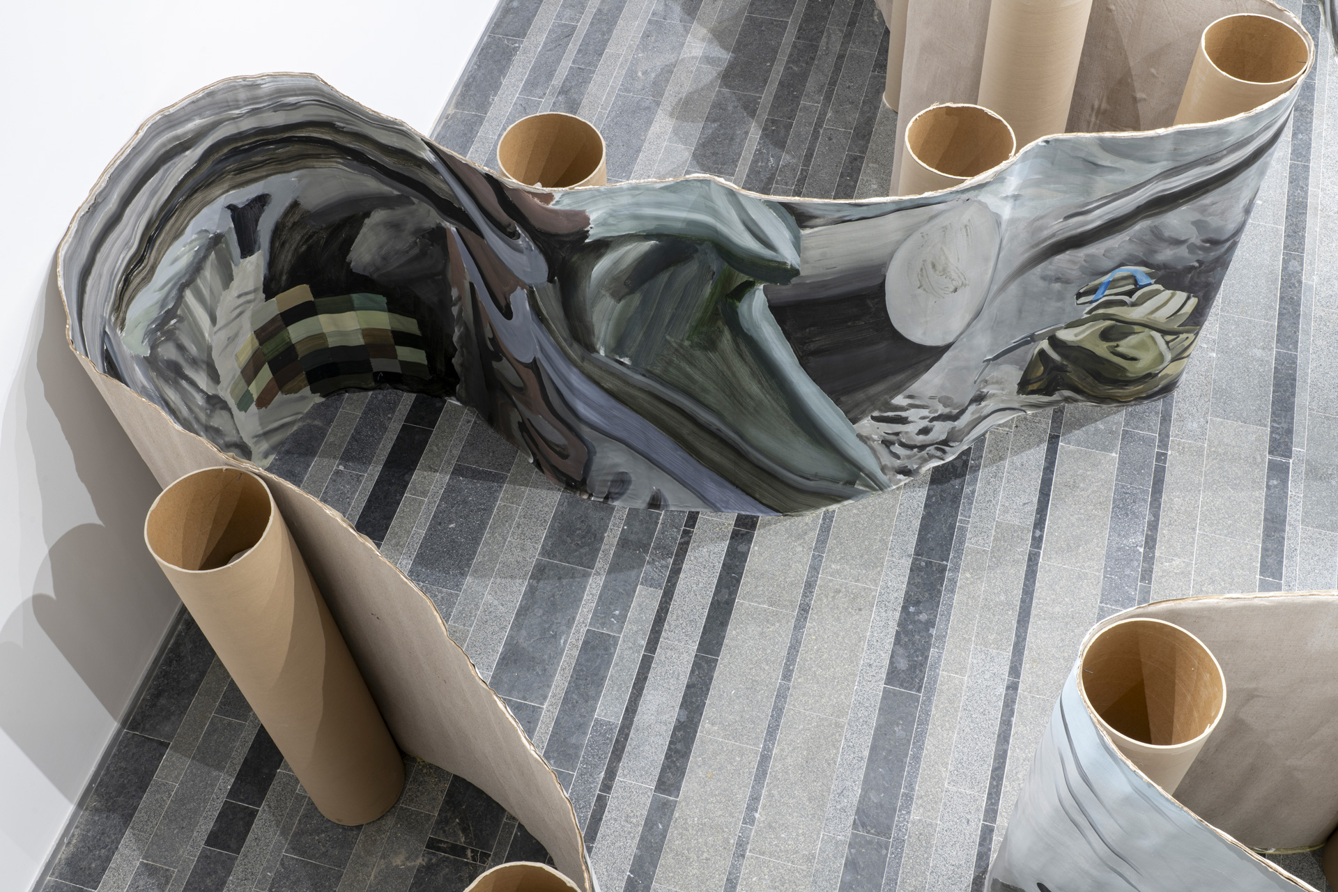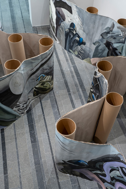 Continuing her exploration of the pictorial medium, the artist worked with a restorer to transform the canvases into an immersive structure. The design of the ‘trenches’ is based on videos from drones and soldiers’ body cameras. This form of documentation shapes our modern image of war, and is reflected in the work as it offers a comparison of two perspectives: a body camera, as close as possible to the person participating in the events, and the mechanistic, all-encompassing vision of a drone.