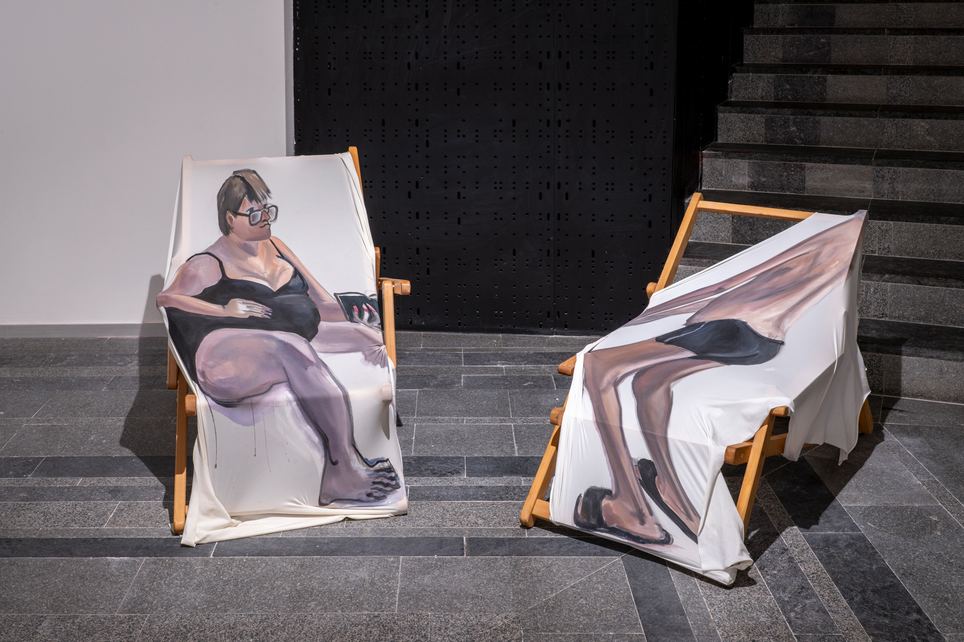 In the works from the Several Stories and Objects series (2020), Khomenko spies on random Ukrainians and acquaintances on holiday in Turkey, listening to their conversations and disagreements with Russians around the occupation of Crimea. The artist paints portraits based on covertly photographs and stretches the canvases on deck chairs. The work embodies the deformation of the image and the story alongside the usual course of life and leisure of people who lived or spent their holidays in Crimea. A carefree pastime became impossible, with the war sparking disputes on occupation, the search for identity, the experience of leaving home, and the need to narrate it.