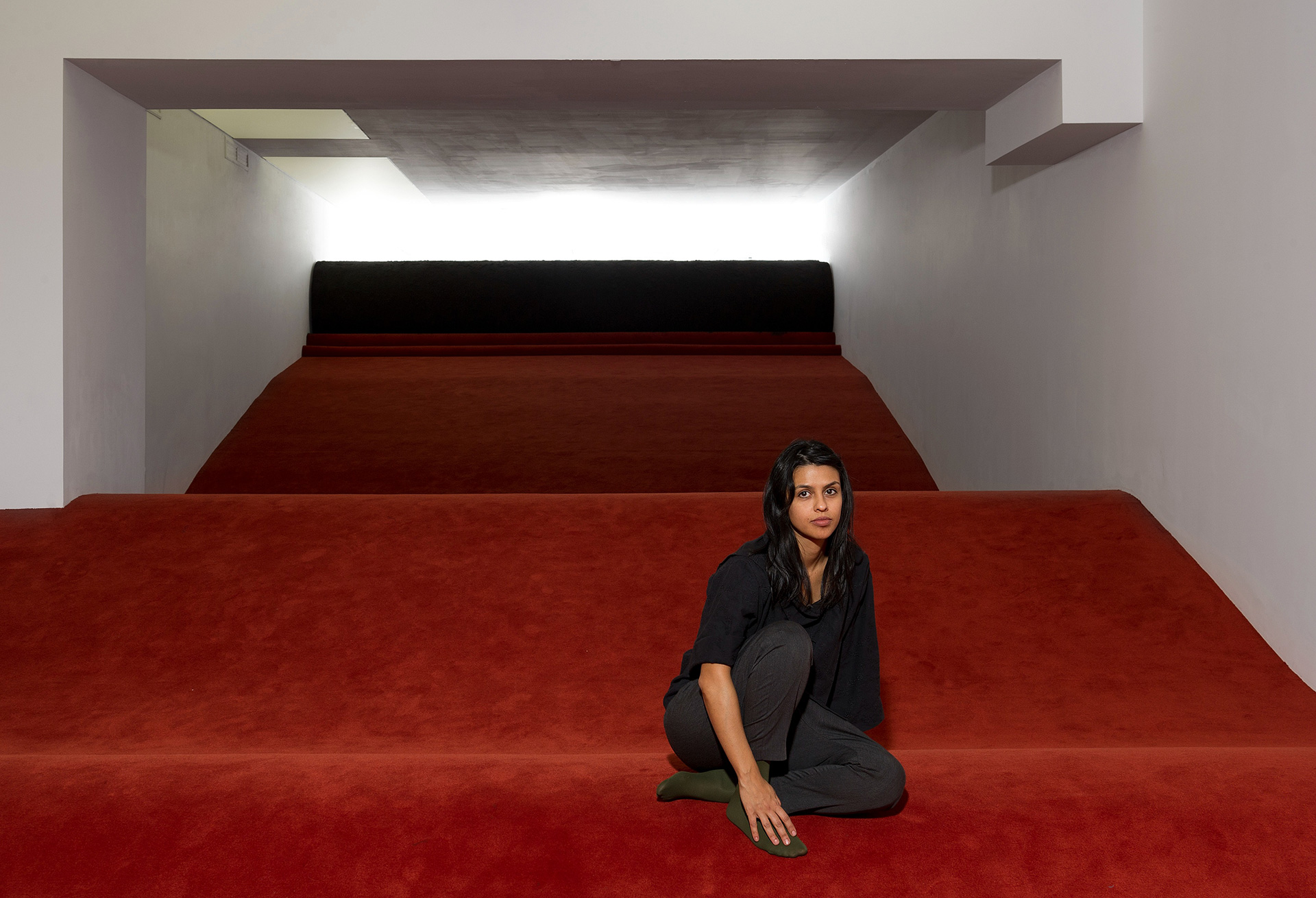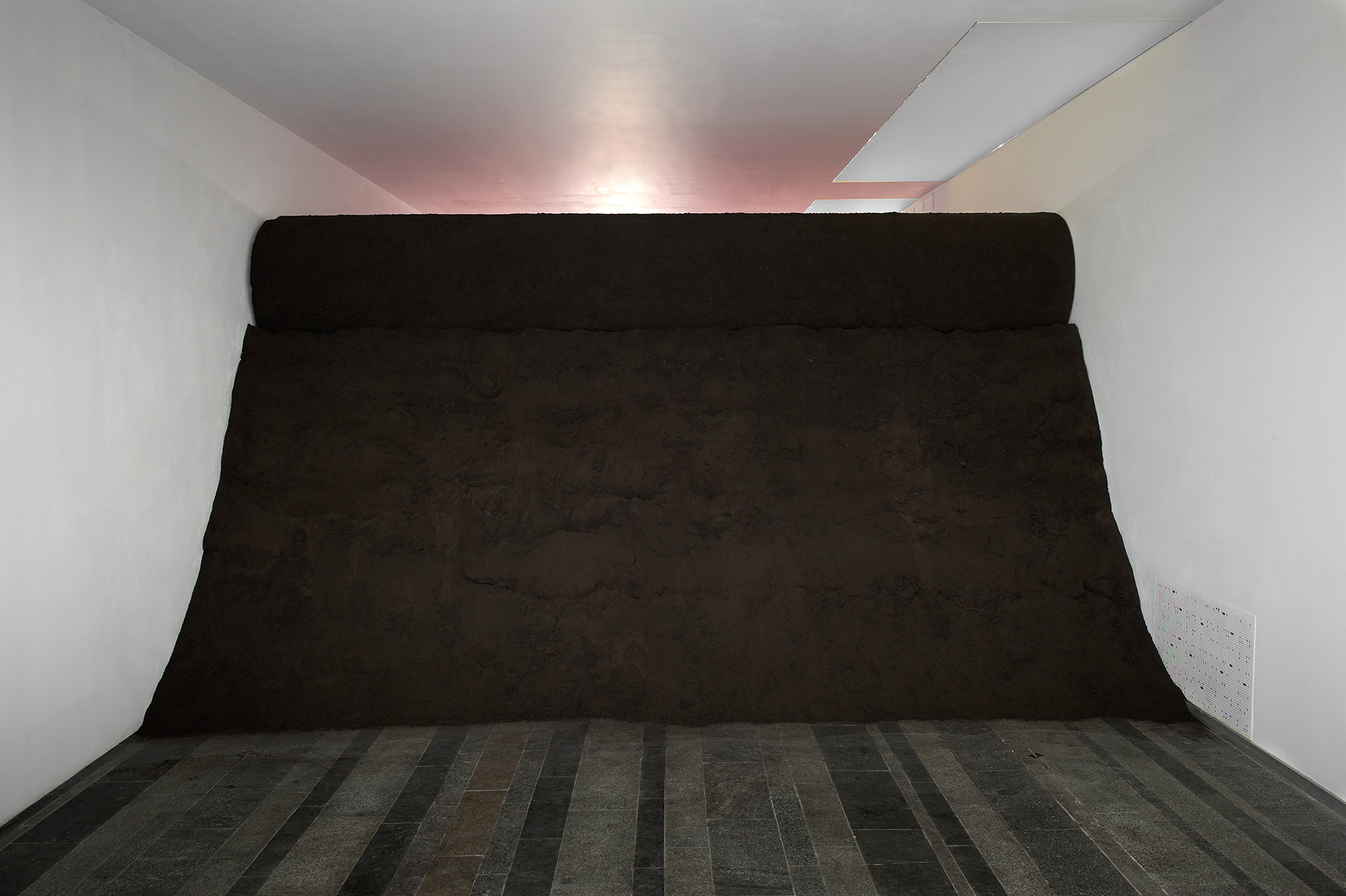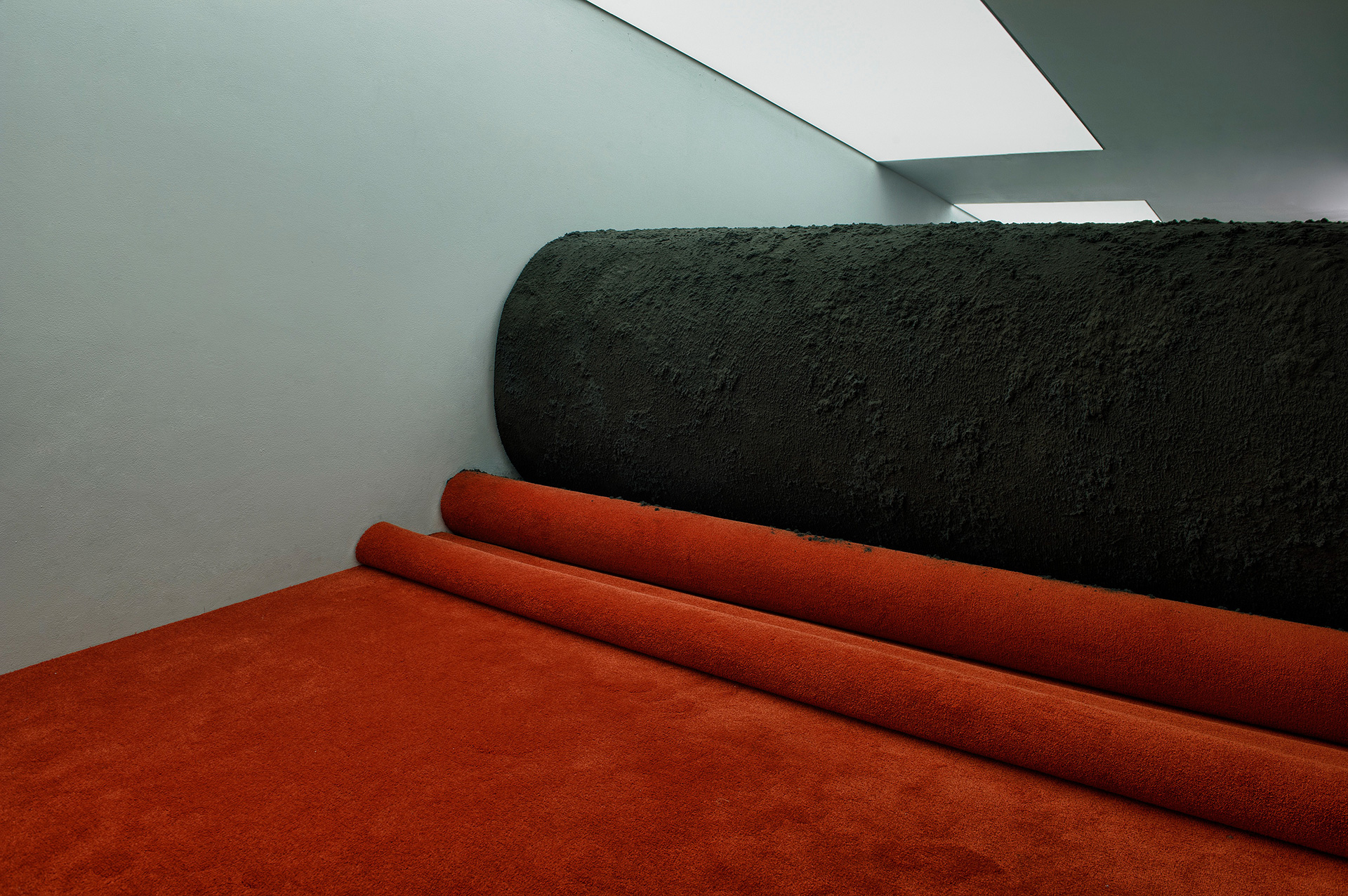 The monumental installation See to be seen has beencreated with the support of PinchukArtCentre. Marcelle developed in this installation a carpet that covers a hidden landscape of dust. This new work is a topological research conducted by an appropriation of ordinary things and industrial materials. The work starts from the simple gesture: hiding the dust under the carpet. It serves as a metaphor for hiding our mistakes, our dirt from the eye. Marcelle’s landscape is a reflection on the continuous historical repetition of this gesture and represents centuries of dust hidden under the carpet.