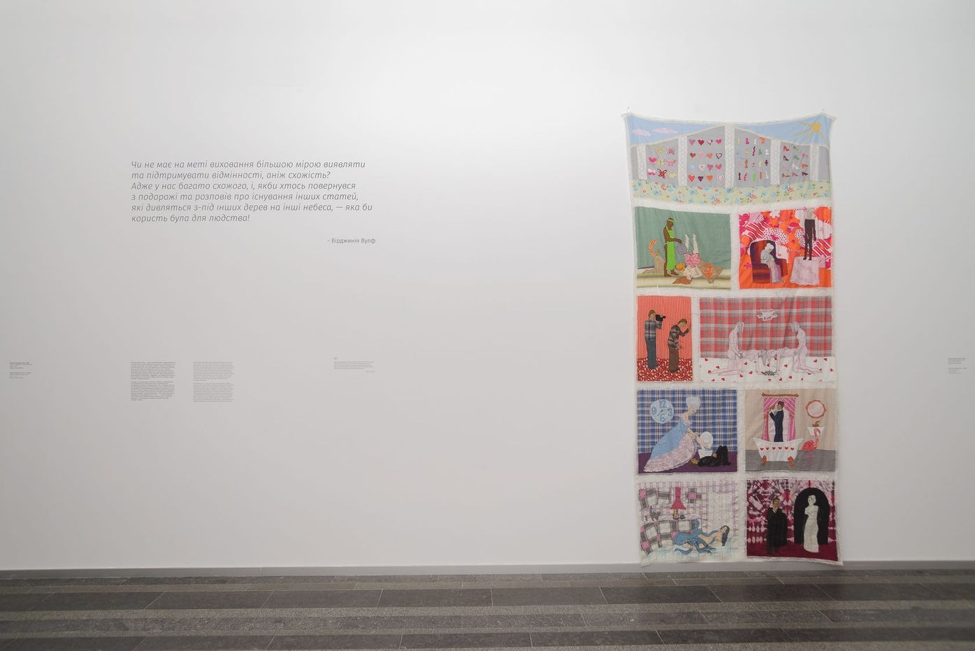 Апелюючи до стереотипів про «жіночу» творчість, що склалися історично і зводяться до таких мистецьких практик як плетіння, вишивка, ткацтво тощо, ця зала конструює інтимний прихований простір, у якому переплітаються медіа, покоління, контексти. Тут створено атмосферу домашнього затишку, за збереження й утримання якого традиційно відповідала жінка. Серед іншого в залі представлено роботи Катерини Білокур і Марії Примаченко — художниць, чиє творче формування відбувалося в умовах суворого патріархального суспільства за відсутності «своєї кімнати». Це не дозволило їм реалізуватися як професійним художницям. «Пригнічене» творче і жіноче втілилося у створенні особливого образного світу, який населяють вигадані звірі, птахи і квіти. Ці наївні образи очікувані від жінки, а тому дозволені в чоловічому світі.