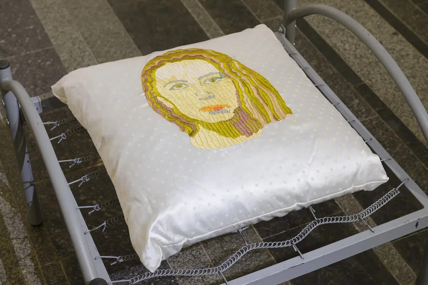 Однак металеве панцирне ліжко, на яке покладено подушку із зображенням самої художниці, породжує асоціації з казенними установами і викликає дискомфорт, що суперечить інтимності загальної атмосфери. Ця робота цілком оприявнює протиріччя 1990-х років, коли можливість творити багато в чому завдячувала спільноті друзів, яку становили переважно чоловіки. Часто виконуючи захисну функцію, вони водночас ставали перешкодою для творчої реалізації жінки-художниці в публічному полі.