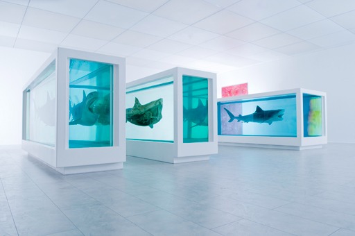 Пояснення смерті, 2007 та Заперечення смерті, 2008 .Скло, сталь, акула, акрил та розчин формальдегіду