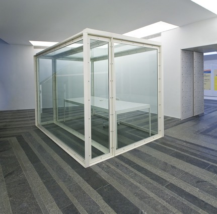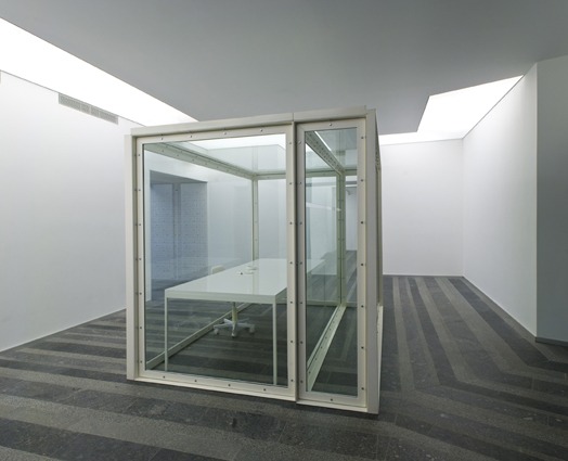 Набута нездатність до втечі, очищена, 2008. Скло, сталь, пластмаса, ДВП, офісний стілець, попільниця, сигарети і запальничка