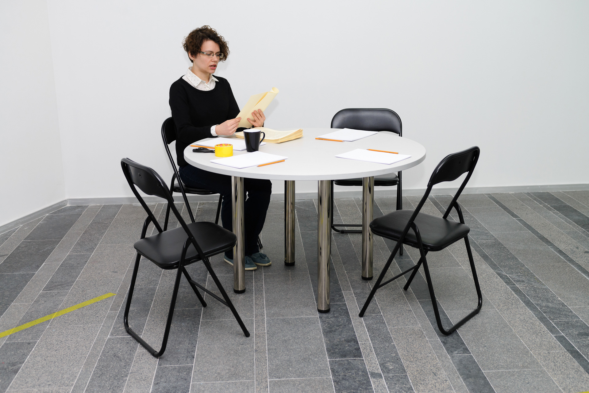 перформанс; кулер з водою, олівці, папір, перелік правил ігор економічної тематики, перформер, скотч, стіл, стільці, табличка, текст